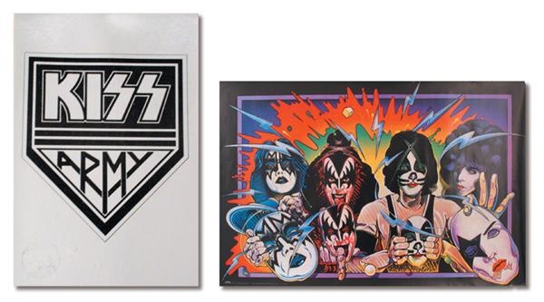A considerable cross-section of KISS memorabilia includes (11) 1980 Aucoin posters featuring cartoon artwork of KISS in full costume and make-up (VG-EX), Various ticket stubs and backstage passes (EX to NRMT), (19) full color cardboard advertising pieces - perforated for fold in middle to stand as display, (22) 8x10" glossy 1978 prints, approximately (40) Ace Frehley & Paul Stanley full color postcards (EX-MT), poster put-ons, iron-ons & more!