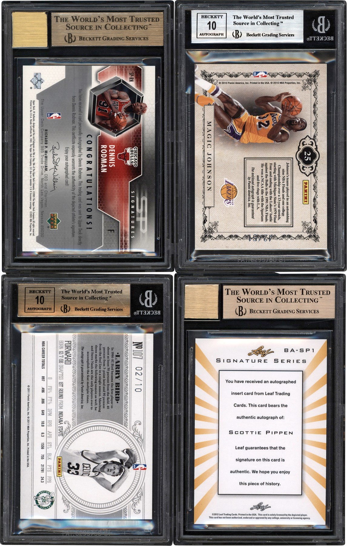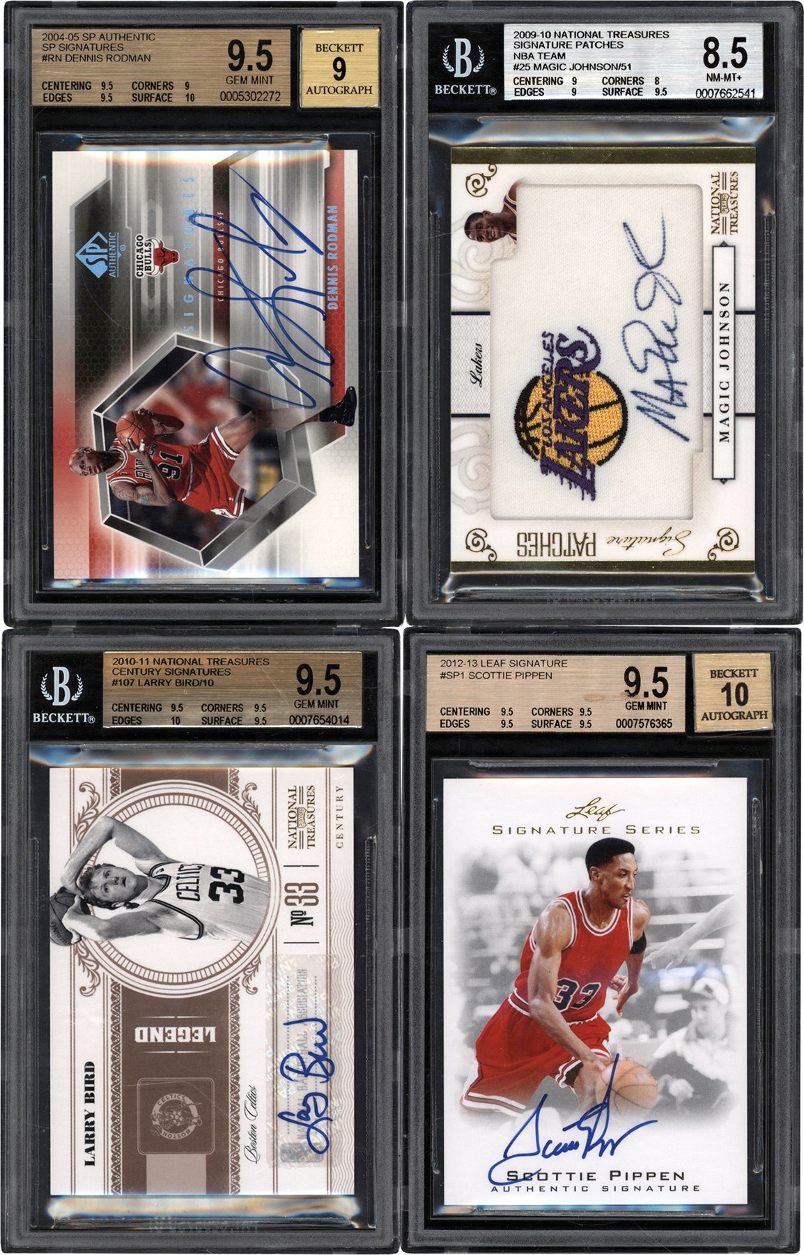 This lot features a collection of (4) NBA HOF Autograph cards. All (4) cards have been graded and encapsulated by BGS including: 2004-05 Upper Deck SP Authentic #RN Dennis Rodman SP Signatures BGS GEM MINT 9.5 AUTO 9; 2009-10 National Treasures #25 Magic Johnson Signature Patches NBA Team Auto #/51 BGS NM-MT+ 8.5 AUTO 10; 2010-11 National Treasures #107 Larry Bird Century Signatures #/10 BGS GEM MINT 9.5 AUTO 10; and 2012-13 Leaf Signature #SP1 Scottie Pippen Auto BGS GEM MINT 9.5 AUTO 10.