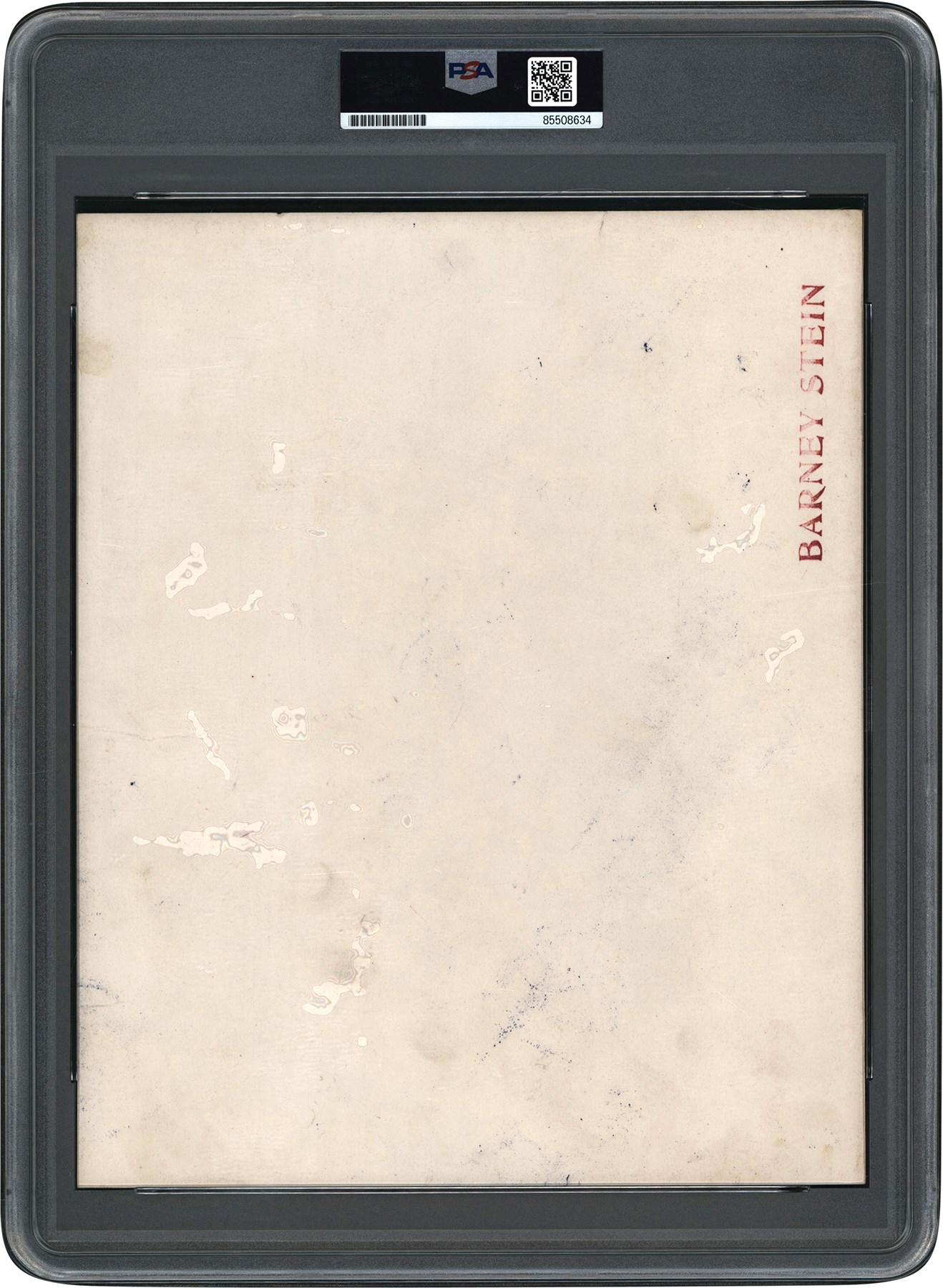 The '49 Brooklyn Dodgers won the NL pennant with a record of 97-57-2, and they lost the World Series in five games to the New York Yankees. Jackie Robinson, in his third major League season was the NL MVP, leading the league in batting (.342) and steals (37). The team was managed by Burt Shotton, pictured in civilian clothes in the middle of the first seated row. The Dodgers are wearing satin uniforms. The 8x10" black & white photo has a Barney Stein stamp on back.  The photo has small folds and areas where the surface has some crinkly areas. The offering comes with a PSA/DNA Certification (85508634).