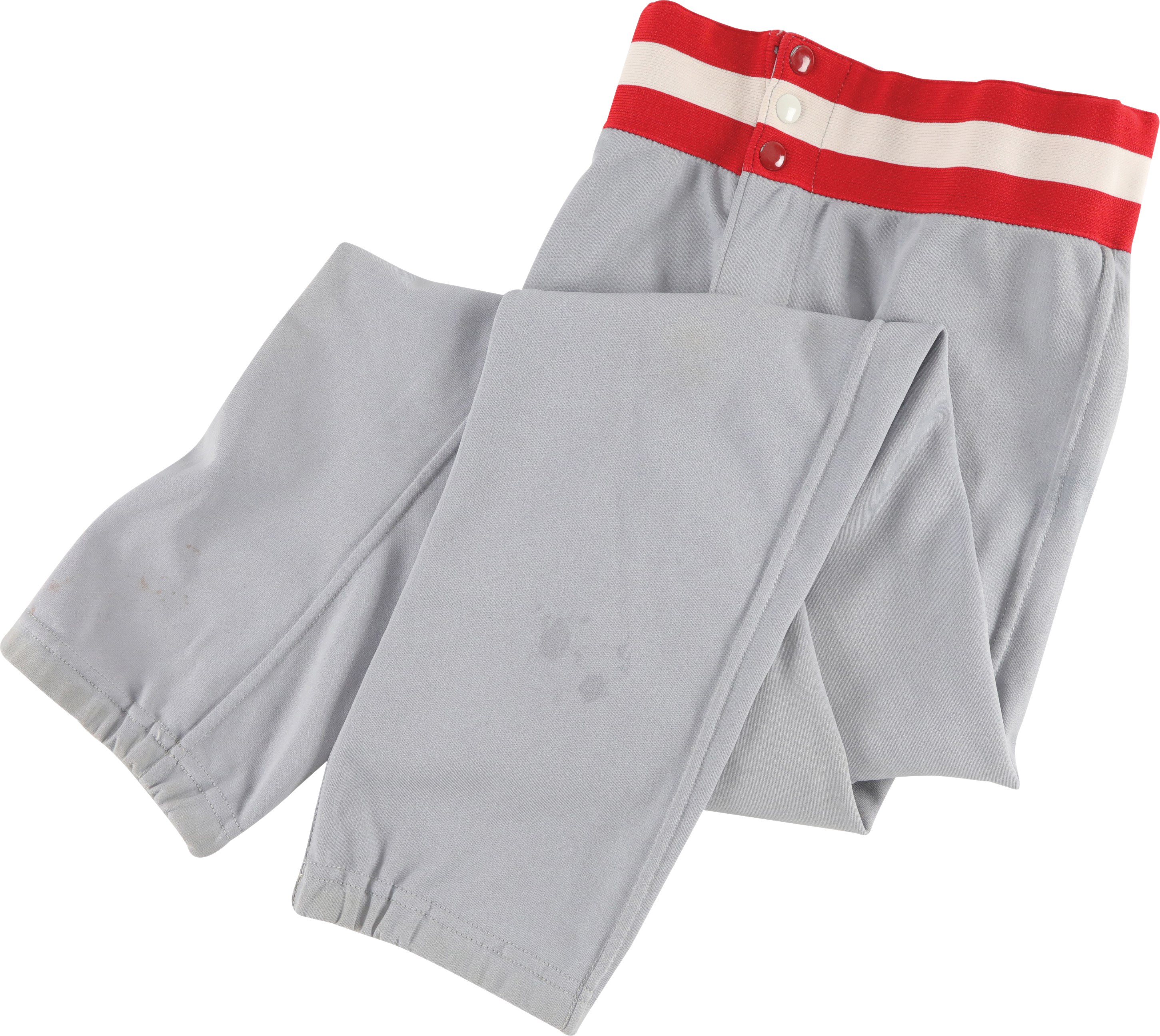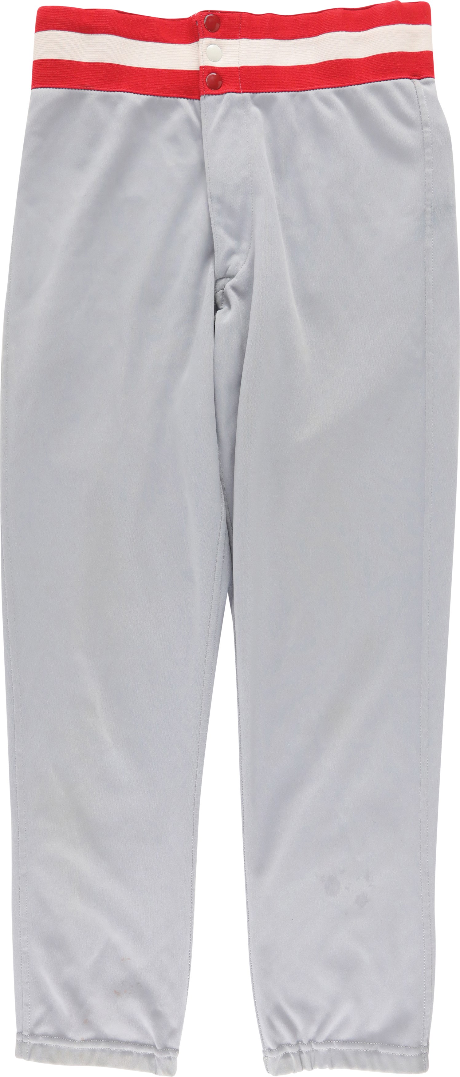 On September 11, 1985, Cincinnati Reds player/manager Pete Rose broke Ty Cobb’s longstanding MLB career hits record by stroking a single to left-center field in the first inning of a game against the Padres. The hit came off San Diego starter Eric Show. The date also just happened to be the 57th anniversary of Ty Cobb's last game in the majors. The '85 season would be Rose's second-to-last as a player. Offered here is a pair of game-used Cincinnati Reds gray (road) pants that Rose wore from that record-breaking season. The size 34 pants reflect heavy game use with team repairs on the backs of both legs from rips that no doubt occurred while Rose was sliding. During the '85 campaign, Rose registered 107 hits with 46 runs batted in and eight stolen bases while playing in 119 games. The proper red Rawlings manufacturer's tagging can be found inside on the rear waistband along with a strip tag that lists the player's number (14), length (34.5), inseam (28.5) and year (85). A flag indicating the "Set 1 1985" is attached to the strip tag. The right rear pocket has its single button intact, but the left pocket is missing its button. Rose played in just 72 games the following season before turning his full attention to managing starting in 1987. This is an incredibly historic pair of baseball pants.