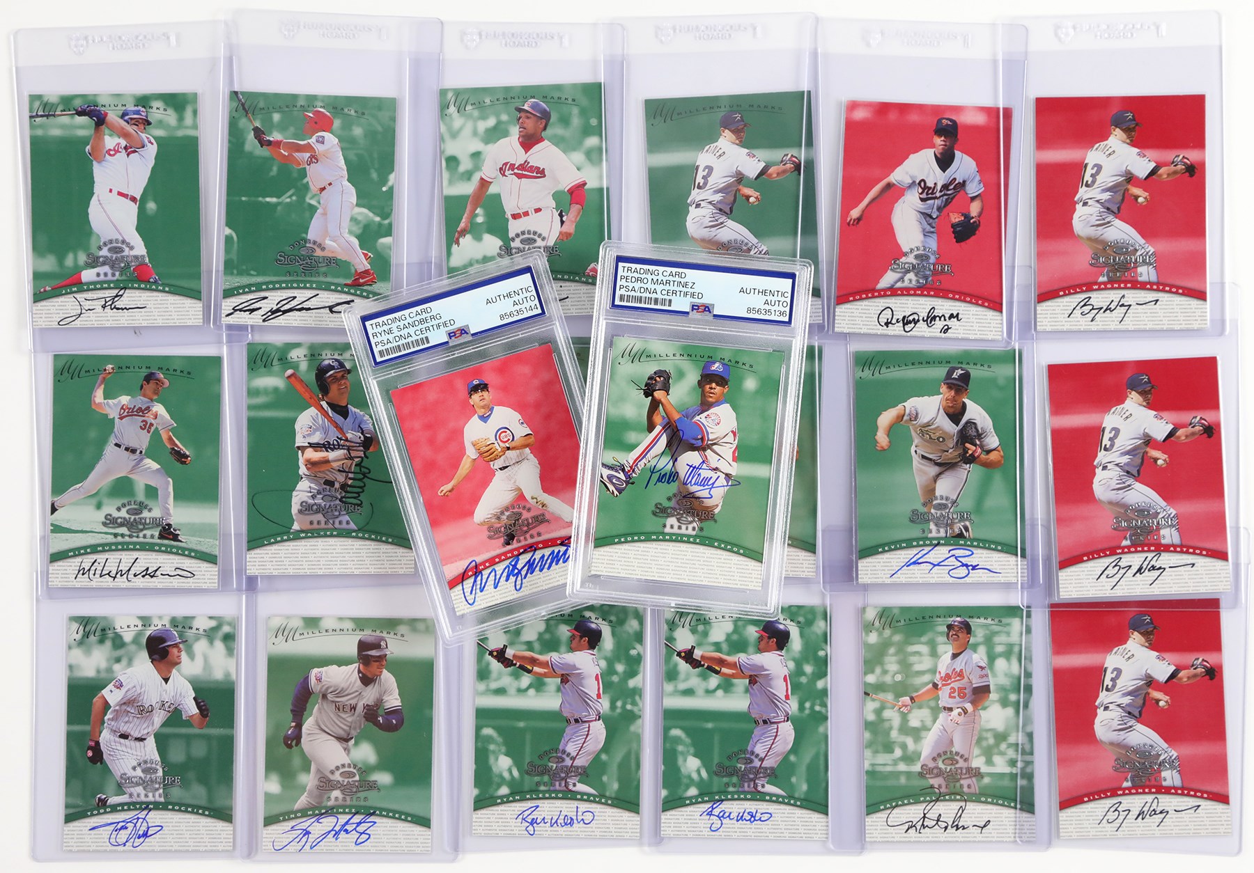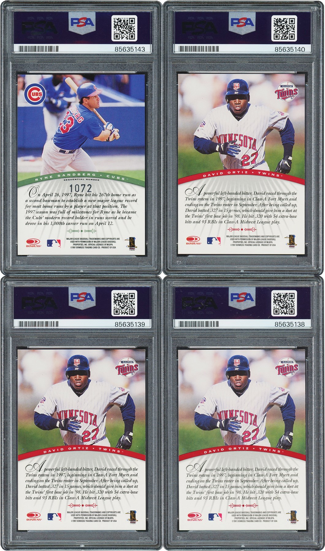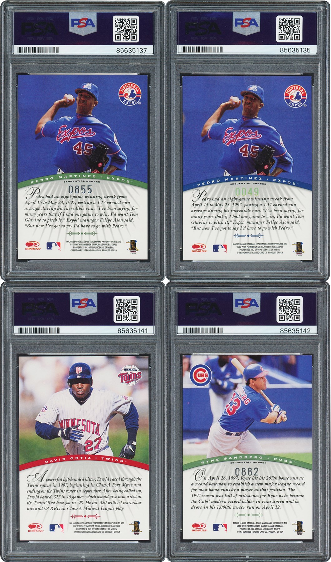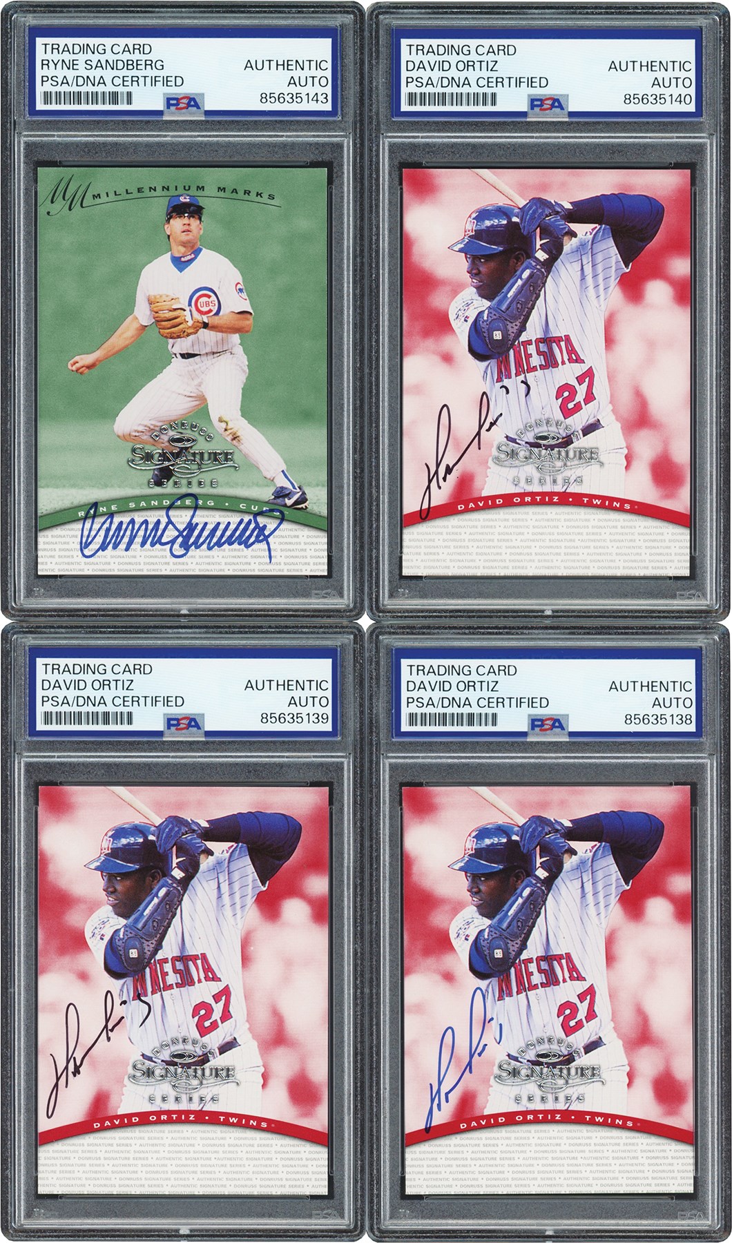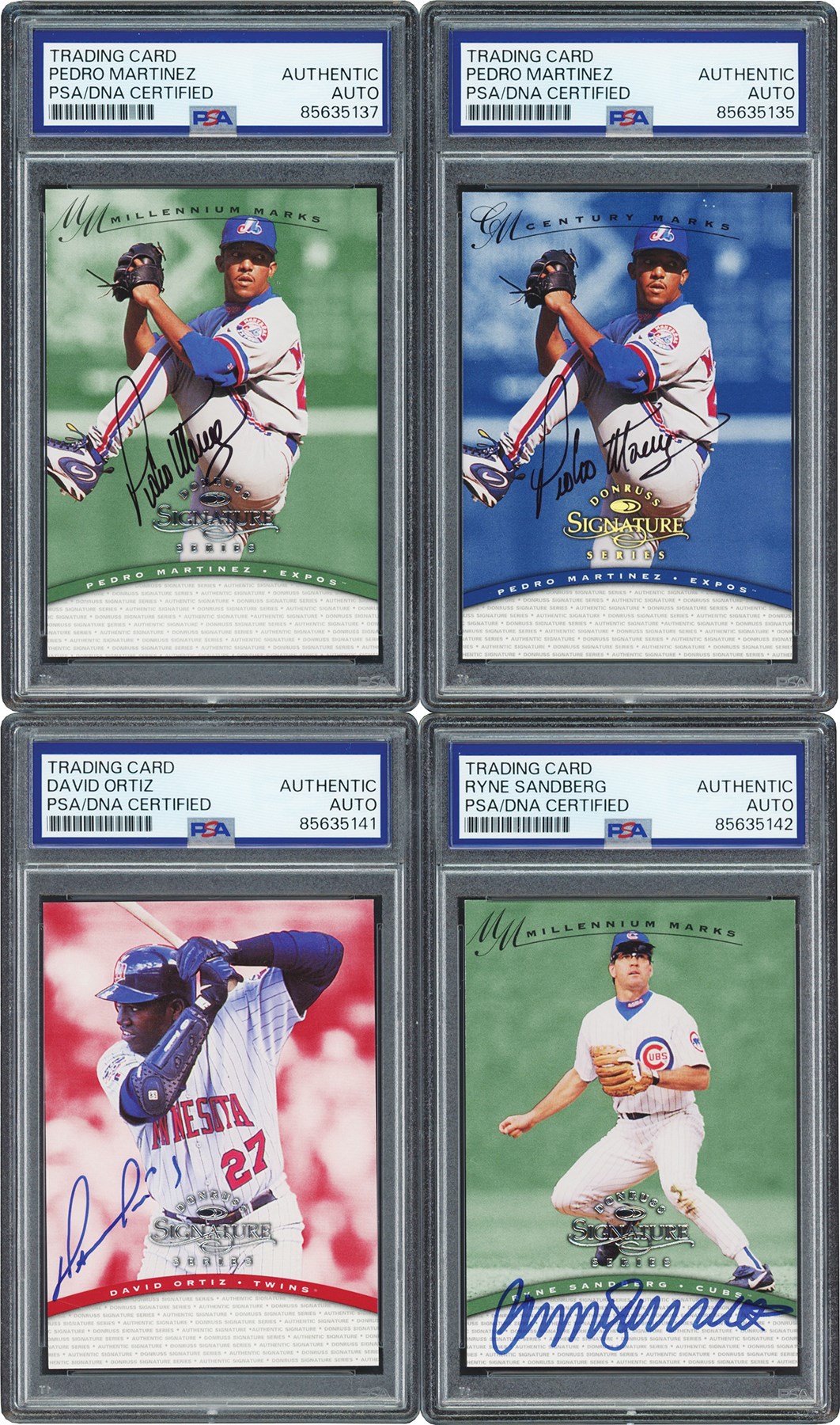 This lot features a collection of (35) 1997 Donruss Signature Series Autograph cards. All Green and Blue cards are sequentially serial numbered on the reverse. (10) cards have been encapsulated and authenticated by PSA AUTHENTIC AUTO including: (4) David Ortiz; (1) Ryne Sandberg; (2) Pedro Martinez Green; (2) Ryne Sandberg Green; and (1) Pedro Martinez Blue.