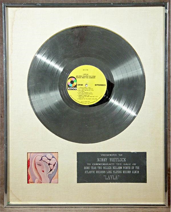 This in-house award presented to band member Bobby Whitlock for the much heralded “Layla And Other Assorted Love Songs” album commemorates sales of two million dollars. The RIAA was still five years from designating sales beyond gold status when this title was on the charts. Thus, it was left up to the individual record labels to present their own platinum awards. In Excellent condition, awards in this format are rarely seen. This landmark band was heralded for the guitar work of Duane Allman, and the soulful work of Eric Clapton whose inspiration came in the form of Patti Boyd, George Harrison's wife.