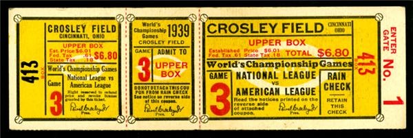 It was all Joe DiMaggio and New York that year, and the World Series was no different. The power of the Yankee lineup was all too much for the Cincinnati Reds to handle. Full unused ticket to game 3 at Crosley Field, upper box seat 413 measures 2.25x7.5” and is in Excellent condition. Labelled with “World’s Championship Games 1939” and price of ticket was $6.80.