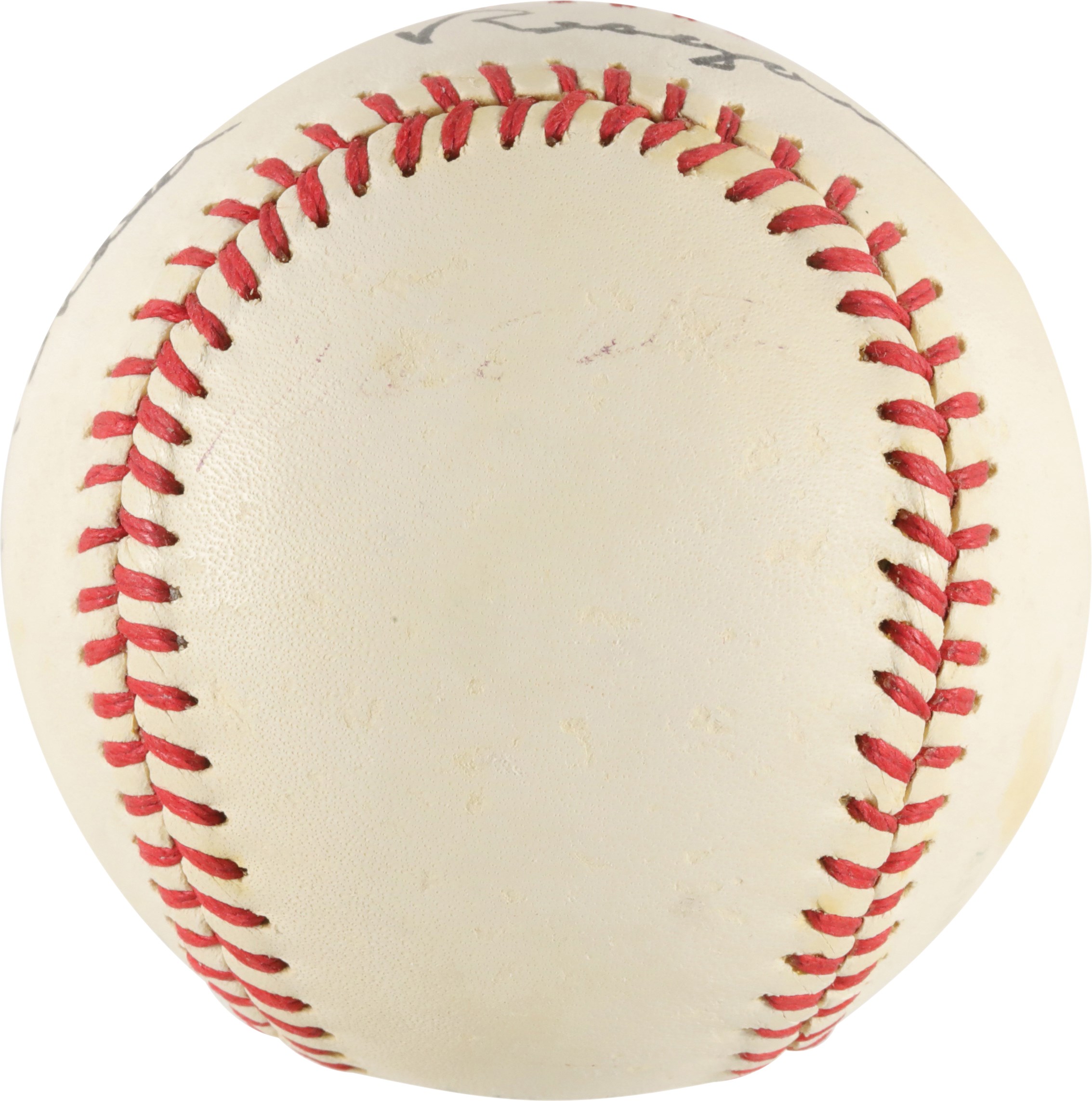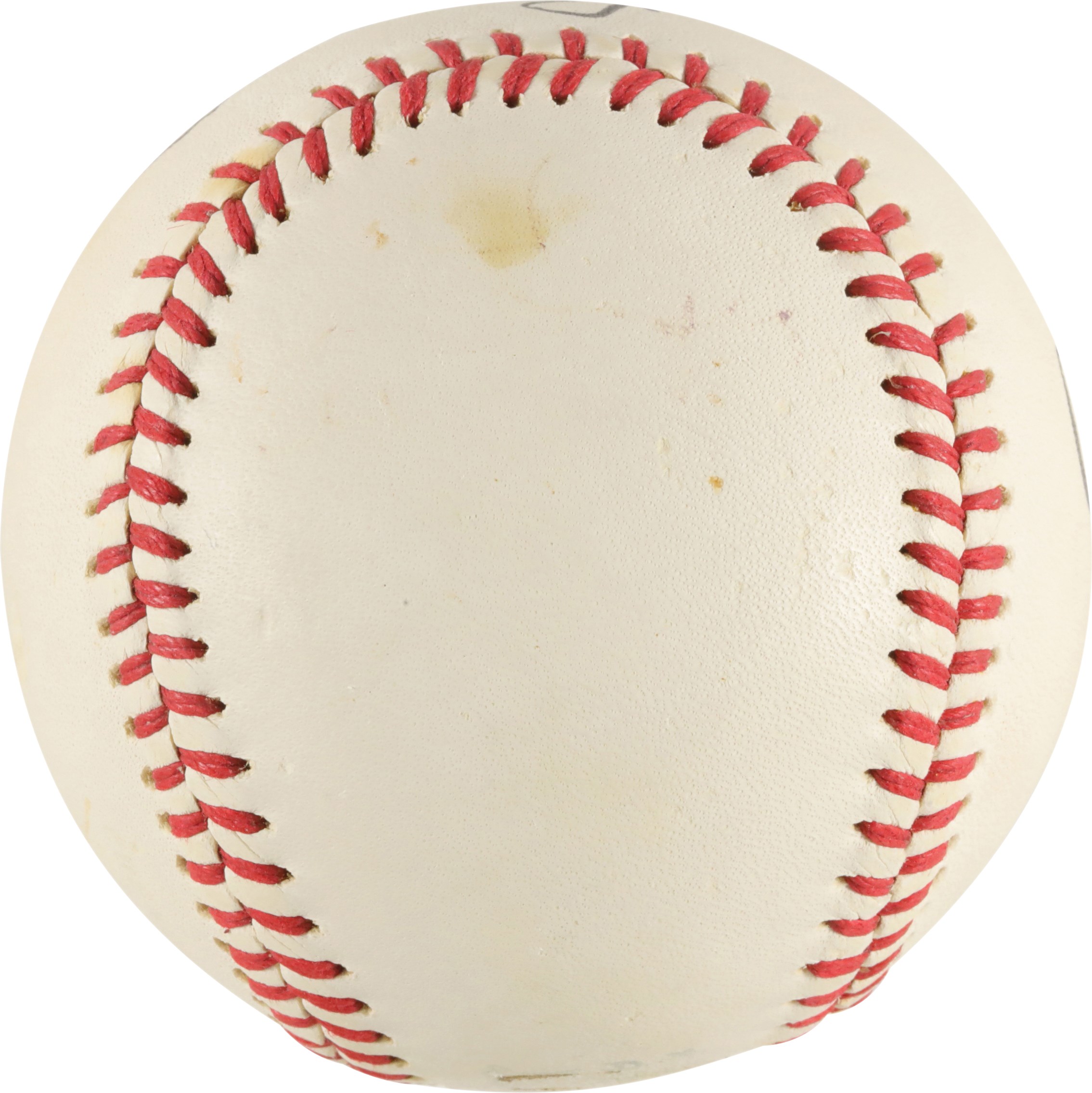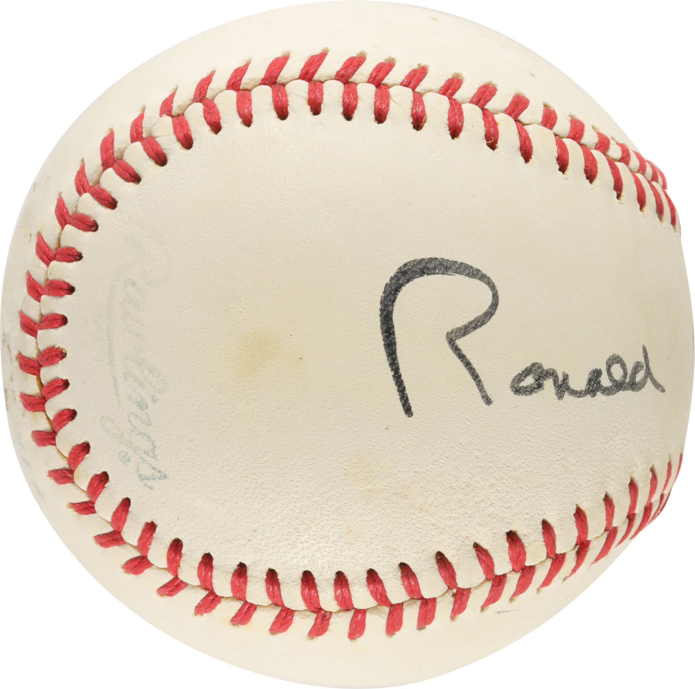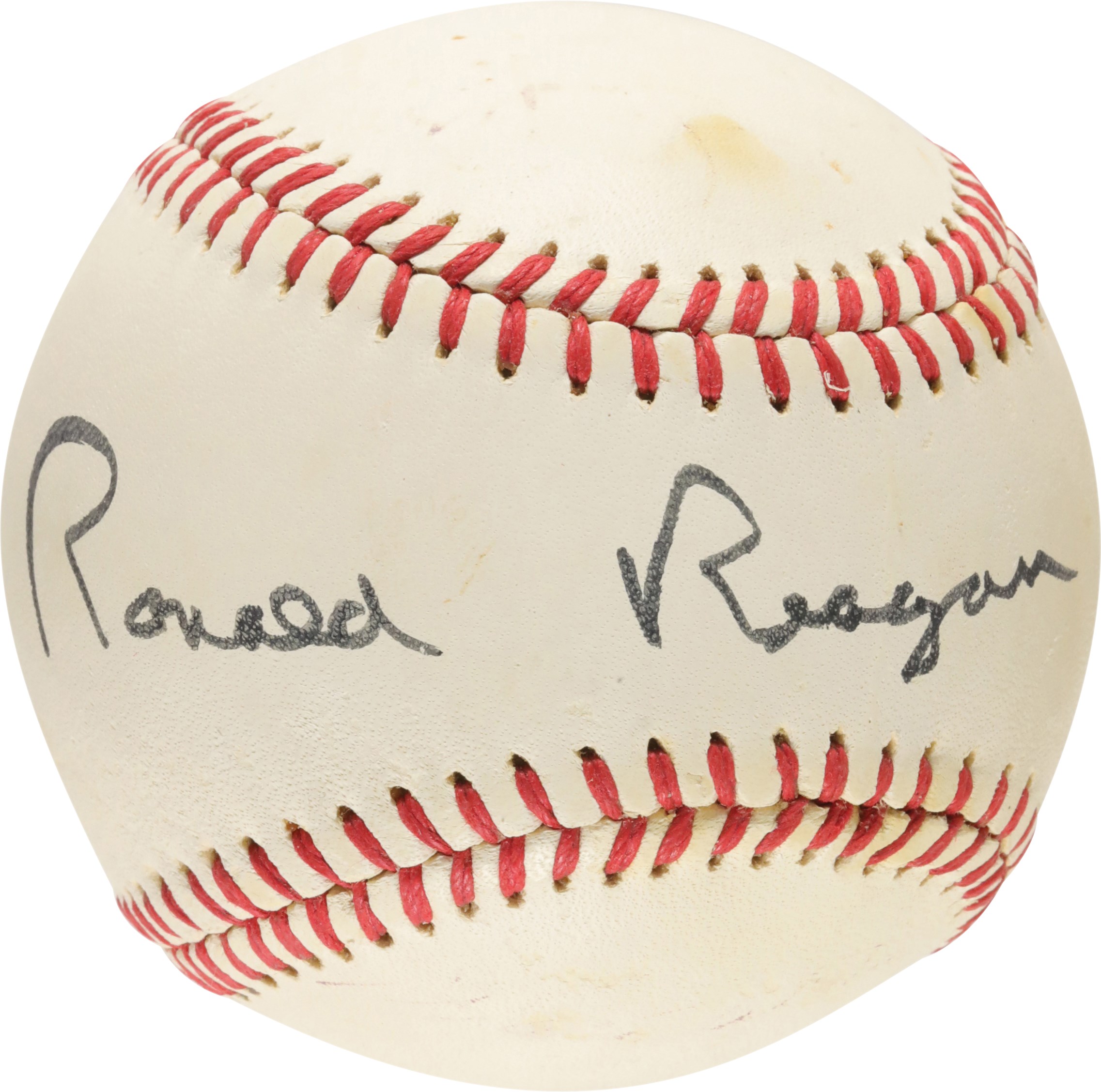 Known as both "the Gipper," and "Dutch," Ronald Reagan was the 40th President of the United States. Presented is a single-signed Ronald Reagan baseball. Reagan grew up in Illinois and after high school, he furthered his education in-state, at Eureka College. The former President was very connected to sports, and he was on both the football and swimming & diving teams at Eureka. After college, he became a radio broadcaster, and he broadcast the Chicago Cubs on WHO of Des Moines, Iowa, utilizing his imagination to re-create games from a basic telegraph feed. Reagan took a screen test for Warner Brothers in the 1936, when he was in California covering the Cubs' spring training, and he soon began his career as a movie actor. His breakthrough movie role was as Notre Dame star halfback George Gipp in the movie Knute Rockne, All American (1940). Among Reagan's many films were Dark Victory (1939), Kings Row (1942), and the baseball movie The Winning Team (1952), with Reagan portraying Hall of Fame pitcher Grover Cleveland Alexander.
