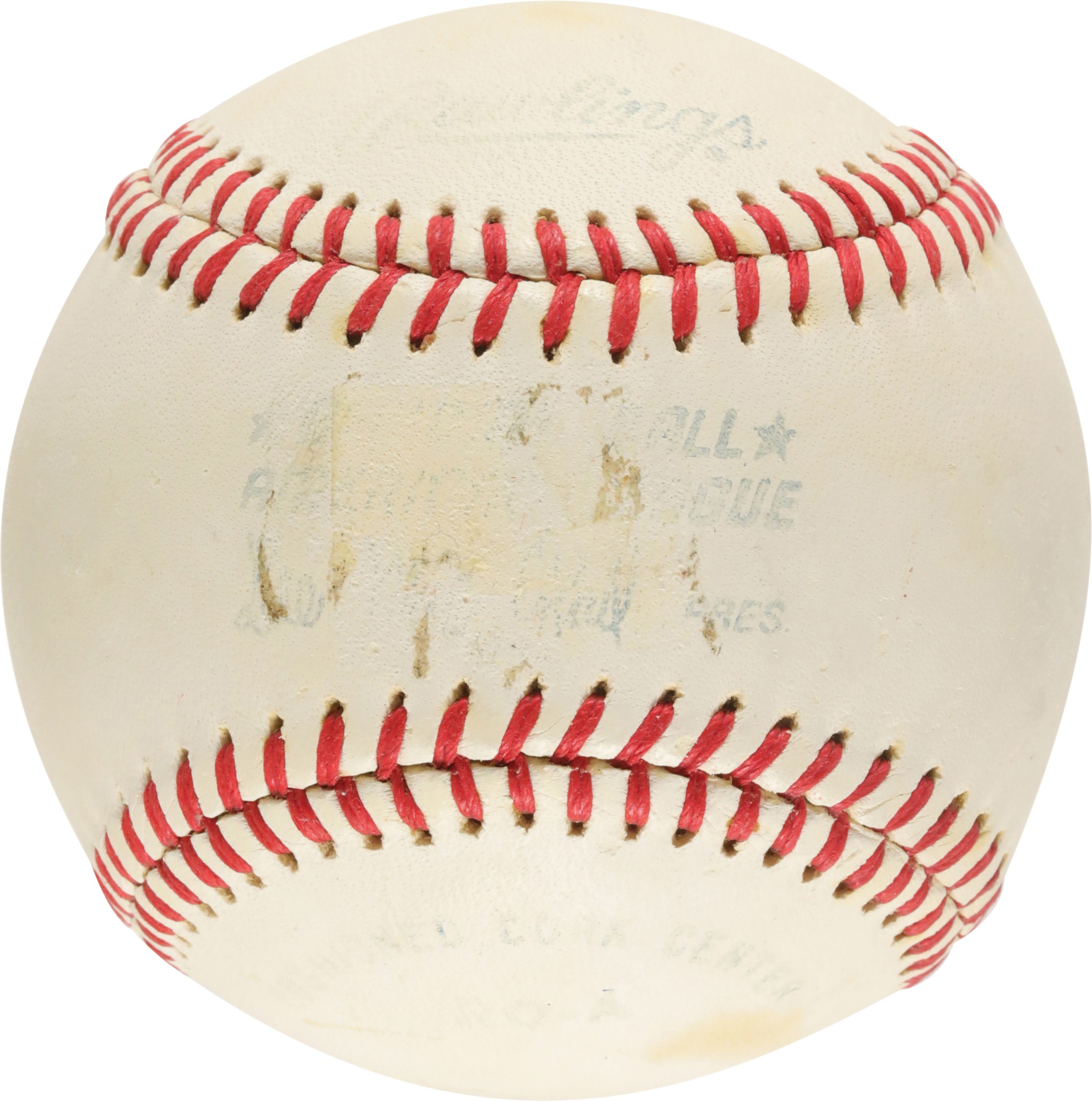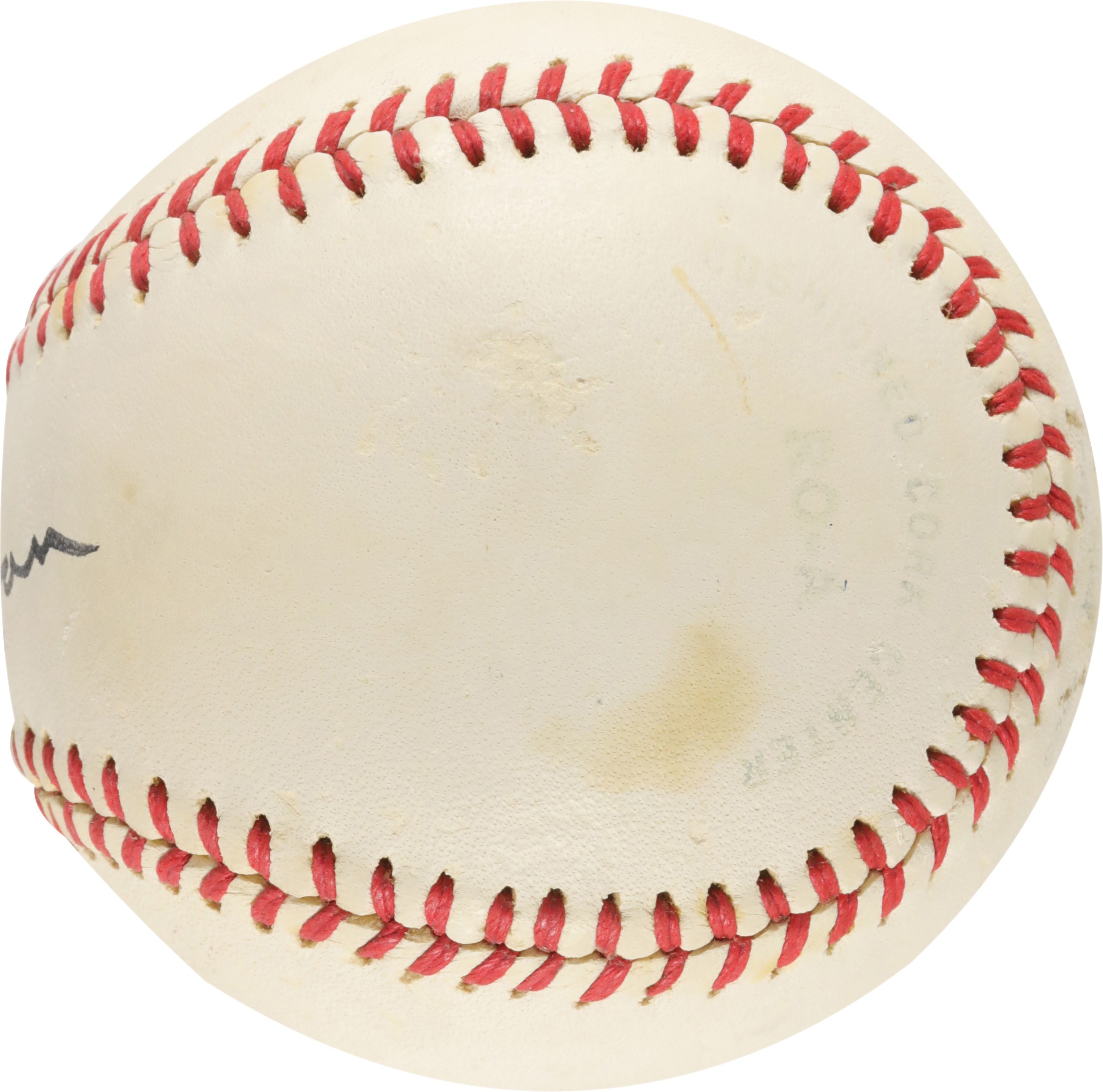 The offered baseball is a Rawlings (Haiti) Official American League Ball (MacPhail) which dates this ball to circa 1982, which was during Reagan's first term as President. He signed the ball on the sweet spot, using a black, fiber-tip marker to craft a neat, bold autograph rating 8.5/10. The stamped league and league president information has scratch marks and fading, and is only partly legible. The label opposite the sweet spot appears to have residue from previous display, and Rawlings stamp exhibits fading. The ball has a few stains and minor indents, but the stains do not interfere with the Reagan signature. It also appears that there is a faint signature of Walt Alston at the top of the south panel, which was not stated on the JSA letter. The signed ball comes with a JSA LOA for the Reagan signature. PSA declined to write a letter on this ball.