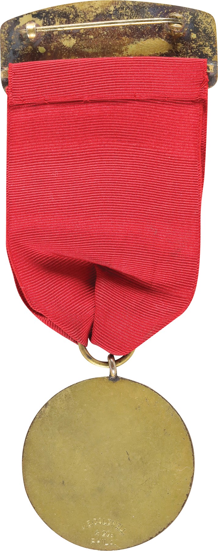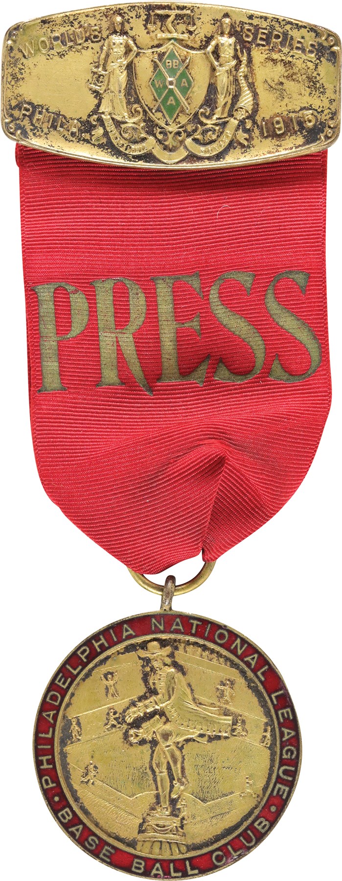 The design features a gold-colored brooch at the top that is lettered "World Series Phila. 1915." In the center is the enameled logo of the BBWAA, flanked on each side by a classical female image. Hanging from the brooch is a red ribbon that reads "Press" in gilt lettering. A circular pendant is attached to the base of the ribbon that features an illustration of a colonial figure in a windup pose, with a game-in-progress scene pictured in the background. The gilt lettering around the red-enamel perimeter reads "Philadelphia National League Base Ball Club." 1.75x4 inches.  The diameter of the medallion measures 1.5 inches. Manufactured y J. E. Caldwell & Co. of Philadelphia, as noted by the engraving on the reverse of the medallion. There is moderate tarnishing to both the brooch and medallion (front and reverse), but the ribbon is well preserved. In Very Good condition overall.