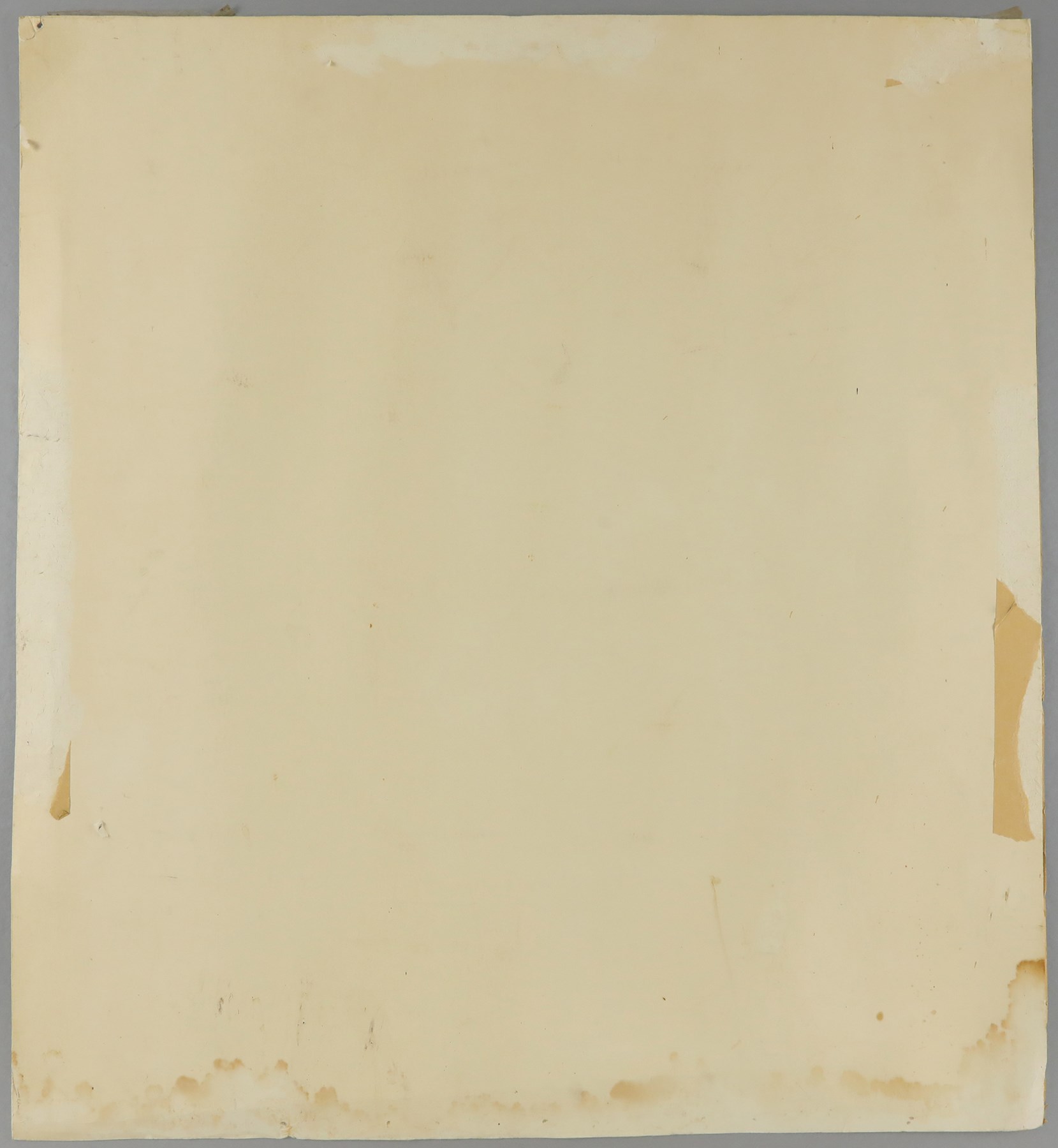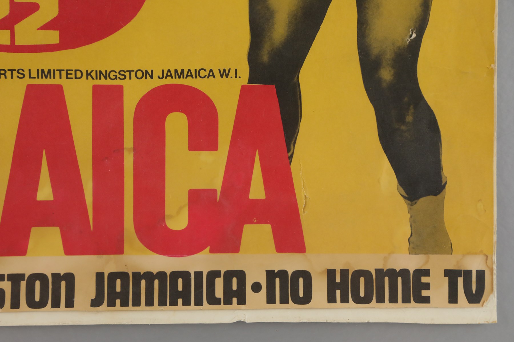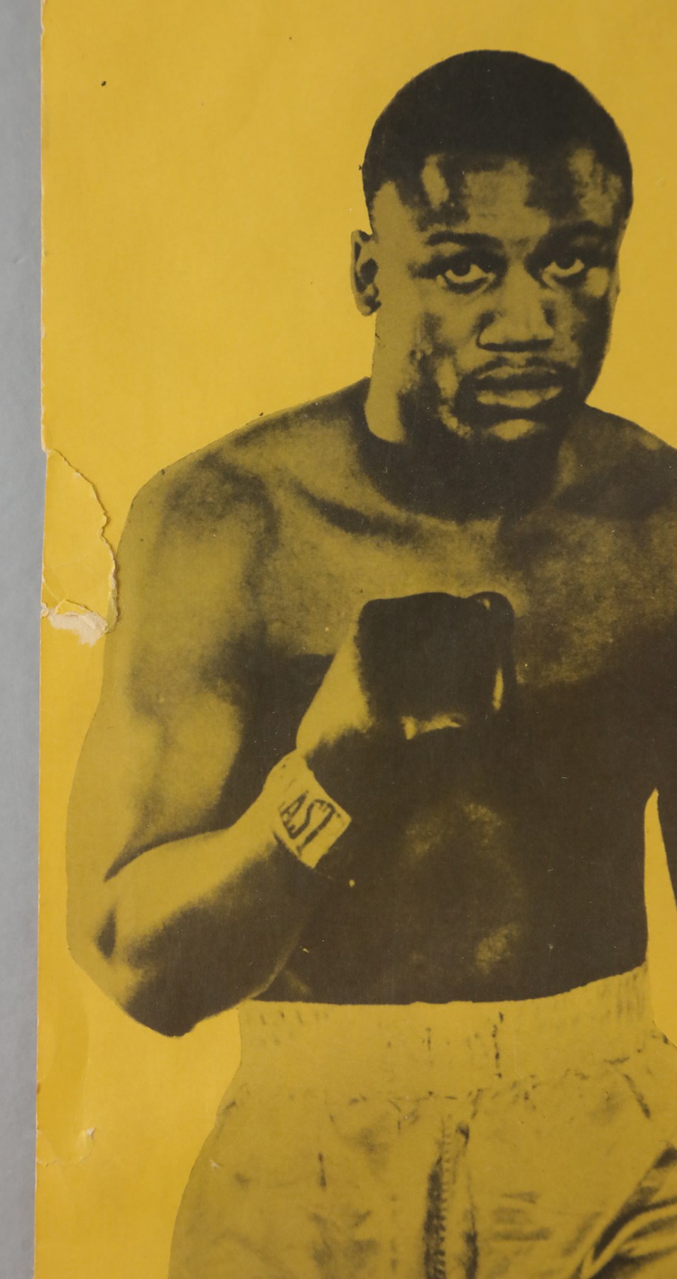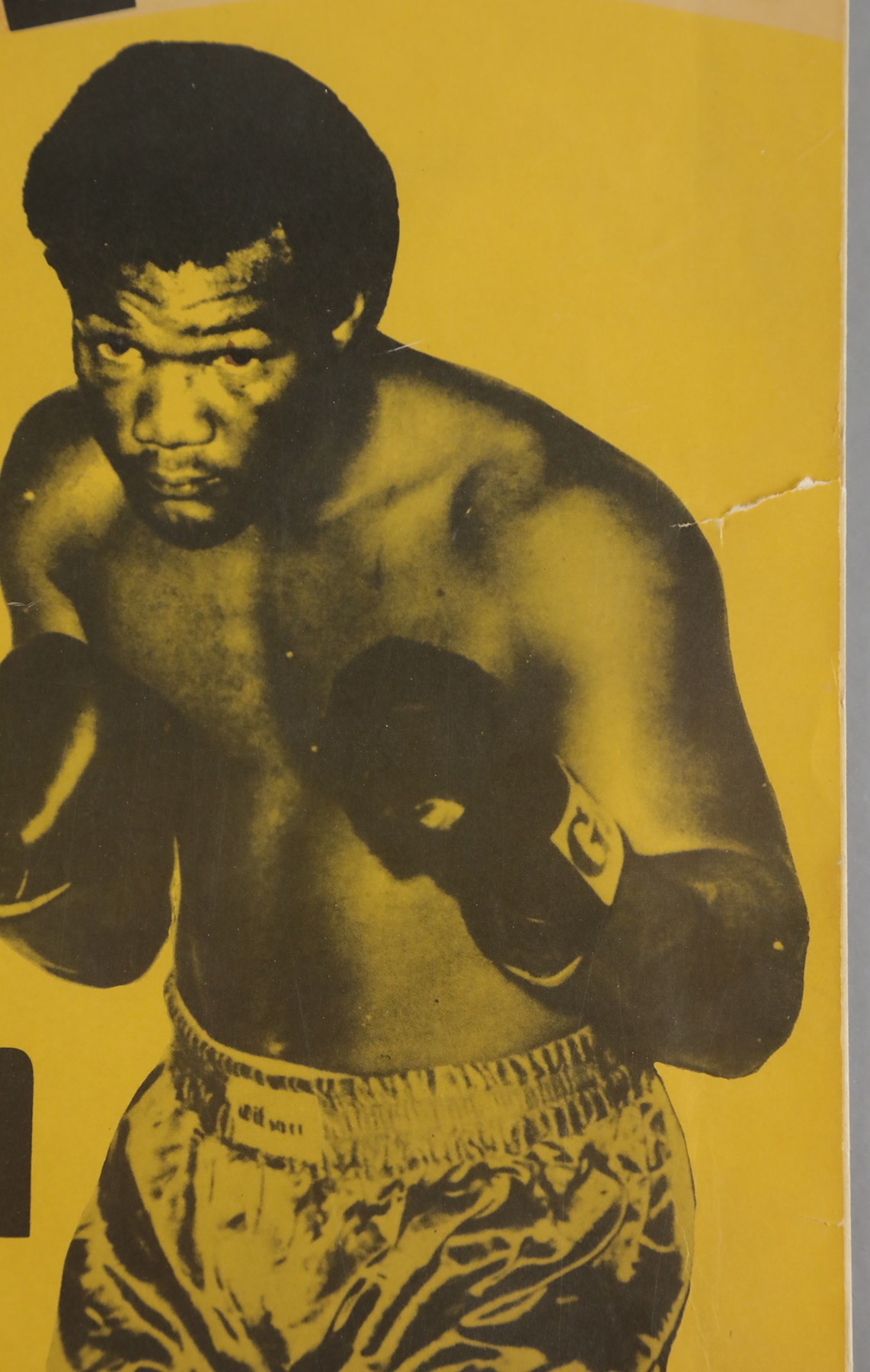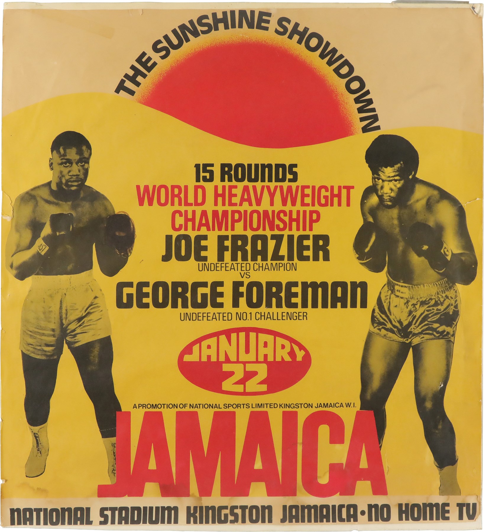 1973 George Foreman vs. Joe Frazier fight poster. All the details are printed on this vintage fight poster (22x24"), including: "World Heavyweight Championship," "Joe Frazier, Undefeated Champion, vs. George Foreman, Undefeated Challenger," "January 22, Jamaica, National Stadium." Foreman and Frazier are featured in intimidating fight poses beneath what looks like the sun going down, under the words "The Sunshine Showdown" at the top of the poster. The poster is blank on the back except for some pieces of original tape, evidence that this poster was likely hung in a public setting like a bus stop, or a bar, to promote the fight. The yellowish tan poster is printed on thick cardboard stock paper, and it is attached to a thicker, white piece of cardboard stock paper. There are some small tears and creases on the surface of the poster, and there is evidence of water damage at the bottom of the poster. Foreman dominated Frazier in the much-anticipated fight. He knocked the champion down six times, and scored a technical knockout in the second round.