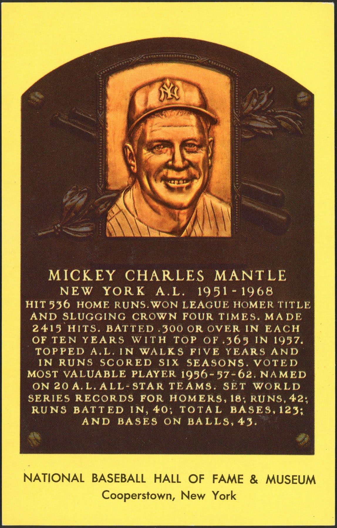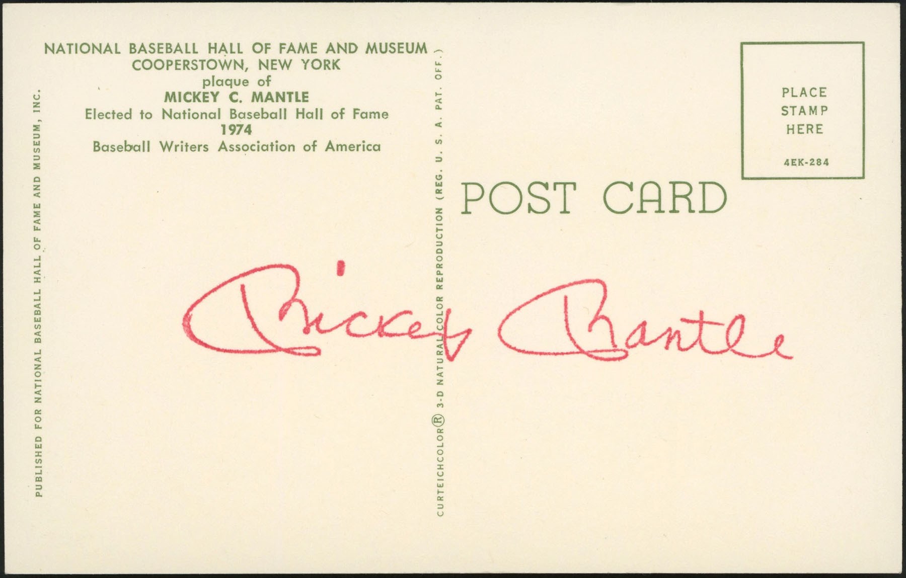 Mickey Mantle signed Hall of Fame plaque postcard. Mantle signed the back of this 5x7" postcard in red ink. The signature is large and bold and grades a 9/10. The postcard is in near-mint condition. Mantle is widely considered to be one of the greatest sluggers in baseball history. He hit 536 home runs during his career and was inducted into the National Baseball Hall of Fame in 1974. This postcard features Mantle's bronze Hall of Fame plaque on the front. Full LOA from PSA.