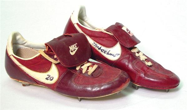 His 548 career homeruns, 11 Gold Gloves, & 11 All-Star appearances say it all. This HOFer is the best third bagger ever to play the position. These special red Nike spikes carried Mike Moustache around more than a few bases during the ‘80’s. Excellent wear and signed on each outer swoosh with his #20 written in marker. Signed again on the right cleat in silver sharpie.