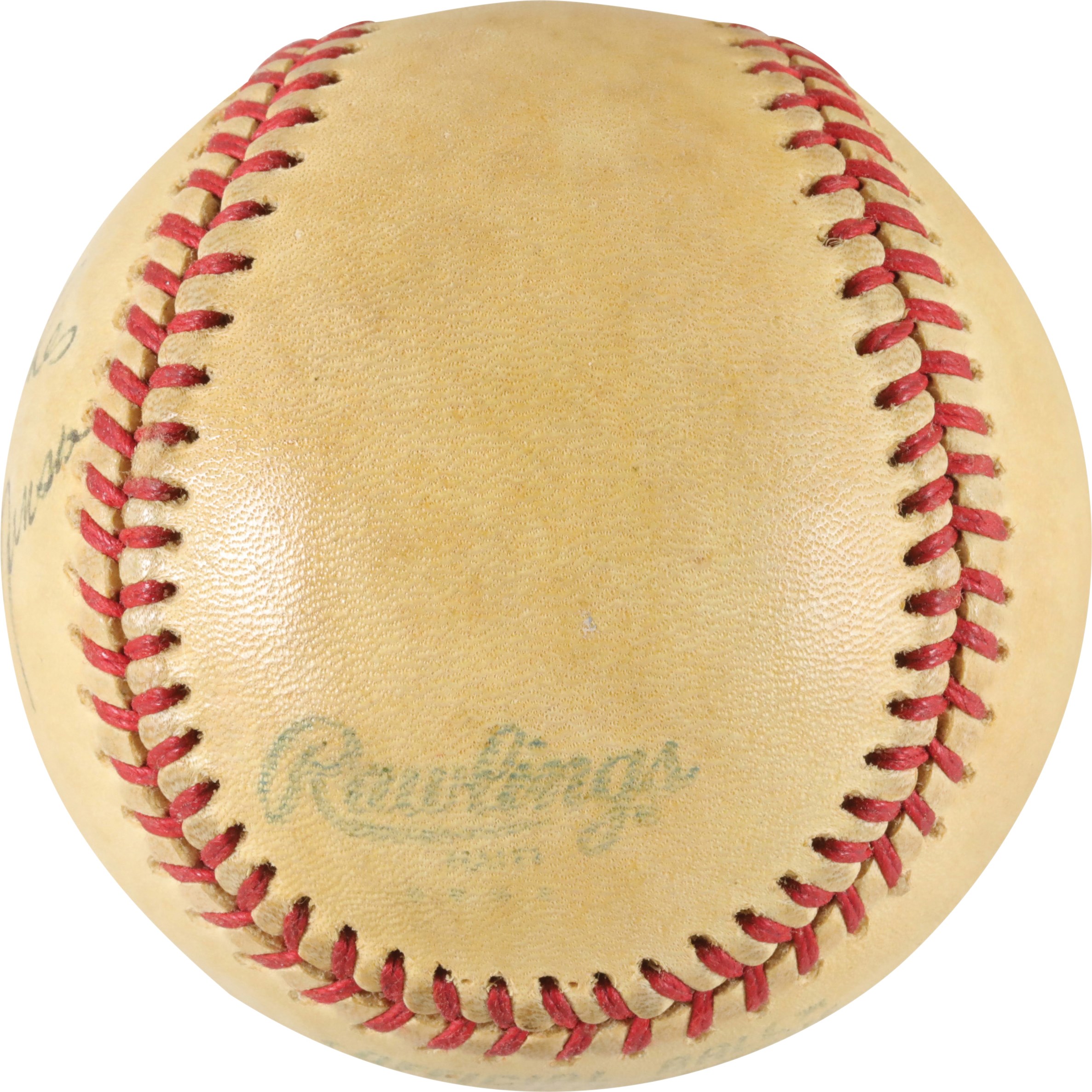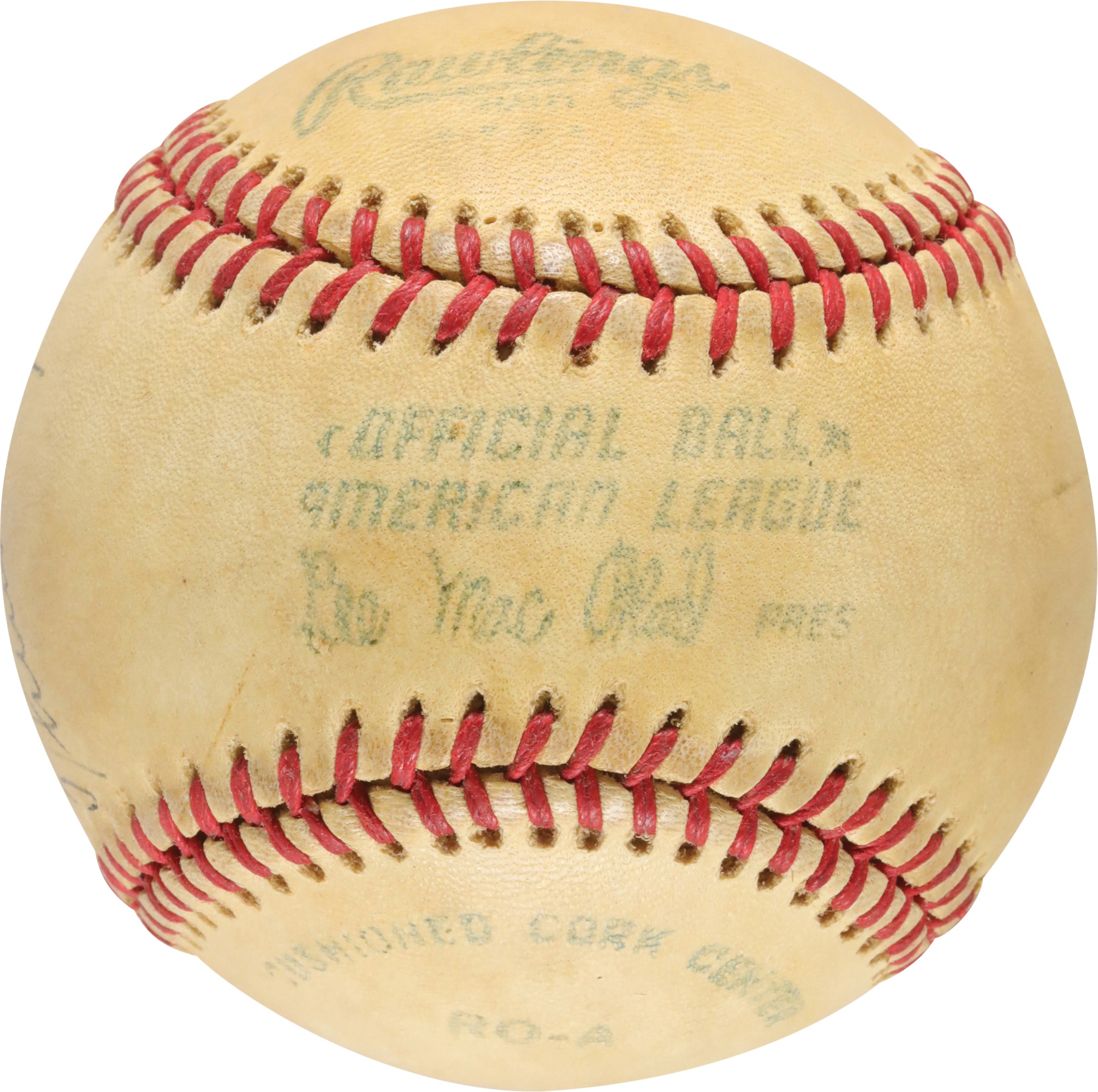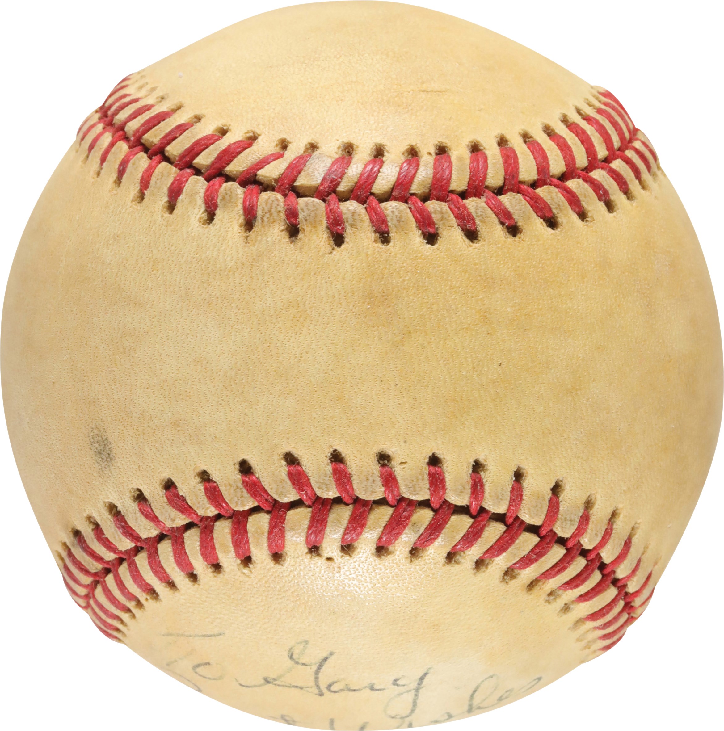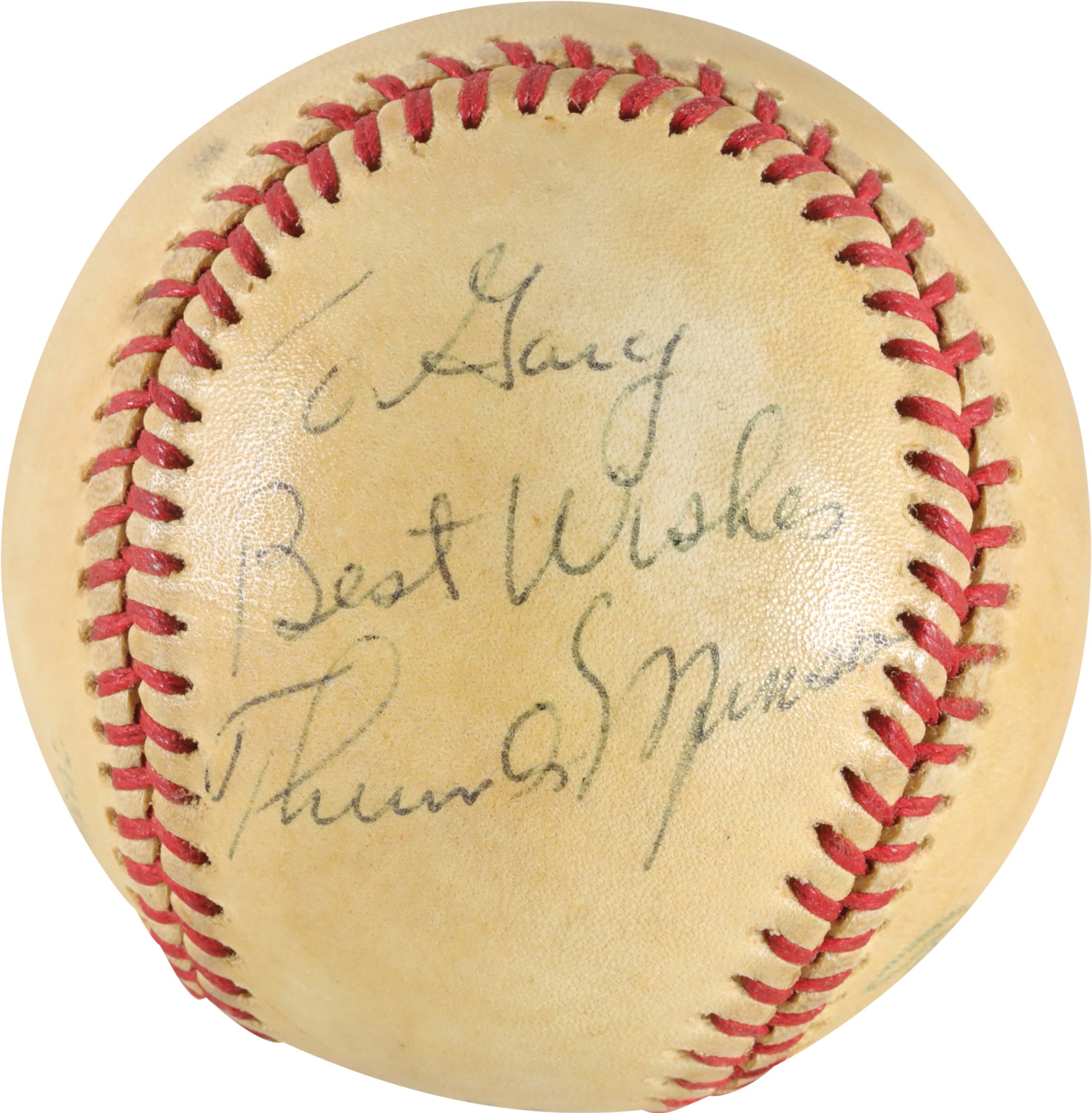 Official American League (MacPhail) ball signed by New York Yankees catcher Thurman Munson on a side panel. Munson has beautifully inscribed the ball in blue ink "To Gary/Best Wishes/Thurman Munson," with the signature grading 8/10. Based upon the manufacturing stampings (four dots under "Haiti"), this ball was produced in 1979. As such, it was signed by Munson just a short time before his tragic death in a plane crash on August 2nd. The ball displays moderate soiling, indicating it may have been a game use ball, and is otherwise in Excellent condition. Full LOA from JSA.