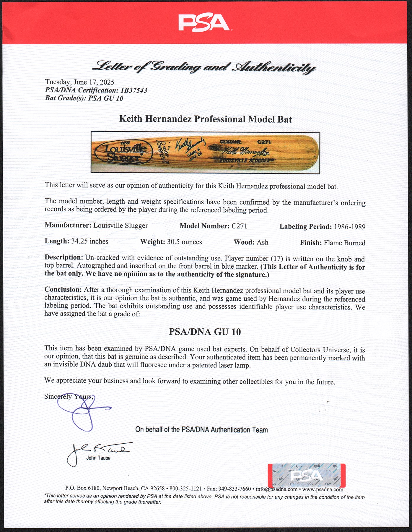 Lot # 598: 1980s Keith Hernandez New York Mets Signed Game Used Bat (PSA)