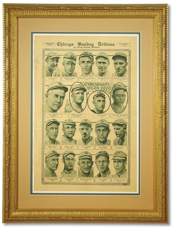 Supplement for the Chicago Tribune is an exceptional representation of the “World Champion” Cincinnati Reds of 1919. Actually, they were the team facing the infamous Chicago Black Sox, later found guilty of the most well-known scandal in the history of sports. Motivated by gambling money, the Chicago White Sox were in fact manipulating the World Series to lose on purpose in 8 games. Pictured in this 12x18” supplement from the Tribune (dated September 21, 1919) are Magee, Groh, Mitchell, Roush, Salee, Ring, Rath, Ruether, Kopf, Moran, Daubert, Fisher, Rariden, Neale, Gerner, Allen, Eller, Sallee, Wingo & Luque. A few edge tears have been restored (EX-MT conditionand mounted on linen). Nicely double matted and elegantly framed to 19x25”.