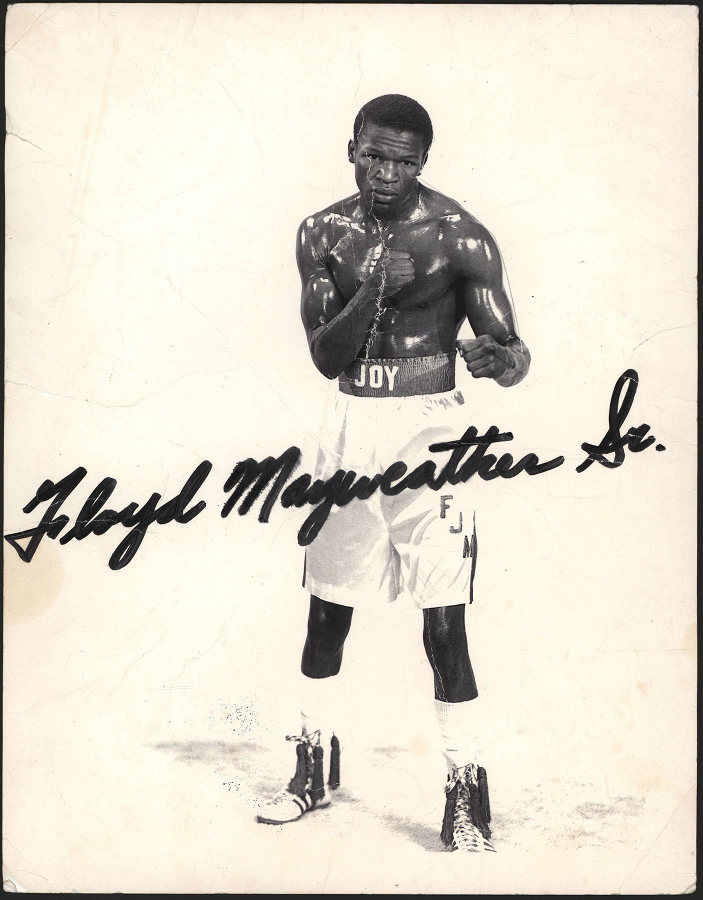 A signed 8x10" photo of Floyd Mayweather Sr., a professional boxer and father of Floyd Mayweather Jr. The image shows a young Mayweather Sr. in a boxing stance and he has signed the piece in black marker. The piece features some creases and rounding in the corners. Mayweather Sr. was a fine boxer during his 16-year career, compiling a record of 28-6-1 and matching up with fighters like Sugar Ray Leonard and Marlon Sterling. Mayweather Sr would go on to become a renowned trainer, working with Oscar De La Hoya, Ricky Hatton, and his son, Floyd Jr.