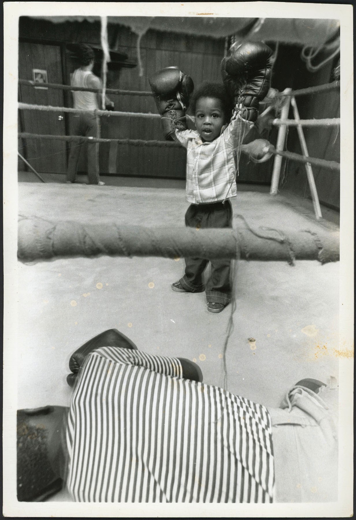 A photo of legendary boxer Floyd Mayweather Jr., in a boxing ring when he was still a toddler. In the black and white image (6.5x9.5") the young boxer is raising his hands in victory as another child lays on the ground. The image features some creasing and rounded edges. Mayweather Jr. comes from a famed boxing family as his father Floyd Sr, and his uncles Roger and Jeff were all prominent fighters. Floyd Jr. would surpass them all and is considered to be among the greatest fighters in boxing history. This is an incredible unique piece from early on in his career.