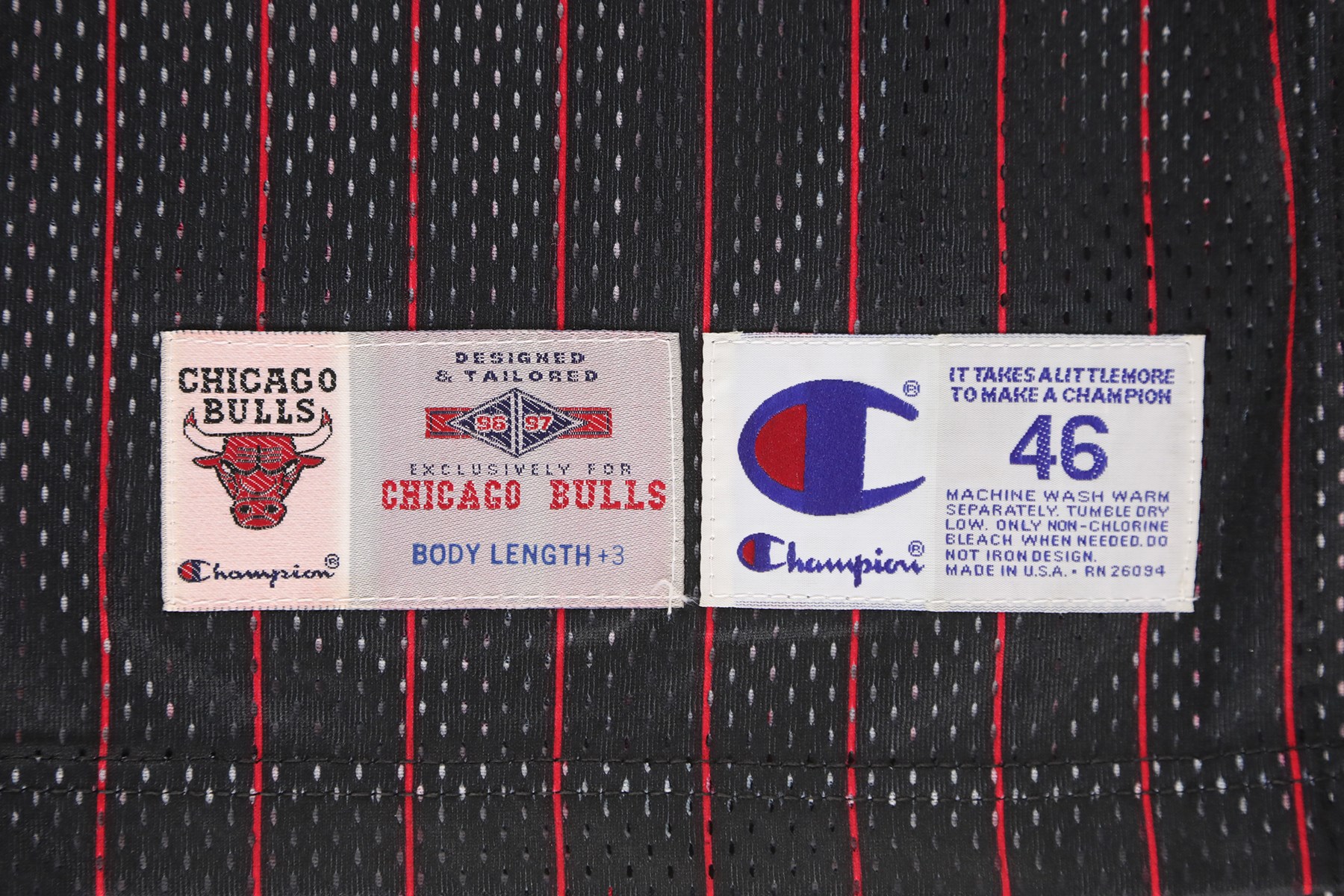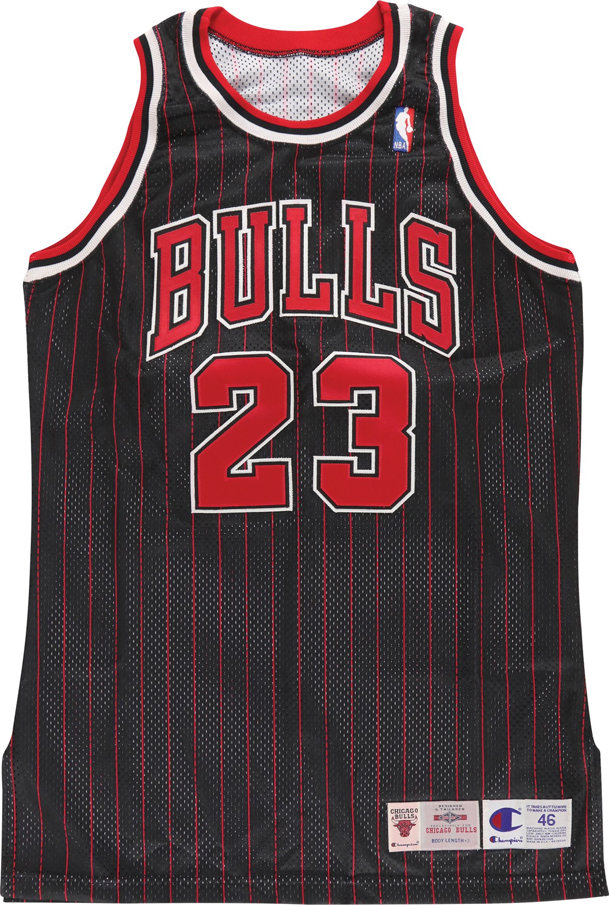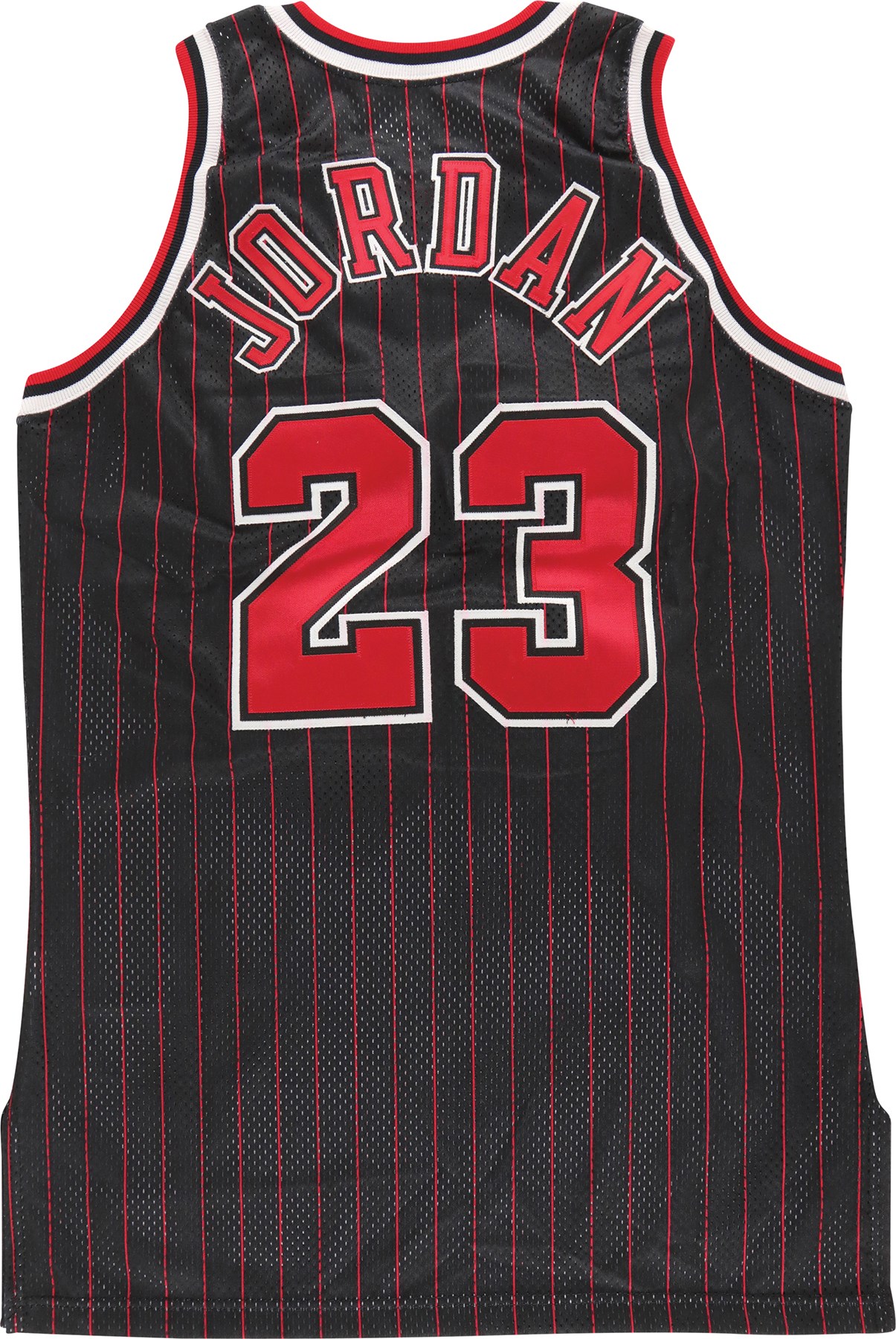 The black mesh pinstripe jersey is lettered "Bulls" across the front and features the number "23" on the front and reverse. "Jordan" is lettered on the reverse above the number. All letters and numbers are applied in red-on-black-on-white tackle twill. Located on the left front tail are a "Champion 46" label and a second "Champion" label that reads in part "96/97 Designed & Tailored Exclusively for Chicago Bulls Body Length +3." The jersey is original as issued and shows no use. Together with a letter of provenance from the consignor.