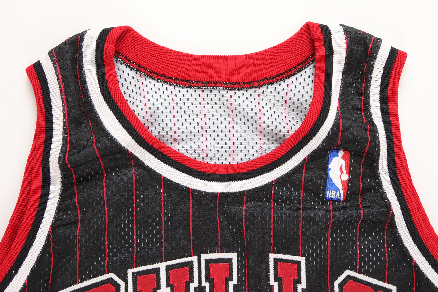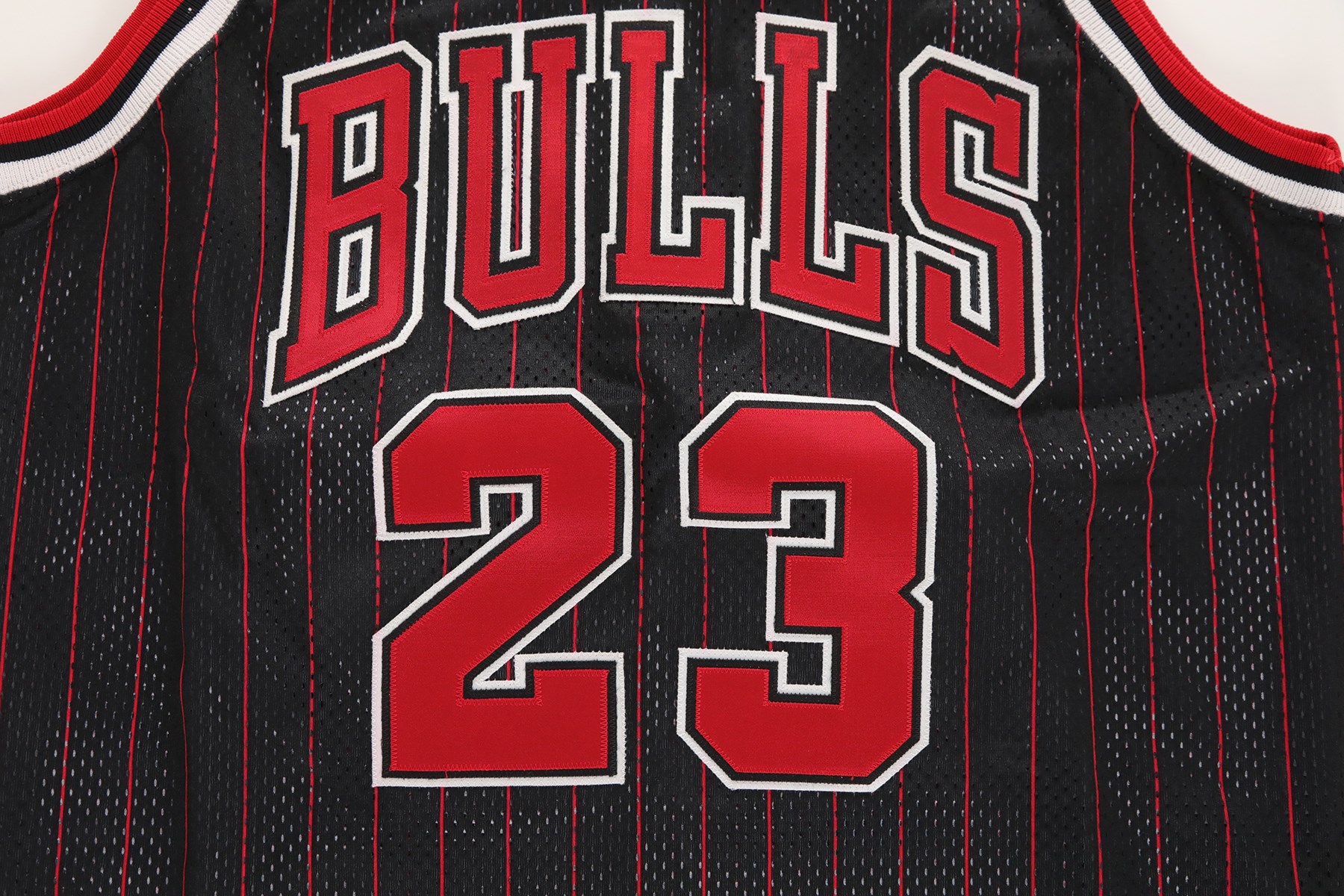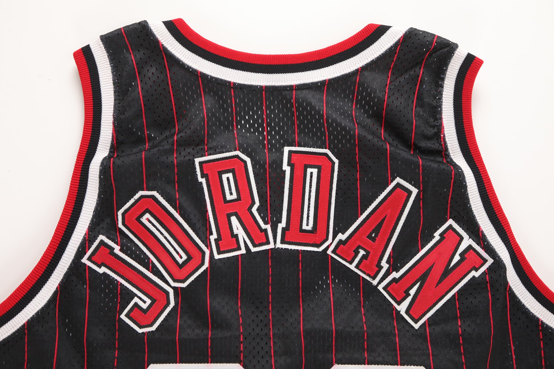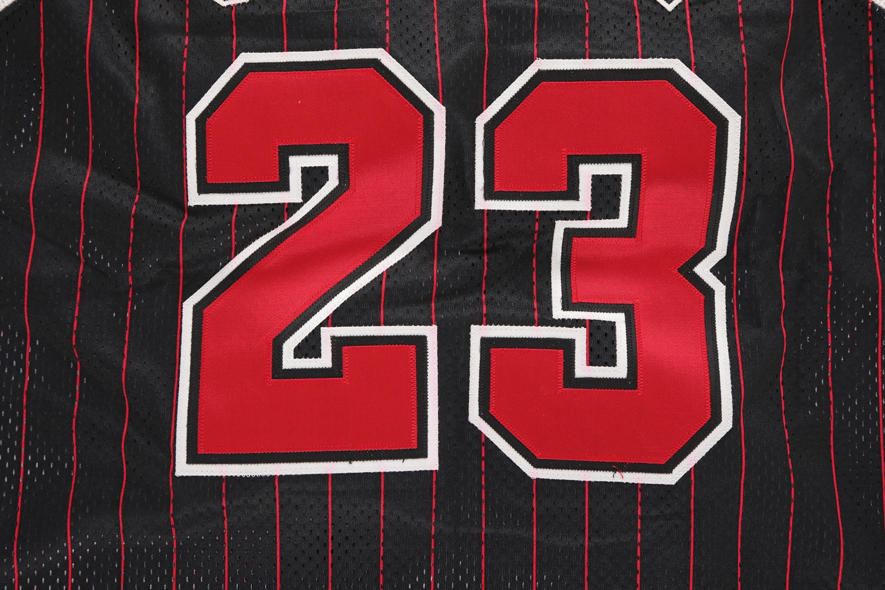 The black mesh pinstripe jersey is lettered "Bulls" across the front and features the number "23" on the front and reverse. "Jordan" is lettered on the reverse above the number. All letters and numbers are applied in red-on-black-on-white tackle twill. Located on the left front tail are a "Champion 46" label and a second "Champion" label that reads in part "96/97 Designed & Tailored Exclusively for Chicago Bulls Body Length +3." The jersey is original as issued and shows no use. Together with a letter of provenance from the consignor.