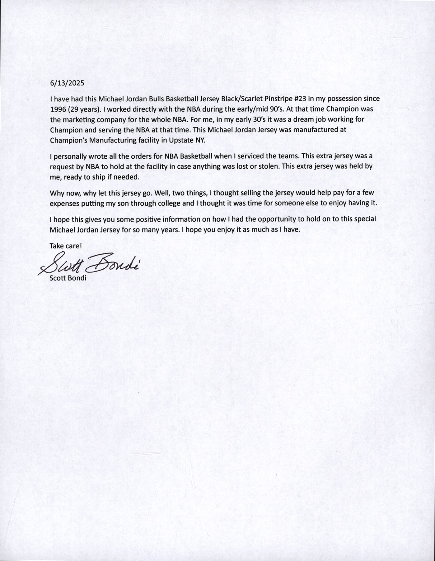 Chicago Bulls home jersey produced for use by Michael Jordan during the 1996-97 season. This jersey was never worn by Jordan, but the reason he never wore it is directly related to its provenance. The jersey has been consigned directly by the former Manager of Team Operations for Champion, the company that produced the uniforms for the Bulls. As he explains in his accompanying letter of provenance, the NBA requested Champion to make additional jerseys for Jordan, in the event that one was lost, stolen, or damaged. This is one of those extras, that was held by our consignor at the Champion facilities. After the season, when it was no longer needed, he retained it as a souvenir, and it has been in his possession since that time. It must be noted that the offered jersey is identical to the ones worn by Jordan during the 1996-97 season, making it an affordable example for budget-conscious Jordan collectors.