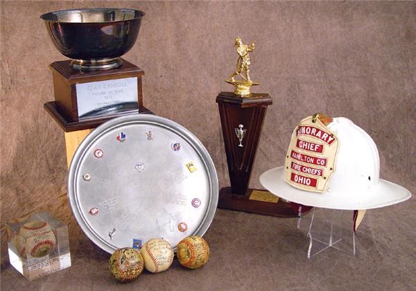 Steadfast relief specialist for the Big Red Machine led the NL in ’66 for most appearances in a single season, establishing a new Braves record. Then he authored a single season record 37 saves in ’72 with the Cincinnati Reds. Offered is “Hawk’s” career highlights trophy collection: 1. 1972 Pitcher of the Year trophy bowl. Silver bowl (tarnished) sitting on wooden podium. Statue is 9” square and stands 10” tall. Plate on front with engraved “Clay Carroll Pitcher of the Year 1972 Cincinnati Reds Cincinnati Chapter BBWAA”. 2. Fireman of the Year award for 1972 season performance. White fireman’s hat with “Honorary Chief Hamilton Co Fire Chiefs Ohio” on front. 3. 1966 trophy in recognition of his 73 appearances. Stands 18” tall with fireman on top. Silver baseball player on lower stand. Engraved plate next to it reads “to Clay Carroll in recognition of establishing a new Braves pitching record in making 73 appearances in 1966 from Braves 400 Club”. 4. 1971 National League All Star game plate. Engraved with “Presented to Clay Carroll All Star Game July 13, 1971 Charles Feeney President” in the center with NL press pin. 12 NL team press pins surround it with the engraved names of the players in the All Star game from each team. Plate is 14” in diameter. 5. Carroll’s game-winning home run baseball hit off Bob Gibson – May 30, 1969. In glass encasement, visible mold has attached to ball inside. 6. Inscribed game ball from May 30, 1969: “Won against Bob Gibson May 30th, 1969 4-3”. 7. Two commemorative Braves baseballs intricately decorated by George Sosnak with the Hawks stats and highlights.