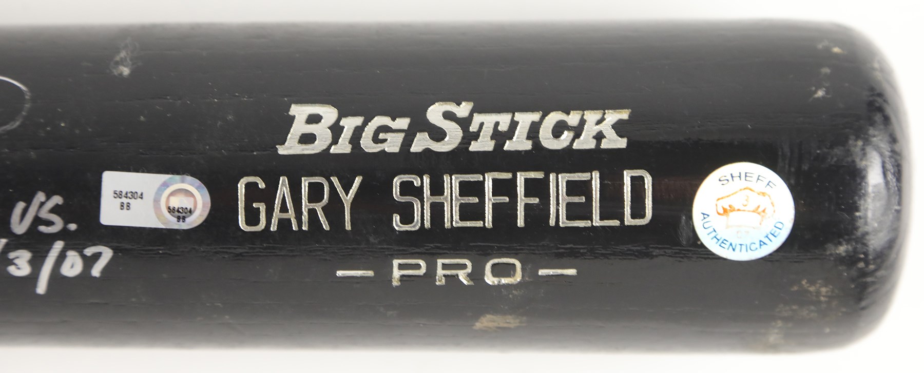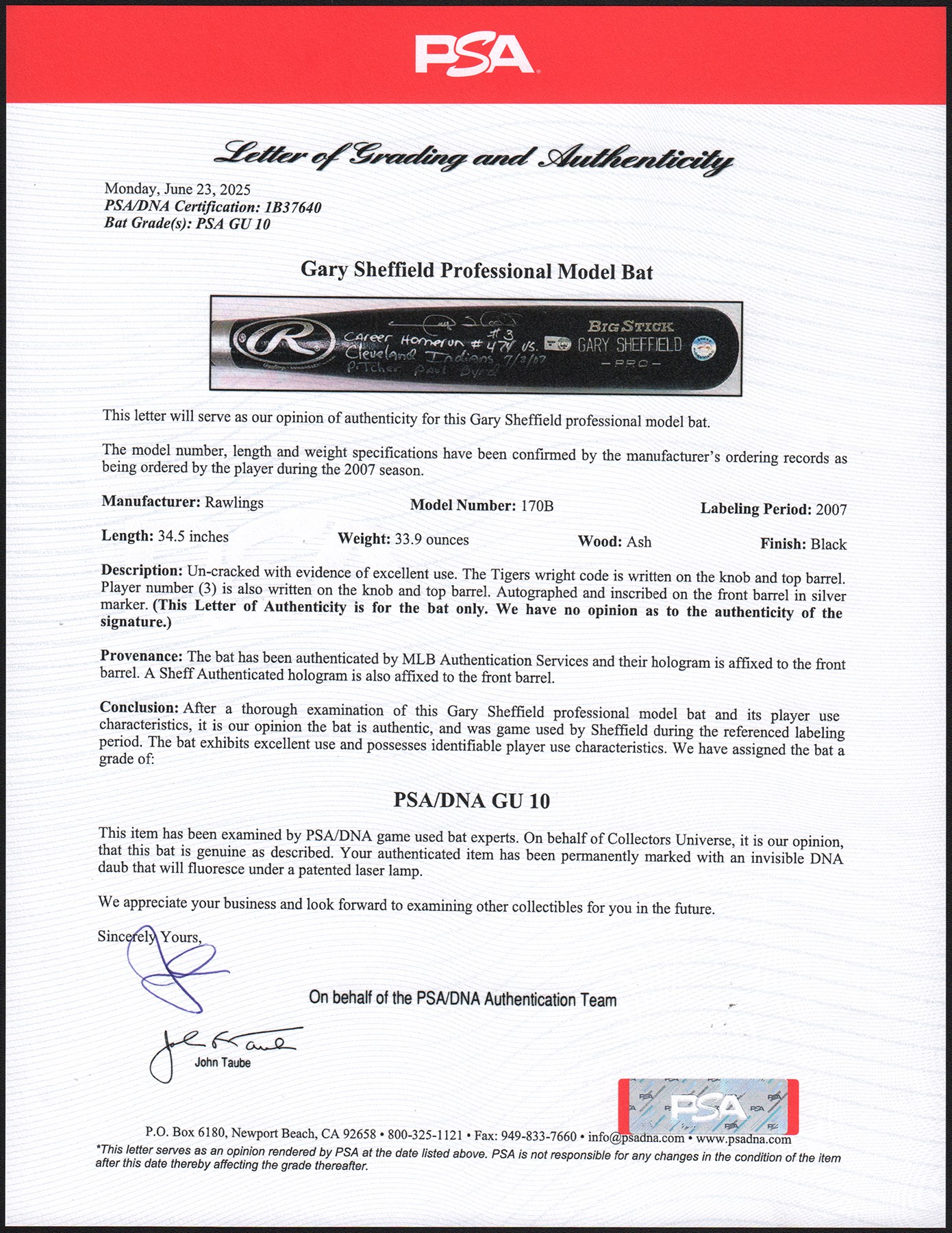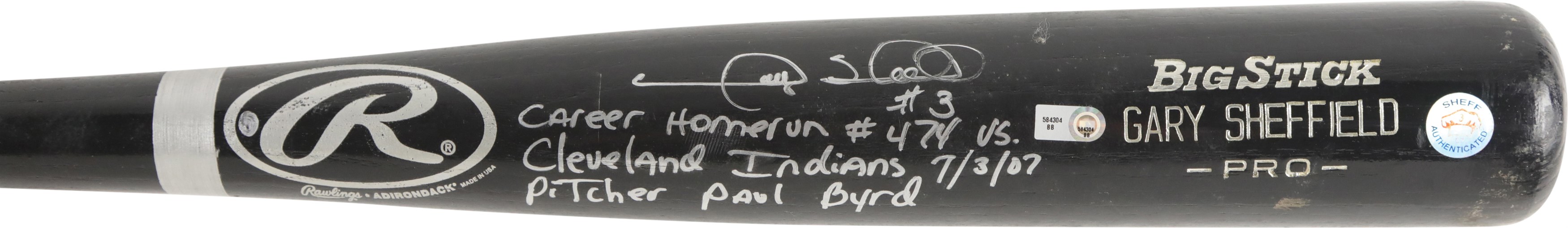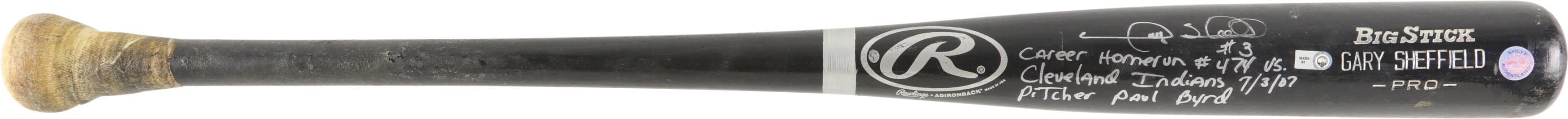 2007 Gary Sheffield Detroit Tigers signed and inscribed game used bat. Black Rawlings Model 170B ash bat measures 34.5" and weighs 33.9 ounces. Bat is uncracked and use is displayed with evidence of pine tar (or other sticky residue) on the handle, a few small indentations, and prominent ball marks on the barrel. White cloth tape has been used to create a bubble knob, with a line of silver writing poking through the middle; numbers 3 and 11 are on the barrel end in silver Sharpie. Autographed between the barrel and trademark in 7-8/10 silver Sharpie along with uniform number 3 and lengthy inscription - "Career Home Run #474 vs Cleveland Indians 7/3/07 - Pitcher Paul Byrd." A 5-time Silver Slugger winner, Sheffield was considered one of the premier power hitters in his era, amassing 509 career homers for eight different teams over his 22-year tenure, and he is one of just 28 players all-time to eclipse the 500-home run plateau. Comes with full PSA LOA, with the bat earning a grade of PSA/DNA GU 10; also included is a separate PSA LOA verifying that the signature and inscription are authentic, and the lot includes both a Sheff and MLB hologram on the front barrel.