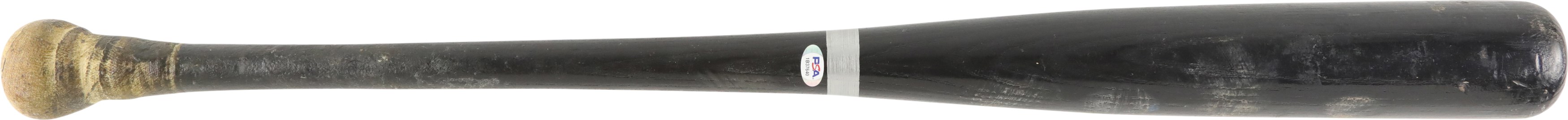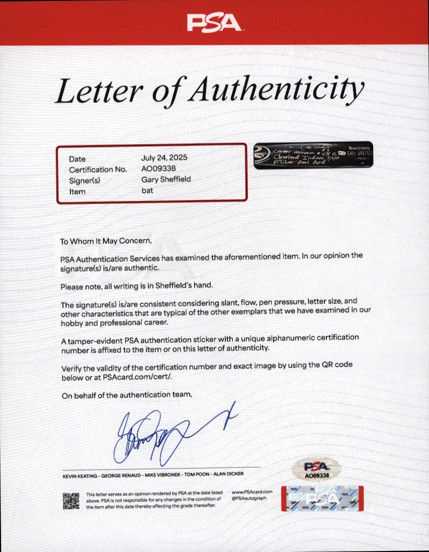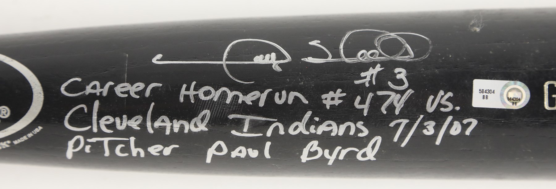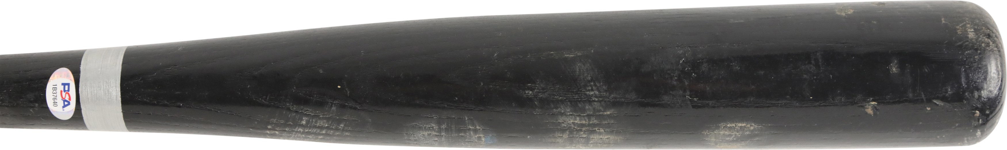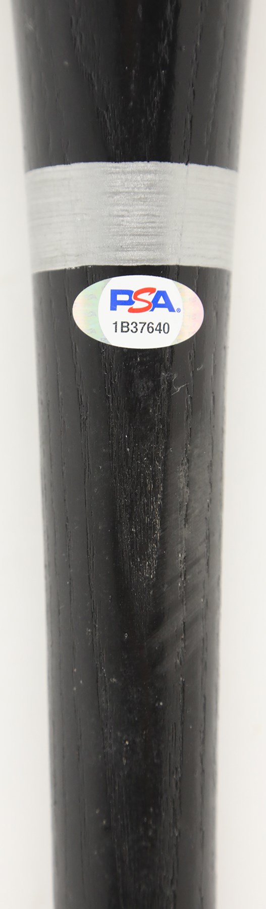 2007 Gary Sheffield Detroit Tigers signed and inscribed game used bat. Black Rawlings Model 170B ash bat measures 34.5" and weighs 33.9 ounces. Bat is uncracked and use is displayed with evidence of pine tar (or other sticky residue) on the handle, a few small indentations, and prominent ball marks on the barrel. White cloth tape has been used to create a bubble knob, with a line of silver writing poking through the middle; numbers 3 and 11 are on the barrel end in silver Sharpie. Autographed between the barrel and trademark in 7-8/10 silver Sharpie along with uniform number 3 and lengthy inscription - "Career Home Run #474 vs Cleveland Indians 7/3/07 - Pitcher Paul Byrd." A 5-time Silver Slugger winner, Sheffield was considered one of the premier power hitters in his era, amassing 509 career homers for eight different teams over his 22-year tenure, and he is one of just 28 players all-time to eclipse the 500-home run plateau. Comes with full PSA LOA, with the bat earning a grade of PSA/DNA GU 10; also included is a separate PSA LOA verifying that the signature and inscription are authentic, and the lot includes both a Sheff and MLB hologram on the front barrel.