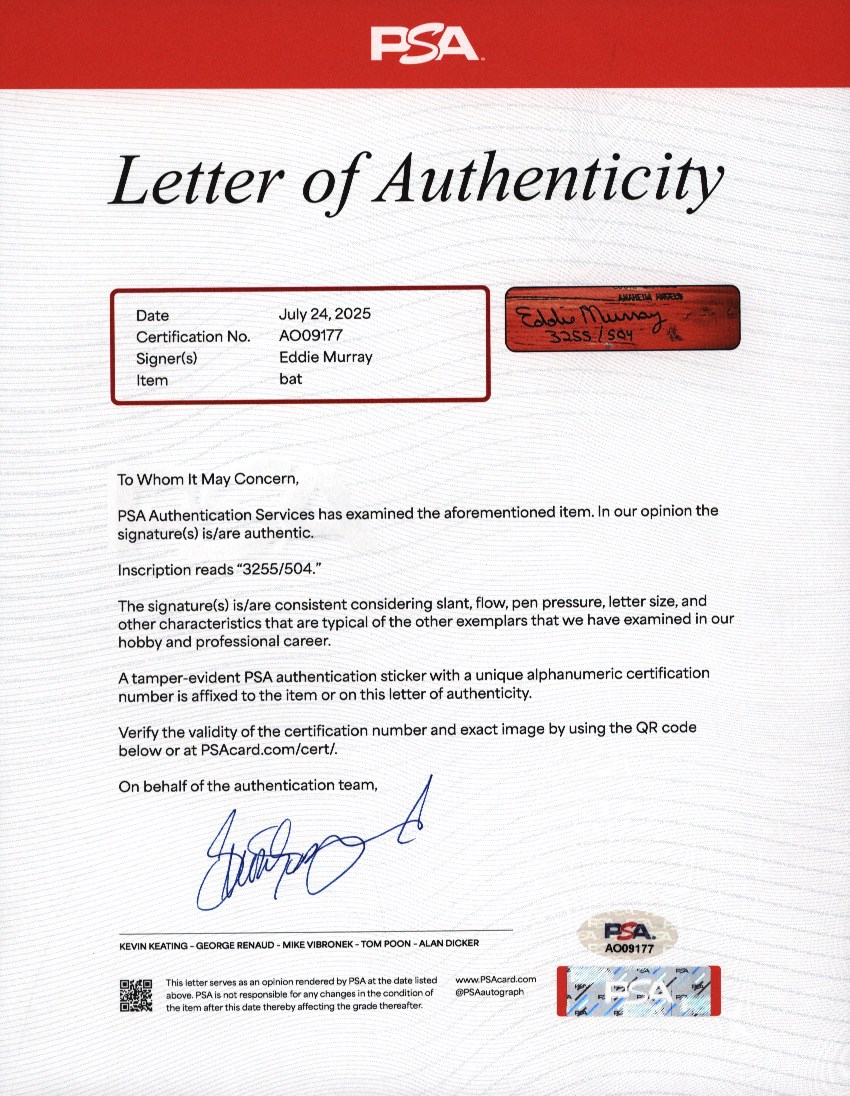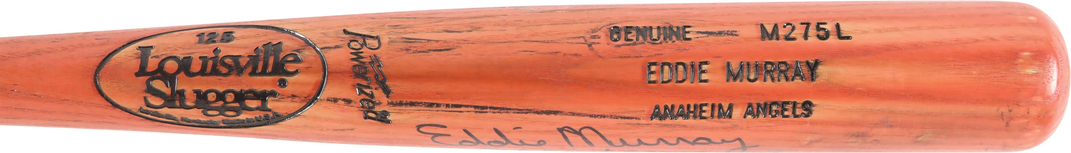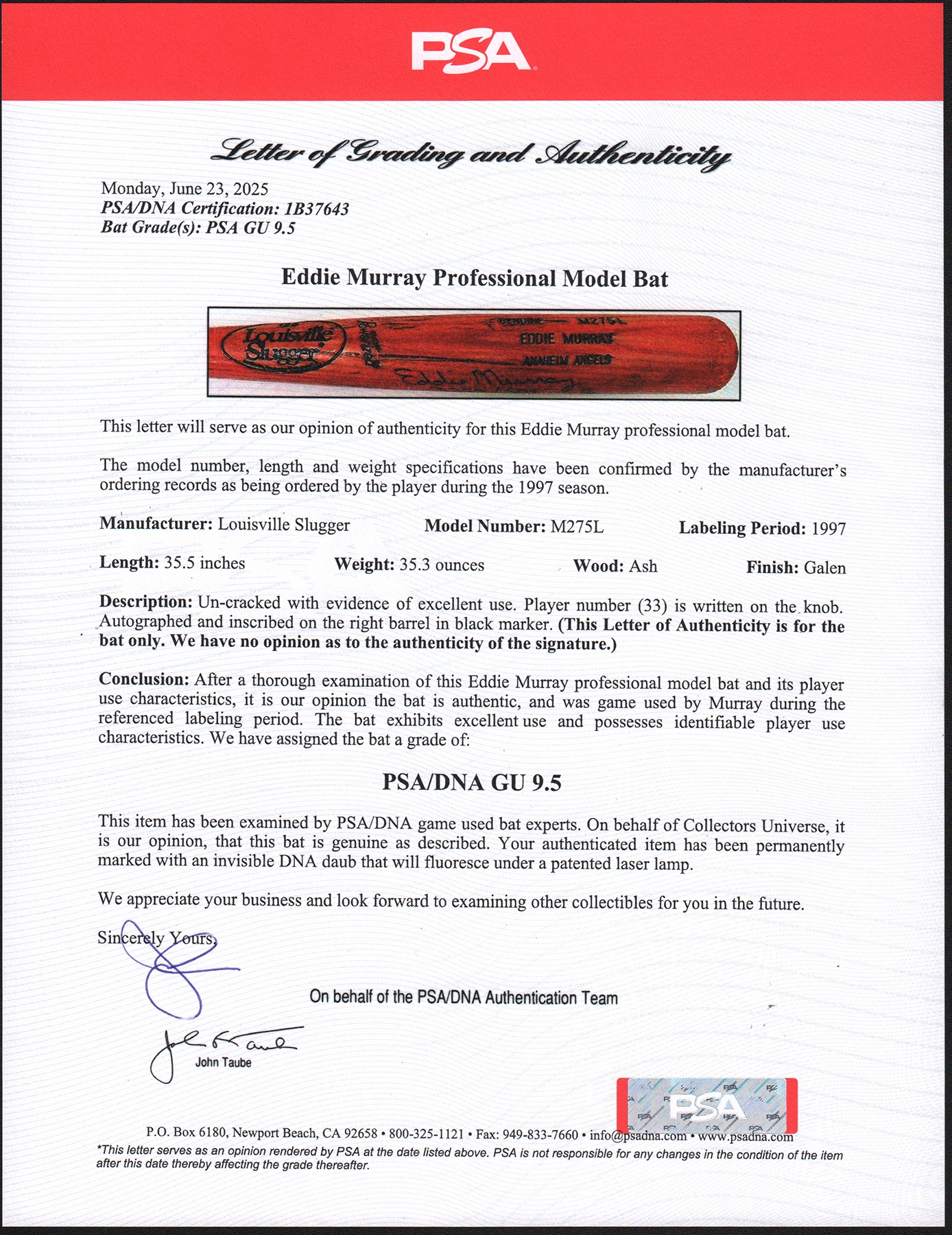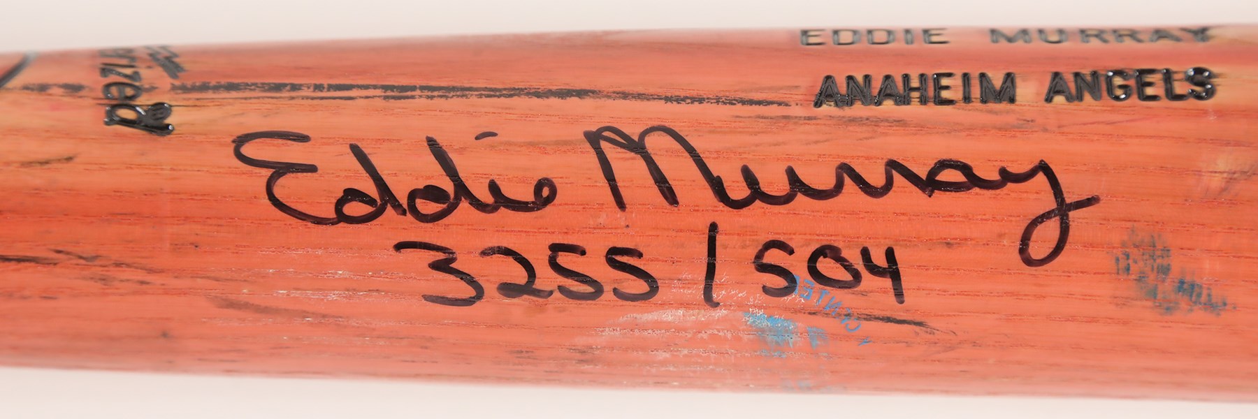1997 Eddie Murray Anaheim Angels signed game used bat with inscription. Beautiful orange Galen finish Louisville Slugger model M275L measures 35.5" and weighs 35.30 ounces. Bat is uncracked and excellent use is displayed with several ball ink transfers, bat rack paint transfers, and nice overall wear. Number 33 is written on the knob in black Sharpie outlined in silver, and it is autographed in superb 9/10 black Sharpie between trademark and barrel stamp, with "3255/504" (career hits/home runs) written below. Known for his power as a member of the exclusive 500-Home Run Club, the Hall of Famer was also a stellar defender, earning three Gold Glove Awards. The 1997 season was the last of Steady Eddie's 21-year MLB stint, and having appeared in just 55 games total (46 with the Angels), this stands as one of his final gamers. Comes with full LOA from PSA, with the bat earning a grade of PSA/DNA GU 9.5, and separate full LOA from PSA for the signature.