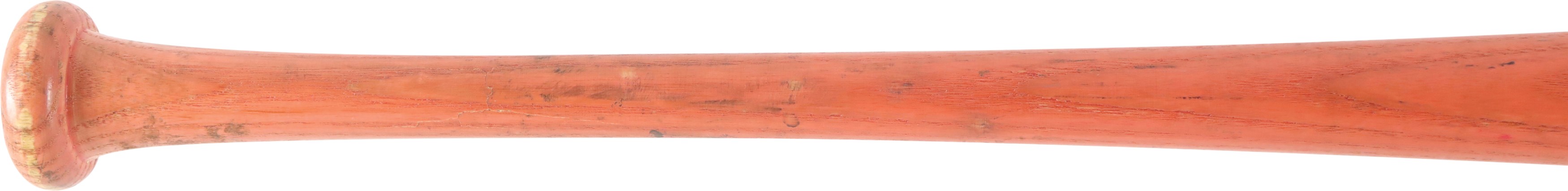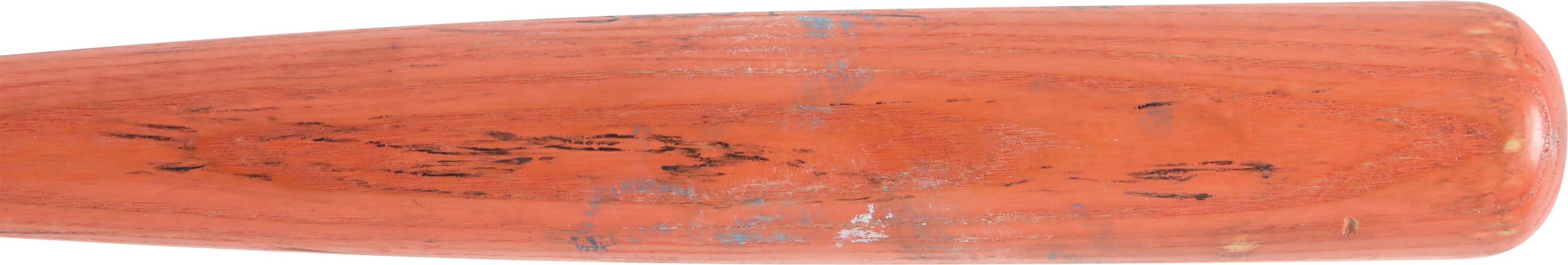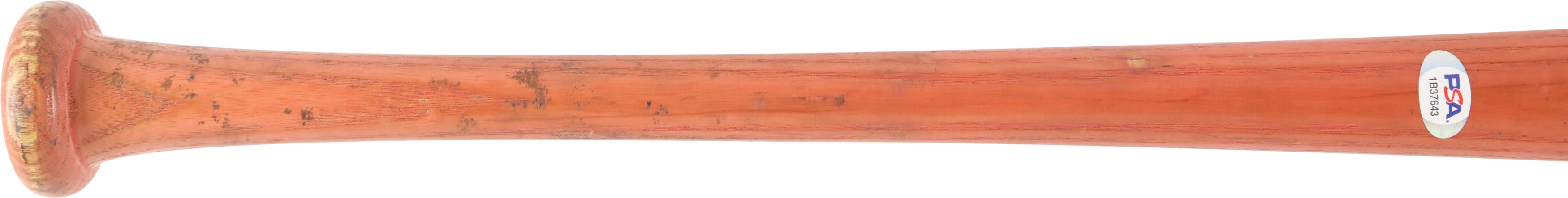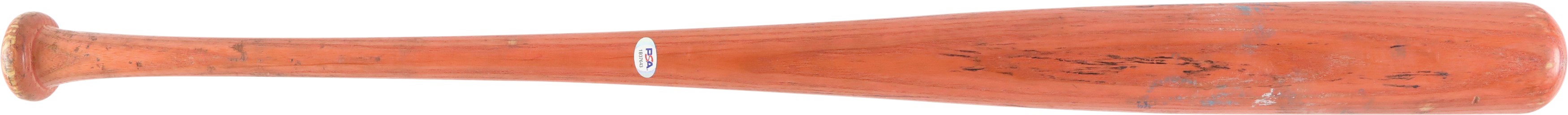 1997 Eddie Murray Anaheim Angels signed game used bat with inscription. Beautiful orange Galen finish Louisville Slugger model M275L measures 35.5" and weighs 35.30 ounces. Bat is uncracked and excellent use is displayed with several ball ink transfers, bat rack paint transfers, and nice overall wear. Number 33 is written on the knob in black Sharpie outlined in silver, and it is autographed in superb 9/10 black Sharpie between trademark and barrel stamp, with "3255/504" (career hits/home runs) written below. Known for his power as a member of the exclusive 500-Home Run Club, the Hall of Famer was also a stellar defender, earning three Gold Glove Awards. The 1997 season was the last of Steady Eddie's 21-year MLB stint, and having appeared in just 55 games total (46 with the Angels), this stands as one of his final gamers. Comes with full LOA from PSA, with the bat earning a grade of PSA/DNA GU 9.5, and separate full LOA from PSA for the signature.