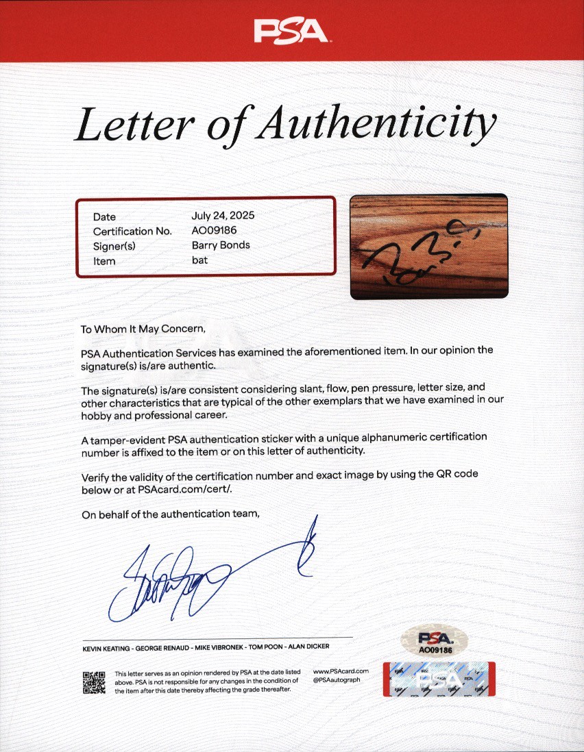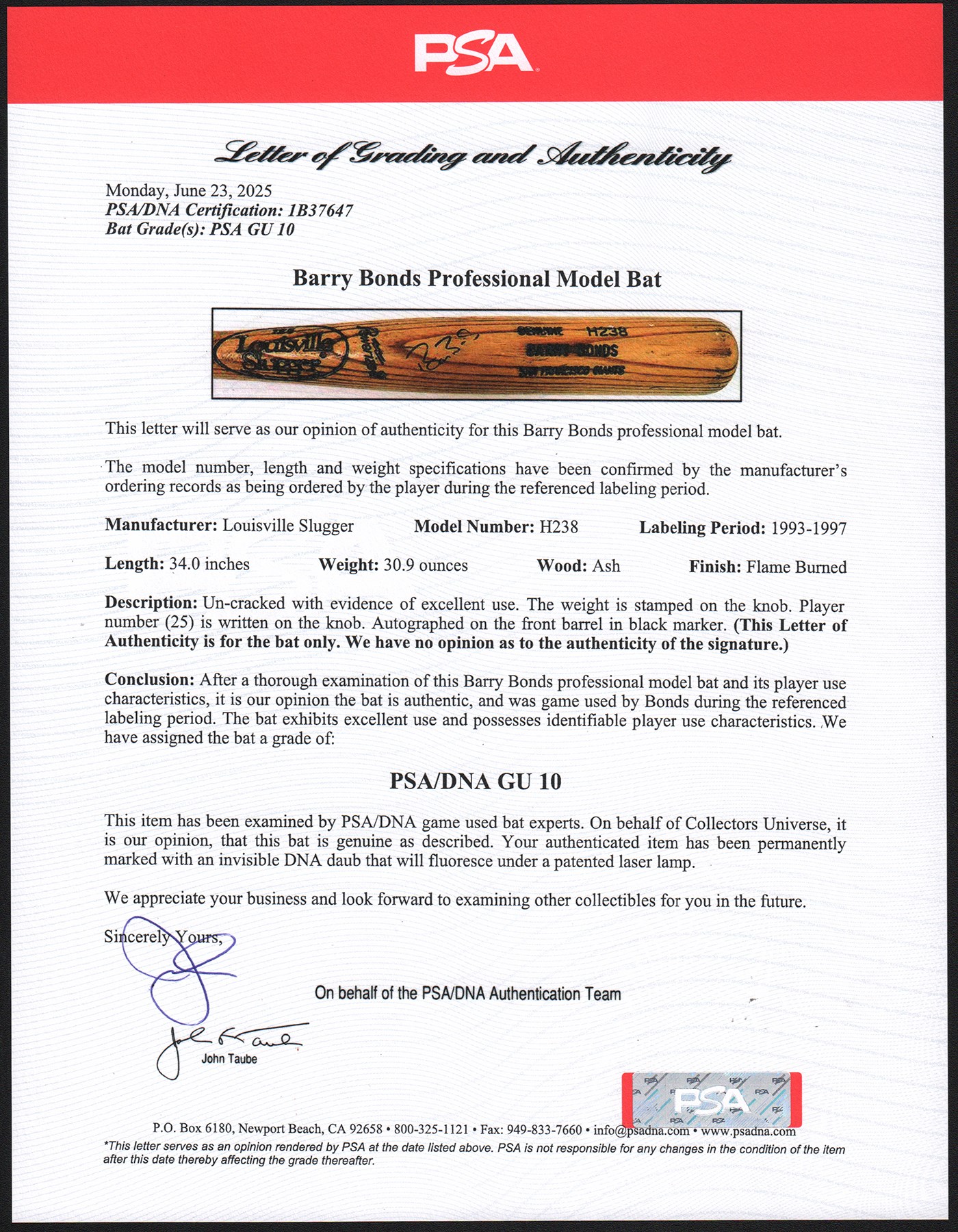 Lot # 605: 1993-1997 Barry Bonds Signed Game Used Bat (PSA GU 10)