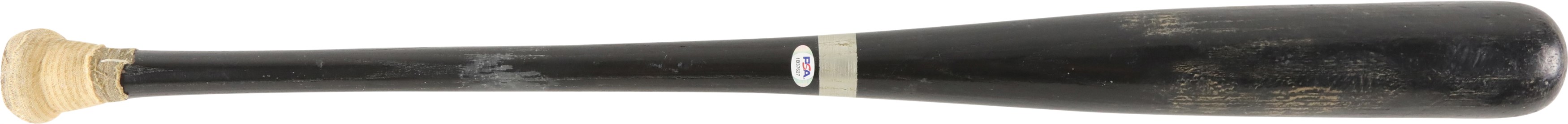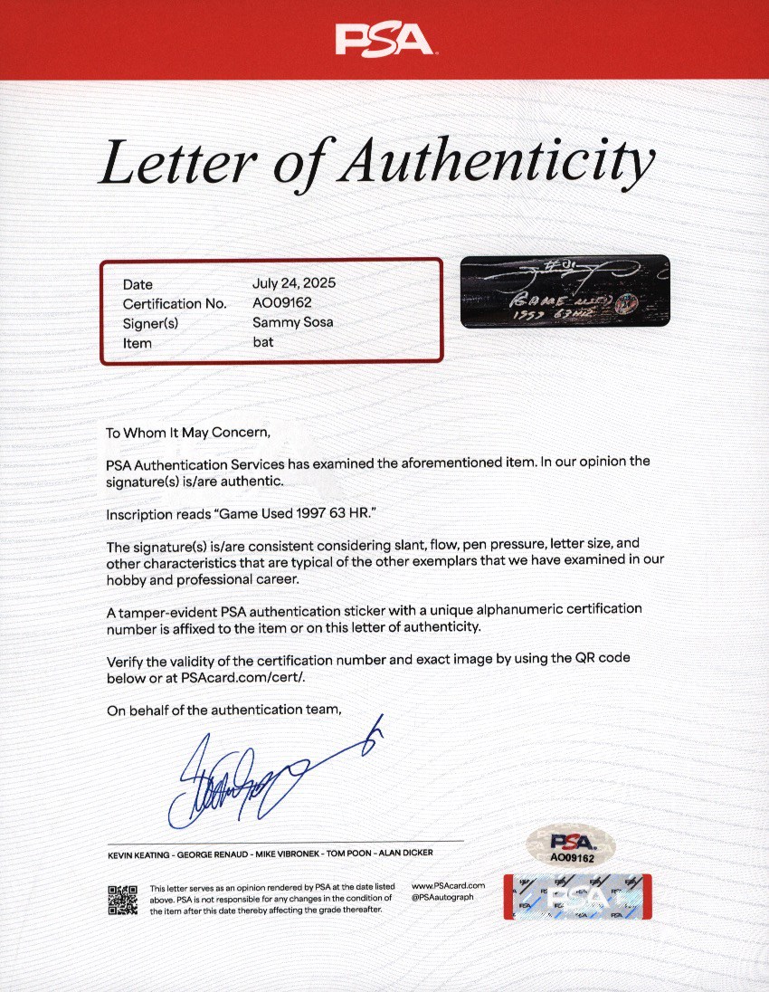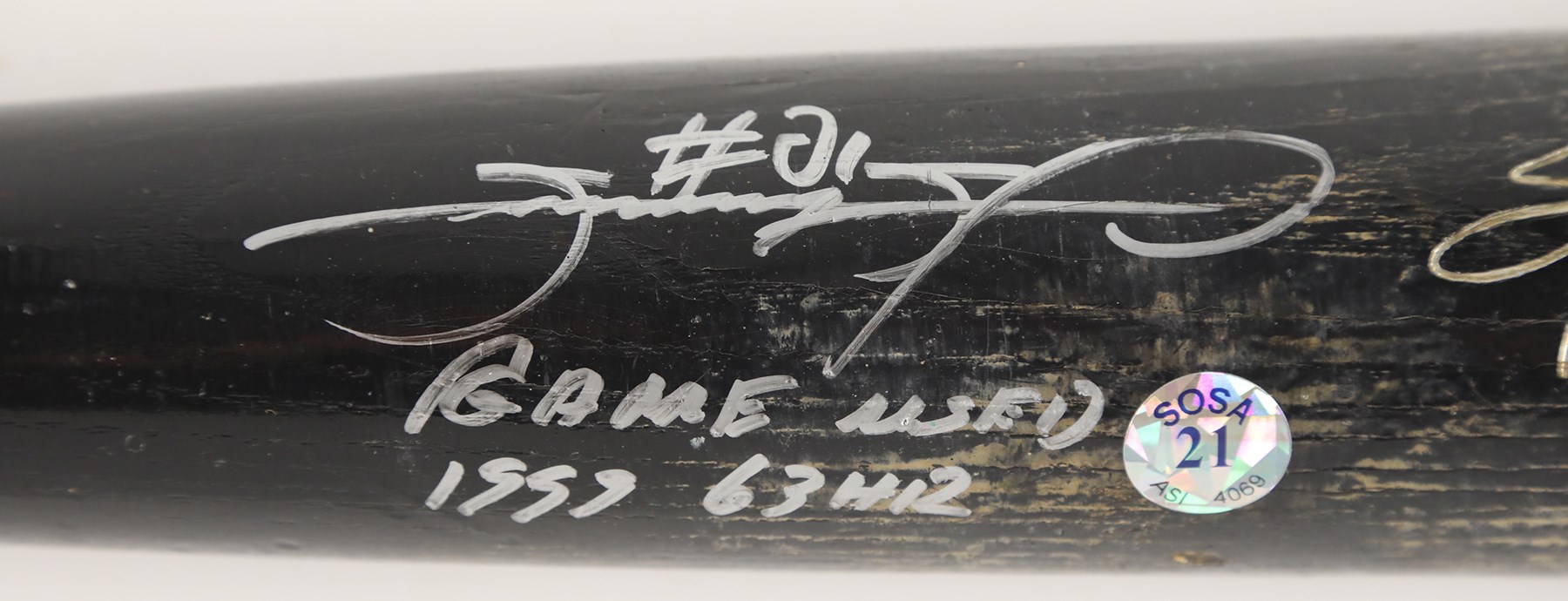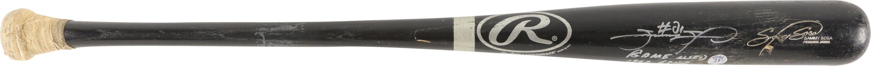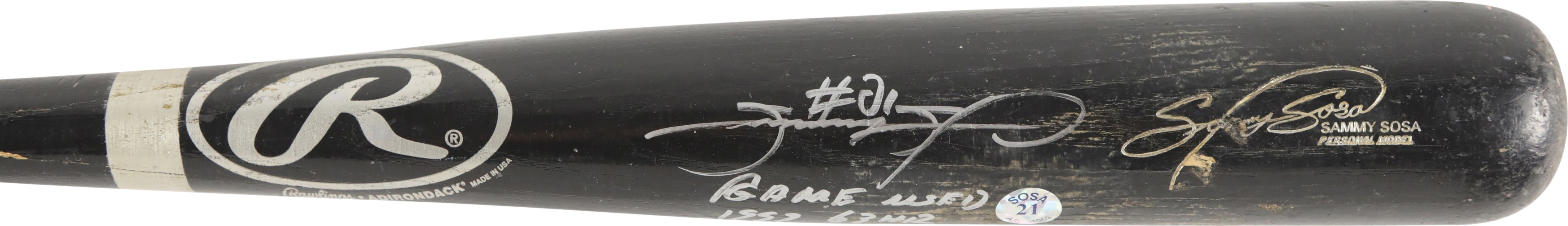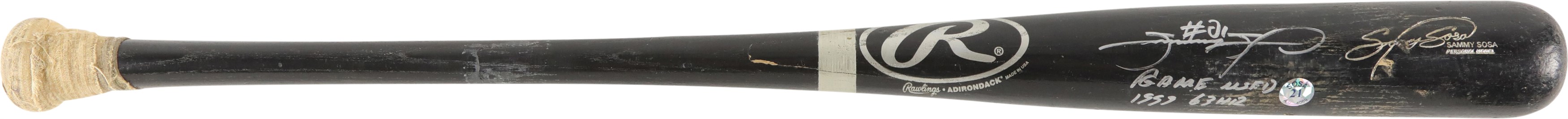 1999 Sammy Sosa Chicago Cubs signed game used bat with inscription. Black Rawlings model 170B ash bat measures 34.5" and weighs 32.4 ounces. Outstanding use displayed includes a repaired handle crack, and scuffs and general wear to the black finish, with some residue on the handle. White cloth tape creates Sosa's patented bubble knob with "170B" and additional stamped numbers visible between the tape. This fine specimen is autographed between trademark and barrel stamp in 8/10 silver Sharpie; also written is his #21, along with "1999 63 HR." Slammin' Sammy did, in fact, crash 63 homers in the '99 season to earn one of his six Silver Slugger awards, and his 609 career round-trippers is currently 9th on MLB's All-Time list. Comes with full PSA LOA, with the bat earning a grade of PSA/DNA GU 9, as well as a full LOA from PSA for the signature. Also comes with Sosa holo.