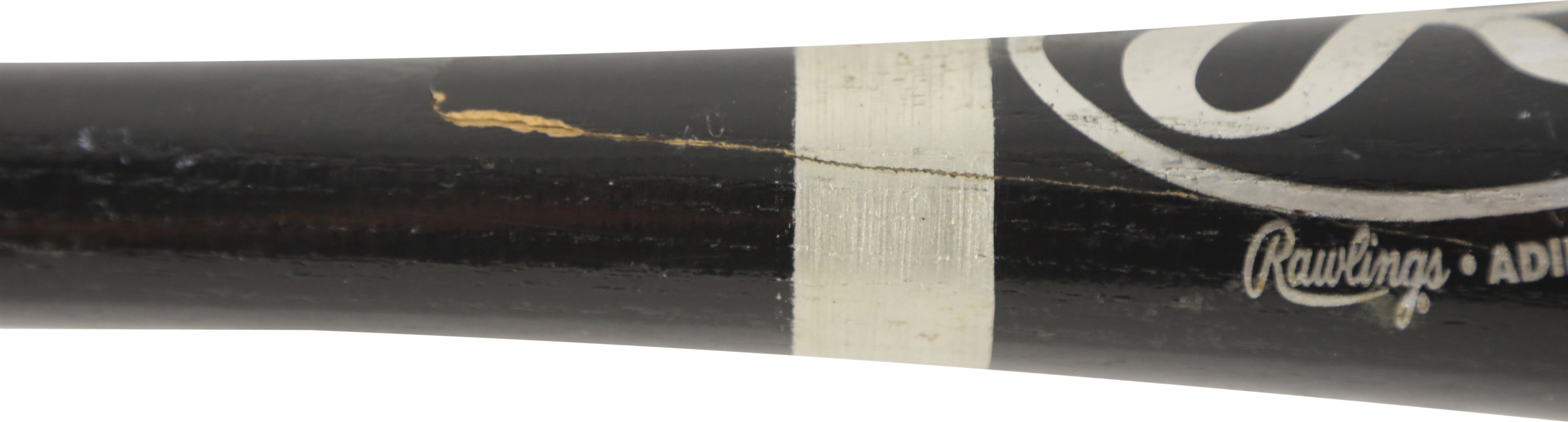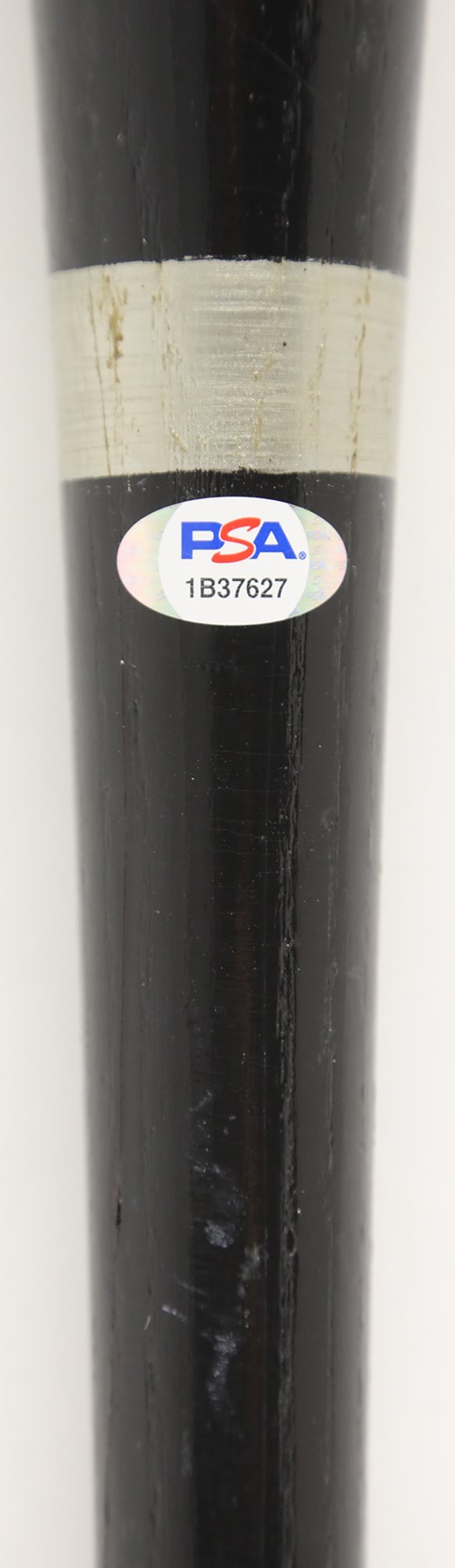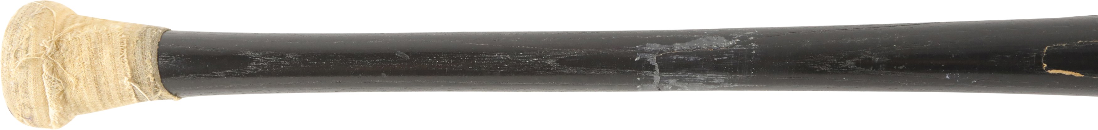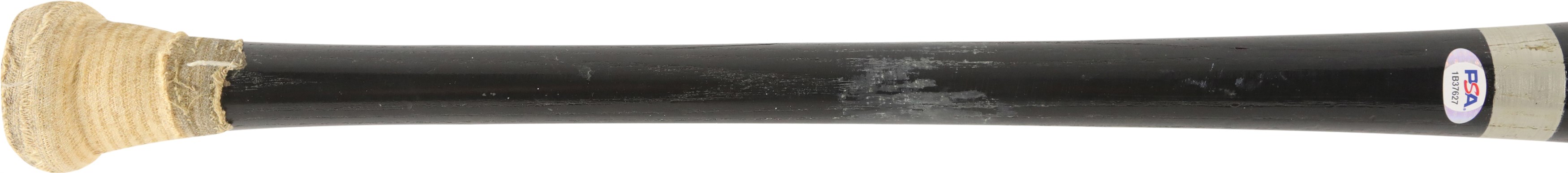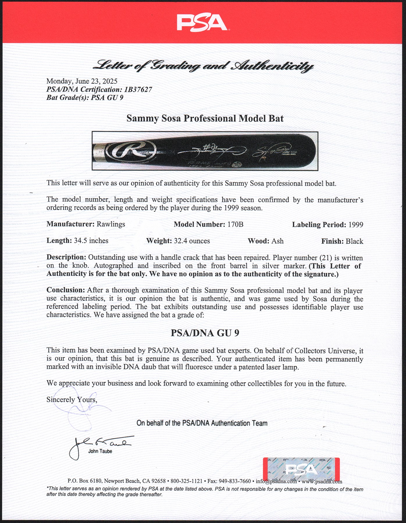 1999 Sammy Sosa Chicago Cubs signed game used bat with inscription. Black Rawlings model 170B ash bat measures 34.5" and weighs 32.4 ounces. Outstanding use displayed includes a repaired handle crack, and scuffs and general wear to the black finish, with some residue on the handle. White cloth tape creates Sosa's patented bubble knob with "170B" and additional stamped numbers visible between the tape. This fine specimen is autographed between trademark and barrel stamp in 8/10 silver Sharpie; also written is his #21, along with "1999 63 HR." Slammin' Sammy did, in fact, crash 63 homers in the '99 season to earn one of his six Silver Slugger awards, and his 609 career round-trippers is currently 9th on MLB's All-Time list. Comes with full PSA LOA, with the bat earning a grade of PSA/DNA GU 9, as well as a full LOA from PSA for the signature. Also comes with Sosa holo.