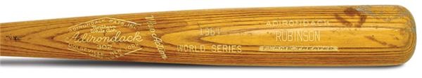 It is with extreme pleasure that we offer this most momentous of game used bats. A real beauty, it is a 1961 World Series Adirondack 194VP wielded by one of the most underrated baseball greats in history. Frank Robinson, “The Judge” is arguably the greatest living player. Does Triple Crown winner, World Series MVP, AL MVP & NL MVP mean anything to you? It means an awful lot to us. And he has the offensive power numbers to match – 586HR, 1812RBI, 2943 hits… we could go on. But what makes this bat so special is that it was used for the 1961 World Series – one of the most memorable Series in baseball history and one of the most unforgettable seasons. Robinson led the Reds to their first pennant since 1940, only to fall to the unstoppable New York Yankees, powered by Roger Maris & Mickey Mantle, made almost unhittable by Whitey Ford. This large piece of lumber shows light use from the 1961 World Series, stamped “1961 World Series” on the barrel. A true classic.