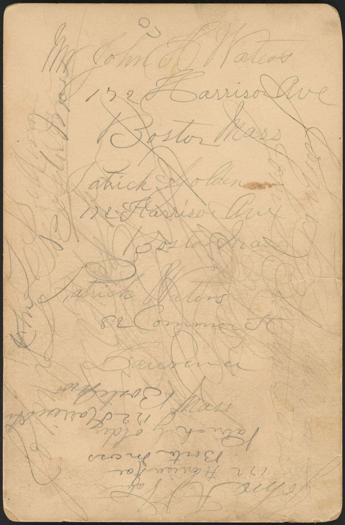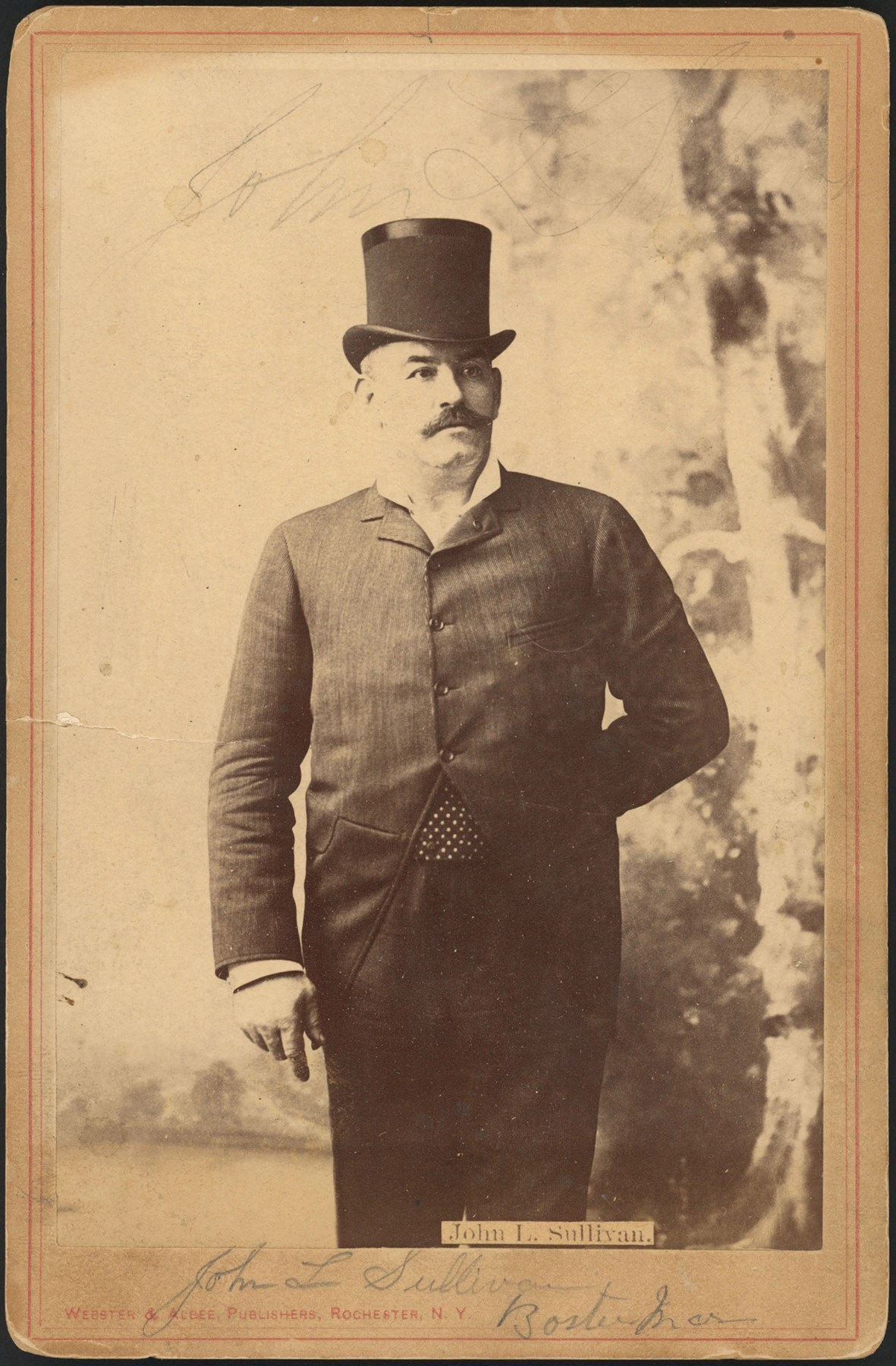 Original cabinet-card photograph capturing former heavyweight boxing champion John L. Sullivan. The formal studio photograph pictures Sullivan in formal attire as he poses for the camera. Sullivan's name is printed in black lettering at the base of the photo. The photographer's credit, "Webster & Albee, Publishers, Rochester, N. Y.," appears in print along the base of the mount. Sullivan's name is scripted in pencil (in an unknown hand) both at the top of the photo and the base of the mount. Numerous handwritten pencil notations and names appear on the reverse. Both the mount (4.25x6.5") and the photo (3.75x5.75") display an approximate one-inch horizontal tear near the middle of the left border. Light wear is evident along the edges of the mount.