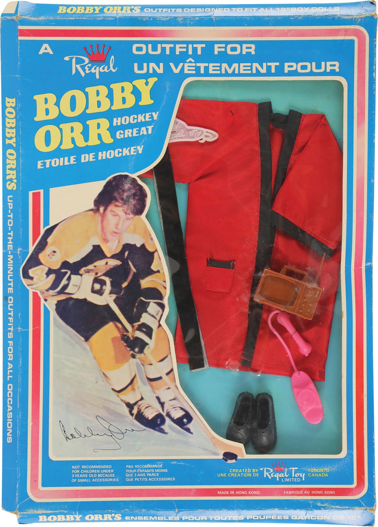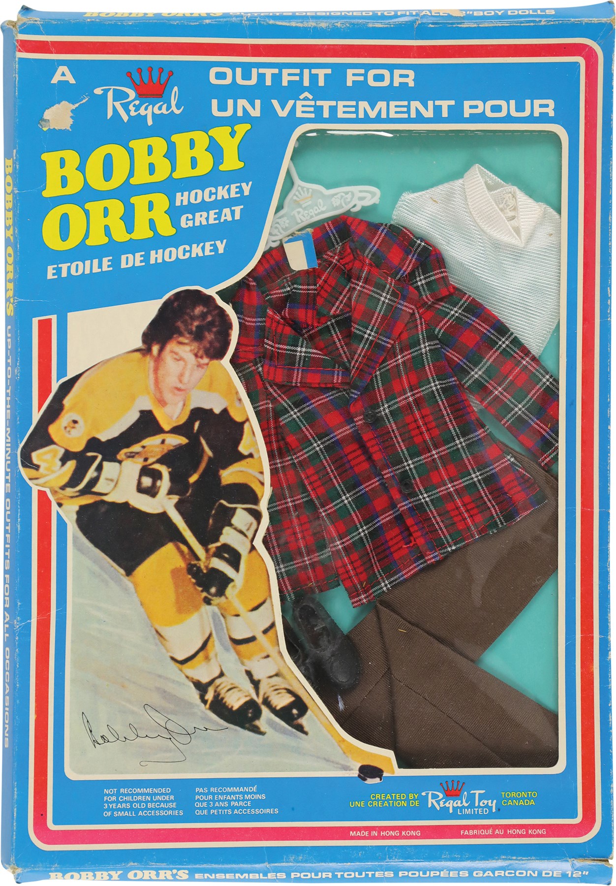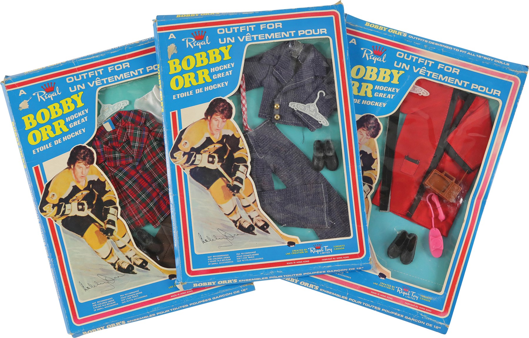 During an era when G.I. Joe, Barbie, and other action figures were all the rage among kids, Royal Toy, a Canadian company, decided to cater to young hockey fans with a Bobby Orr doll. Like his more popular counterparts, the Bobby Orr doll had various outfits, which could be purchased separately. Offered here are three rare Bobby Orr outfits, each still housed in its original retail packaging. Each box (9x13") features a photo of Orr on the front, while the reverse pictures each of the twelve different Bobby Orr outfits available to patrons. Each outfit is complete as issued and remains in Mint condition. Each box displays moderate wear, with flattened edges, but features the original cellophane on the front. The cellophane on the box housing the robe displays two tiny tears, otherwise all the cellophane remains intact and complete.