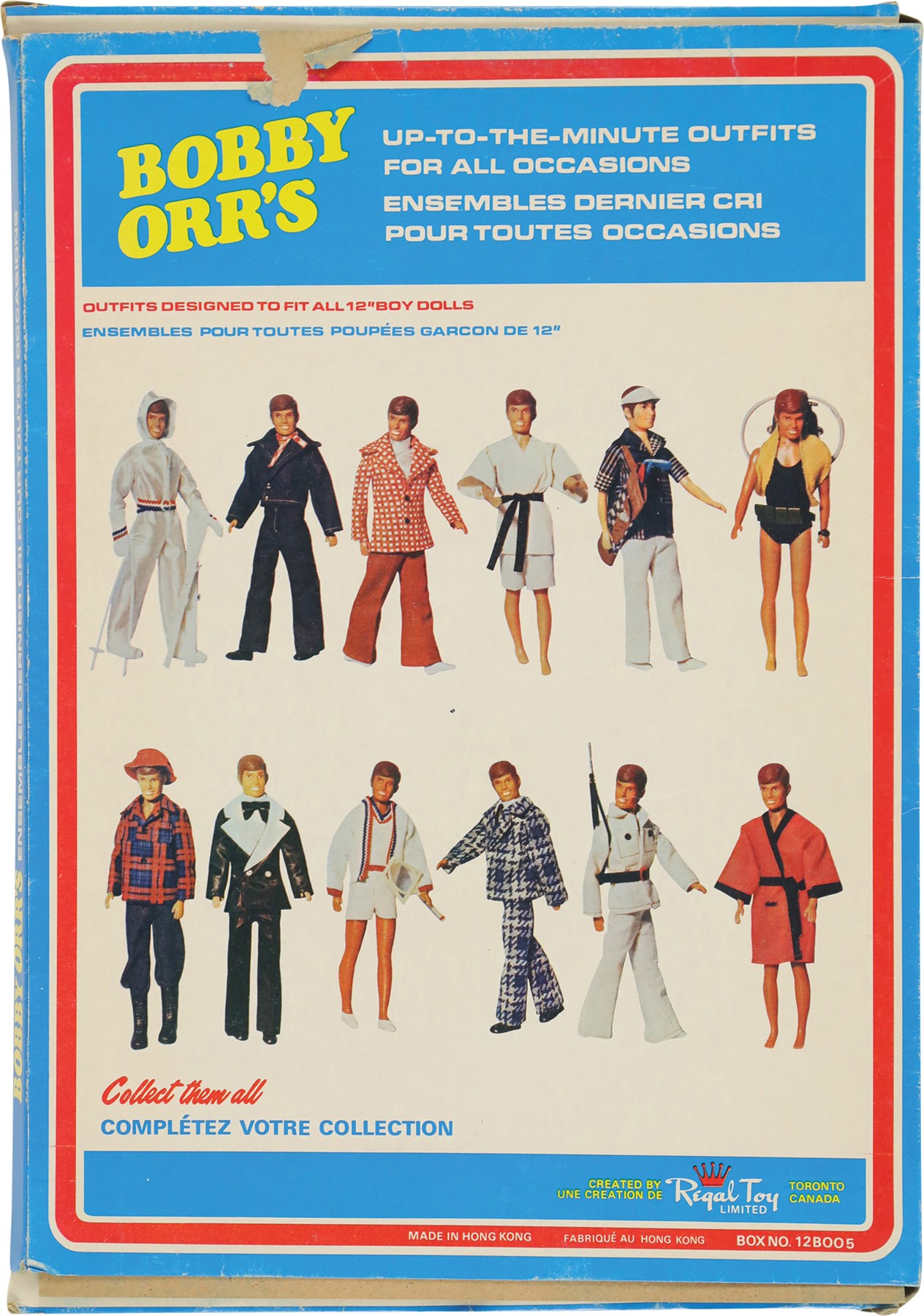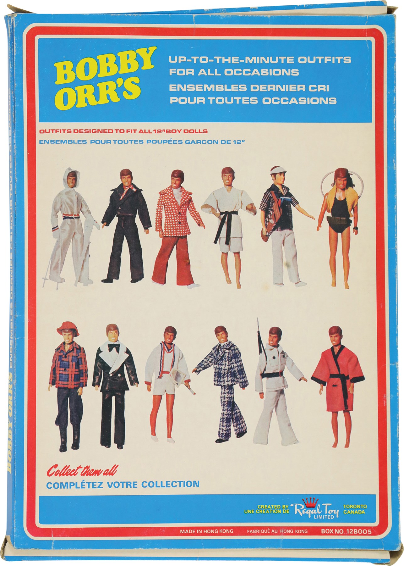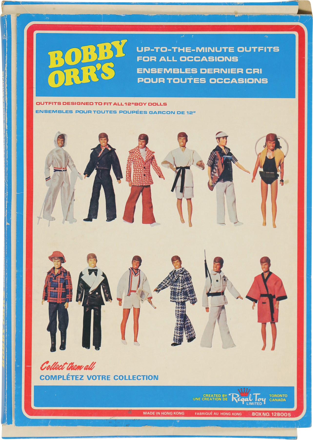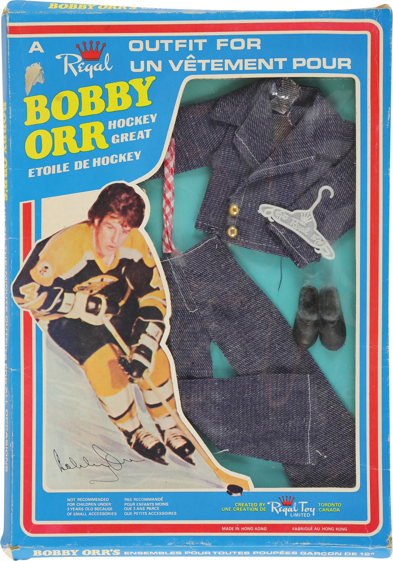 During an era when G.I. Joe, Barbie, and other action figures were all the rage among kids, Royal Toy, a Canadian company, decided to cater to young hockey fans with a Bobby Orr doll. Like his more popular counterparts, the Bobby Orr doll had various outfits, which could be purchased separately. Offered here are three rare Bobby Orr outfits, each still housed in its original retail packaging. Each box (9x13") features a photo of Orr on the front, while the reverse pictures each of the twelve different Bobby Orr outfits available to patrons. Each outfit is complete as issued and remains in Mint condition. Each box displays moderate wear, with flattened edges, but features the original cellophane on the front. The cellophane on the box housing the robe displays two tiny tears, otherwise all the cellophane remains intact and complete.