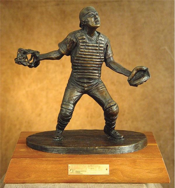 Only the best of the best could be deemed worthy of such a fine masterpiece. Only baseball’s most prolific hitting catcher, the greatest catcher of all time, whose superior skills as backstop for the Big Red Machine of the 1970’s propelled the Cincinnati Reds to become the most dominant team of the decade. Only Johnny Bench. When the Cincinnati Reds commissioned Bob Scriver to create this sculpture entitled, The Catcher, they knew they had chosen the perfect man for the job. A renowned taxidermist and sculptor, who has won several gold medals in the Cowboy Artists of America shows, Bob Scriver has mastered the illusion of movement in his pieces. Some of his pieces now sell for over $20,000 in the secondary market. Standing approx. 12” tall, Bench’s sculpture is an active representation as he holds his facemask in his right hand behind him, knees bent, and mitt out in front of him chasing a fly ball. Incredible craftsmanship is evident in every detail, down to the engraved “Bench 5” on the back of his shirt. He stands on a walnut wood base with a gold plate on the front, engraved with “The Catcher Johnny Bench, Cincinnati Reds Bob Scriver, Sculptor”. Under the statue’s feet is a circular bronze stand (about .75” thick) with engraved, “The Catcher” on the front and “copyright Bob Scriver 1980 [limited edition #] 56/100” towards the back. A significant work of art, which has thrust Bob Scriver’s career into a whole new realm. Issue price for The Catcher back in 1980 was $1,000. LOA.