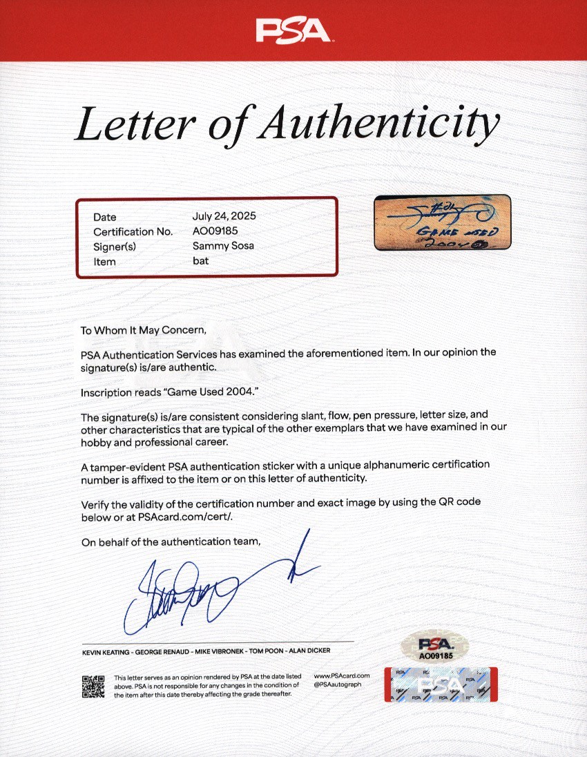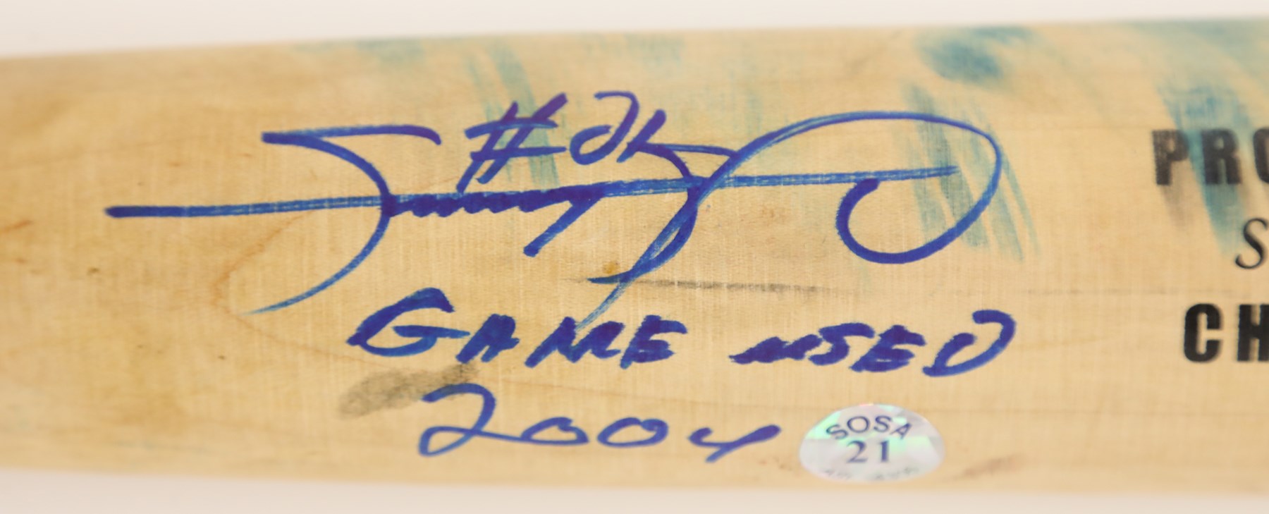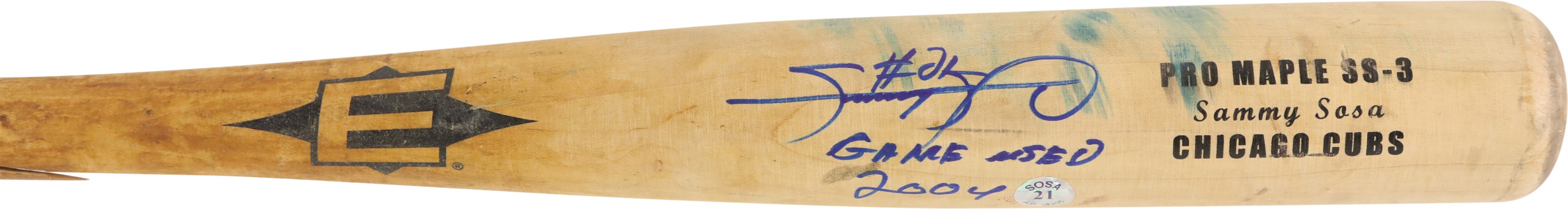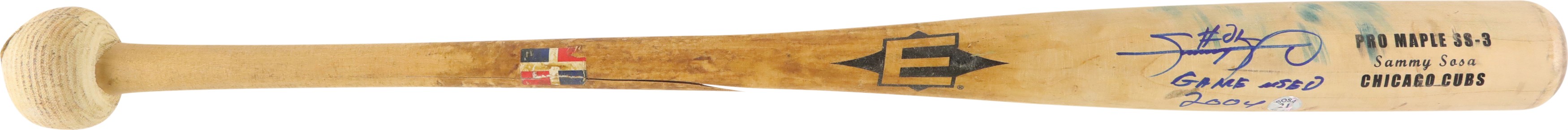 2004 Sammy Sosa Chicago Cubs signed game used bat with inscription. Easton model SS3 maple bat measures 35.25" and weighs 36.2 ounces. Outstanding use is evident including a handle crack, clear ball ink impressions, and pine tar throughout the handle; the pine-tar also covers a stamp or sticker of the flag of the Dominican Republic, which is split through as part of the crack. The knob bears Sammy's distinctive white cloth tape bubble, and written in black marker on the barrel end is "SS3 - 21 - 34.5 32" (note that the last numbers are bat measurements before the addition of the knob tape, as reflected in the LOA). It is autographed between barrel stamp and trademark in crisp 8-9/10 blue Sharpie along with his #21; written below is "Game Used 2004." That 2004 season was the last of Sosa's legendary 13 yrs in the Windy City, during which he accumulated 545 of his 609 career homers. Comes with full LOA from PSA, with the bat earning a grade of PSA/DNA GU 9, and comes with separate PSA LOA for the autograph as well as a Sosa holo.