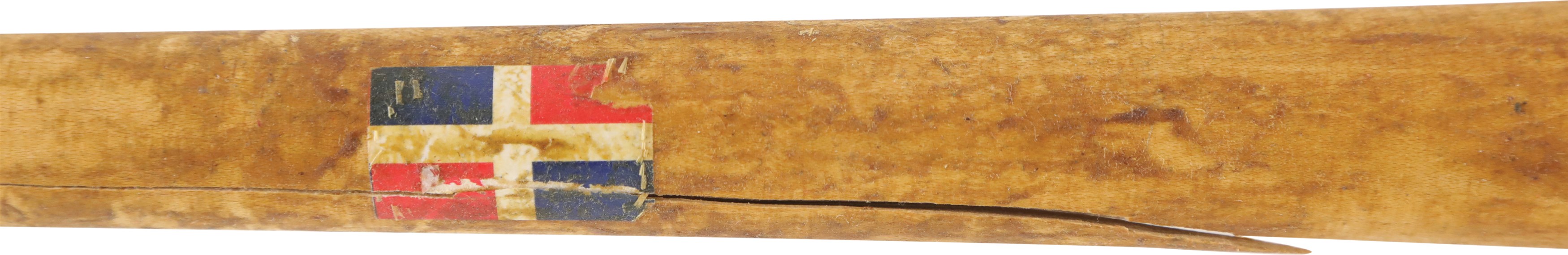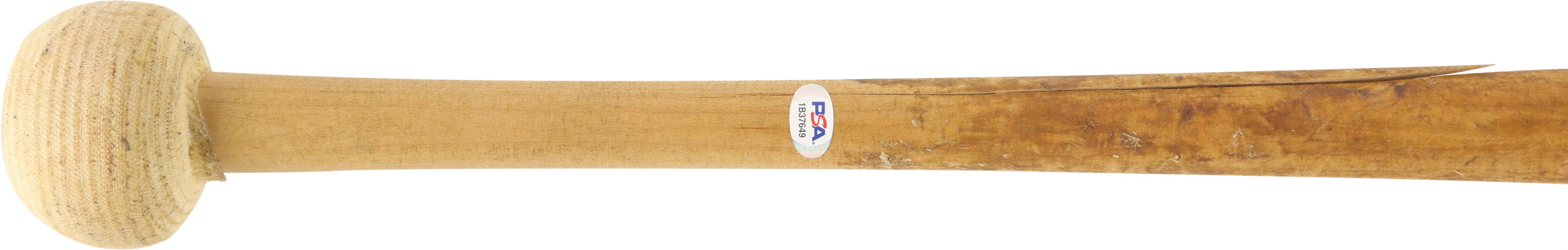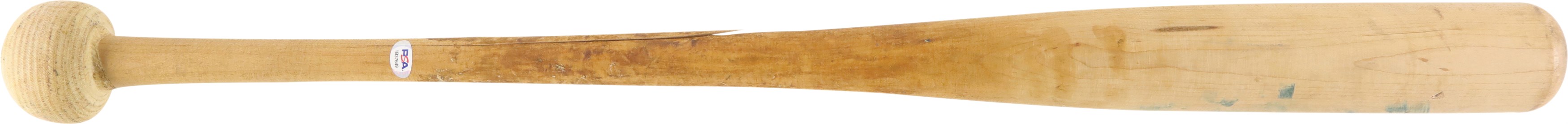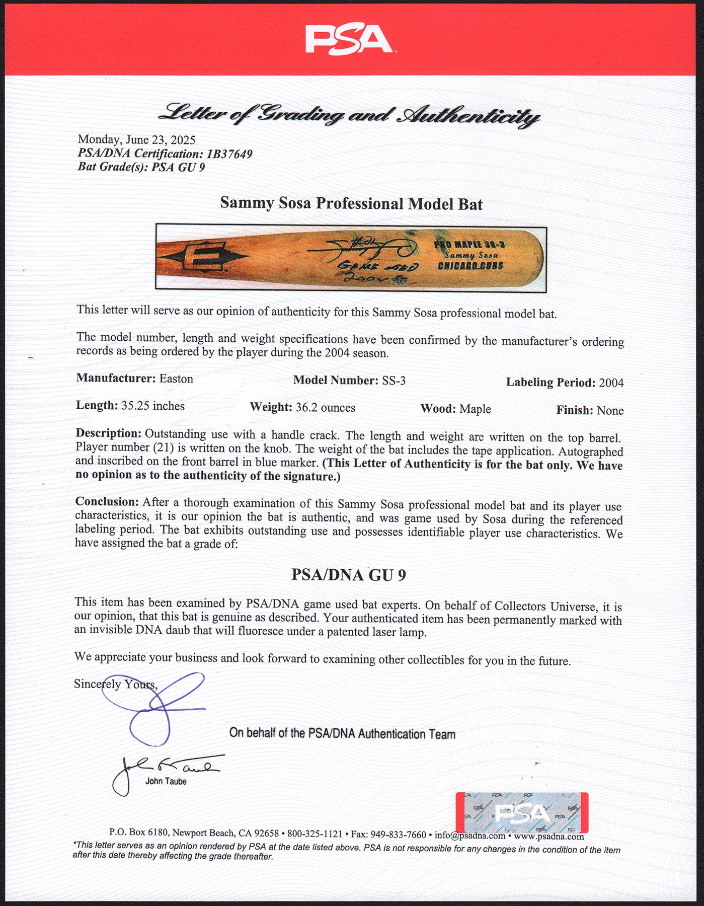 2004 Sammy Sosa Chicago Cubs signed game used bat with inscription. Easton model SS3 maple bat measures 35.25" and weighs 36.2 ounces. Outstanding use is evident including a handle crack, clear ball ink impressions, and pine tar throughout the handle; the pine-tar also covers a stamp or sticker of the flag of the Dominican Republic, which is split through as part of the crack. The knob bears Sammy's distinctive white cloth tape bubble, and written in black marker on the barrel end is "SS3 - 21 - 34.5 32" (note that the last numbers are bat measurements before the addition of the knob tape, as reflected in the LOA). It is autographed between barrel stamp and trademark in crisp 8-9/10 blue Sharpie along with his #21; written below is "Game Used 2004." That 2004 season was the last of Sosa's legendary 13 yrs in the Windy City, during which he accumulated 545 of his 609 career homers. Comes with full LOA from PSA, with the bat earning a grade of PSA/DNA GU 9, and comes with separate PSA LOA for the autograph as well as a Sosa holo.
