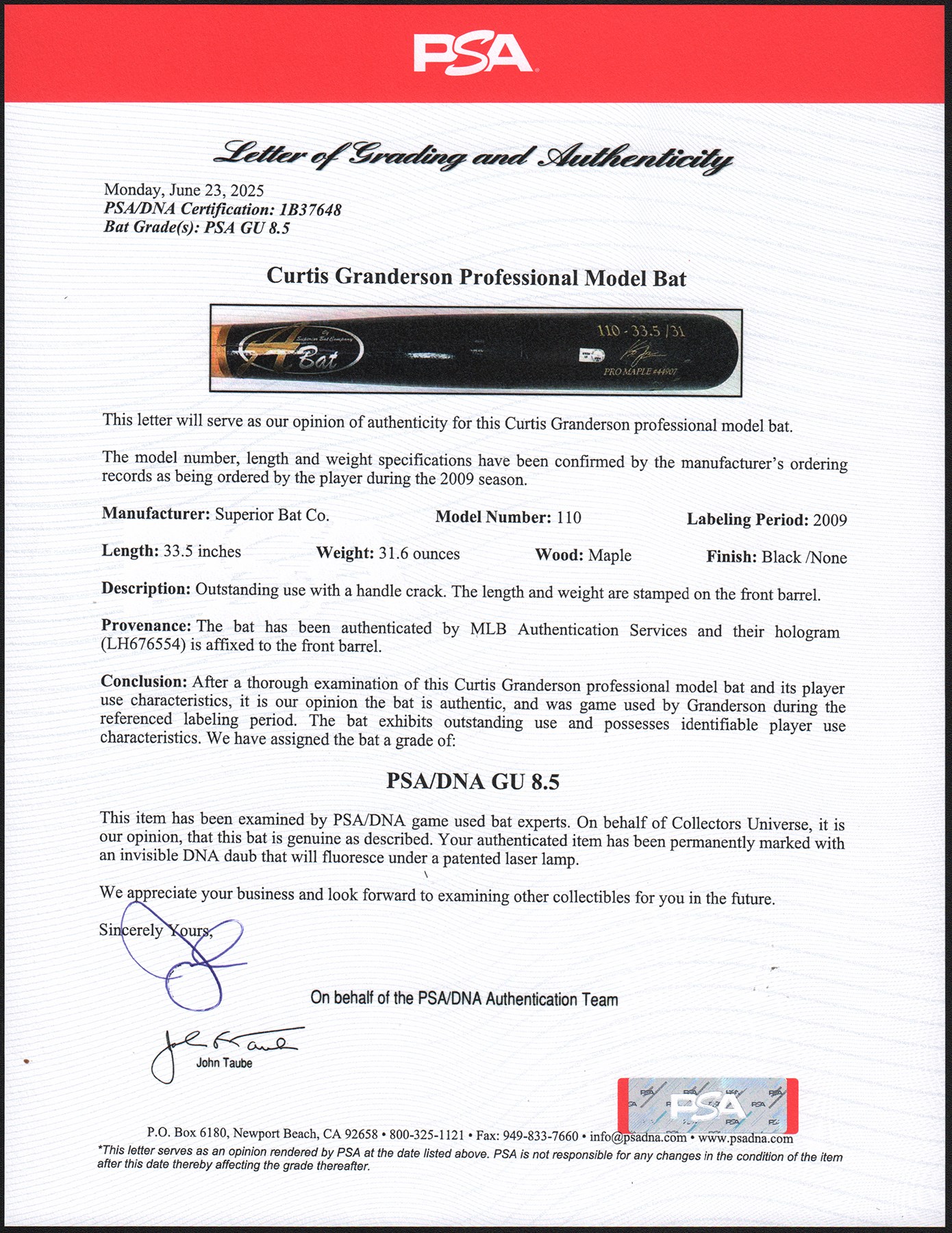 Lot # 630: 2009 Curtis Granderson Detroit Tigers Game Used Bat (PSA GU 8.5)