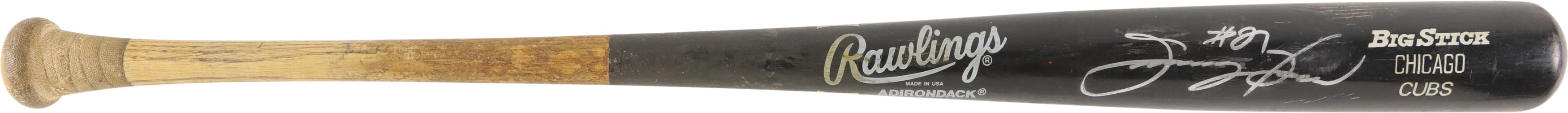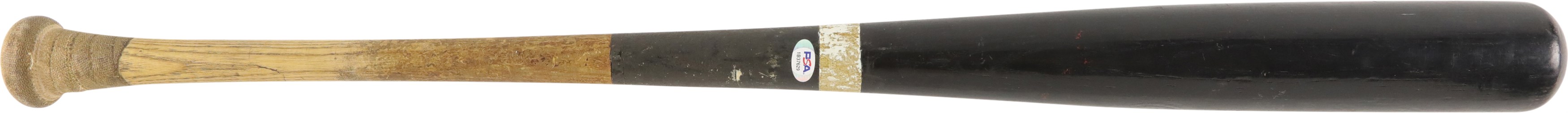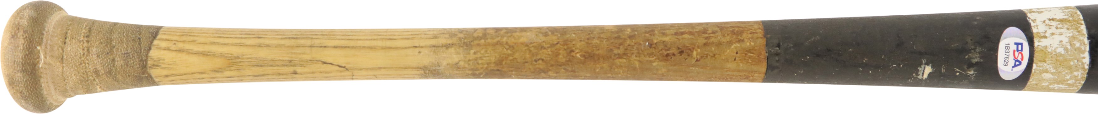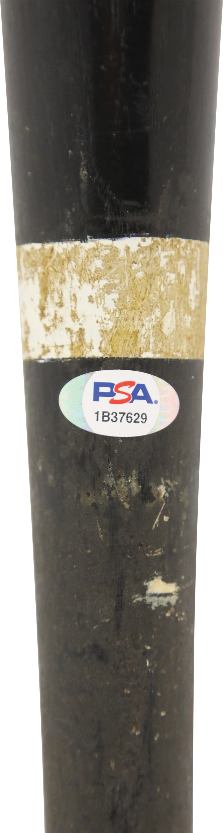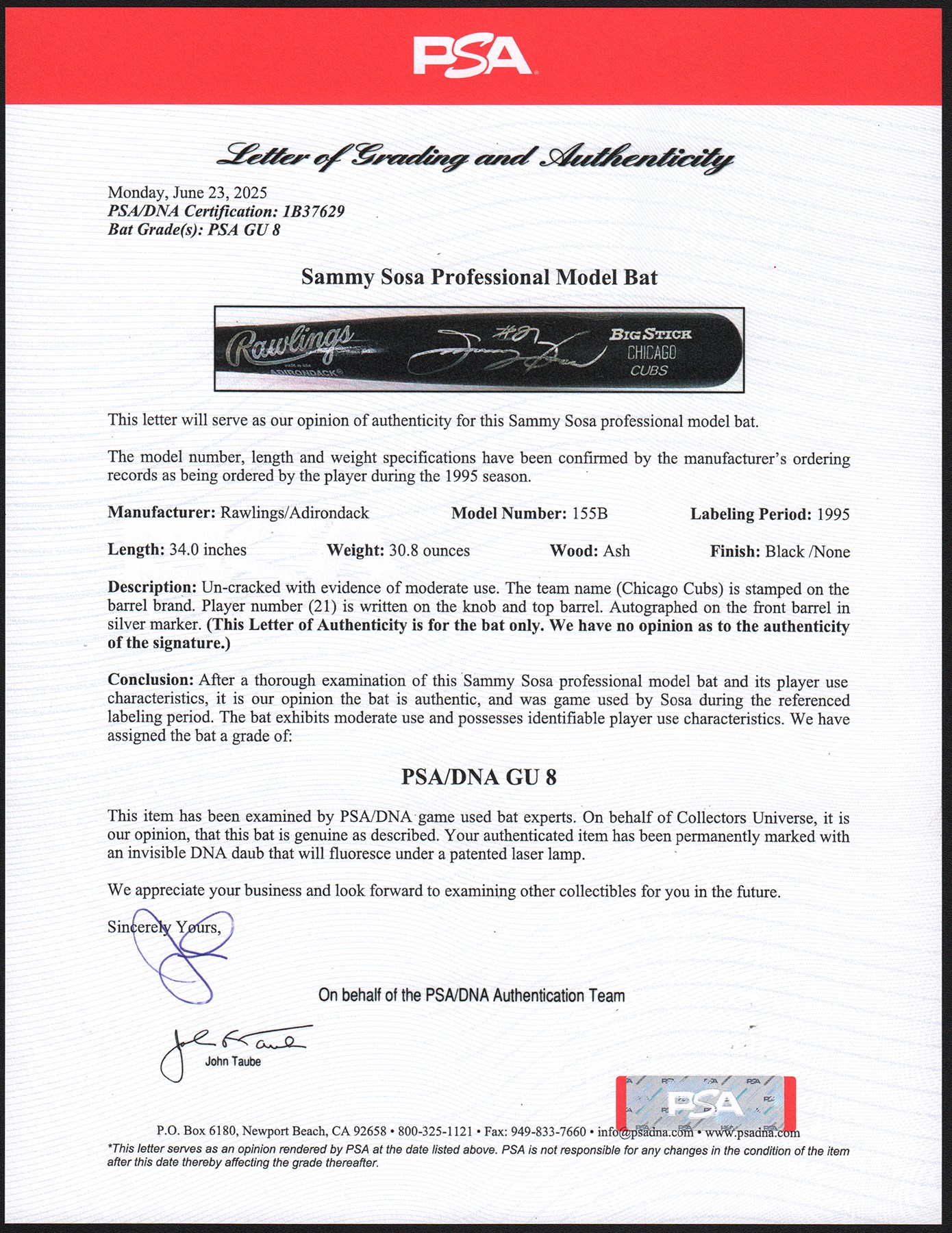 1995 Sammy Sosa Chicago Cubs signed game used bat. Natural handle and black barrel Rawlings/Adirondack model 155B ash bat measures 34.0" and weighs 30.8 ounces. Uncracked specimen displays moderate use with light barrel wear, pine tar on handle, and white cloth tape as the base of the handle extending to the knob. Number 21 is written on the knob in black Sharpie, and stamped is "155B 358 95." It is autographed between trademark and barrel stamp in 7/10 silver Sharpie along with his uniform number. A 26-year old Sosa was just entering his prime in the '95 season in which this bat was wielded, establishing new career highs with 36 homers and 119 RBI. That was only a whisper of what was to follow; over the next seven seasons he AVERAGED over 52 homers and 132 RBI, earning five consecutive Silver Slugger awards. Comes with full PSA LOA, with the bat earning a grade of PSA/DNA GU 8, as well as a separate LOA from PSA for the signature.