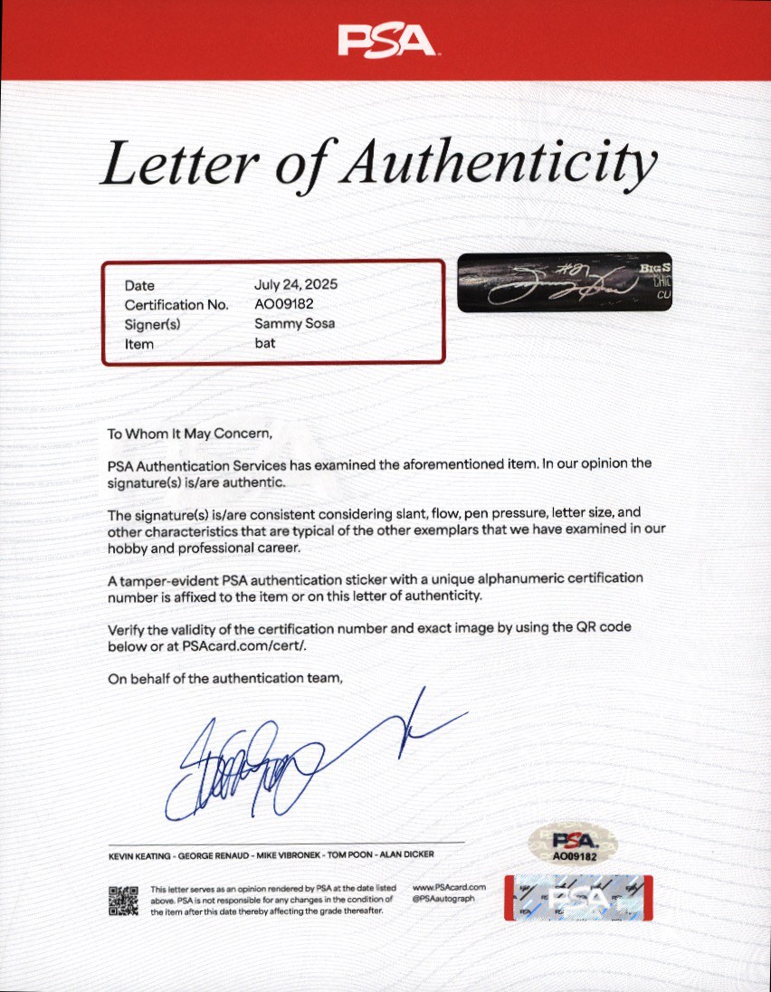 Lot # 606: 1995 Sammy Sosa Chicago Cubs Signed Game Used Bat (PSA GU 8)