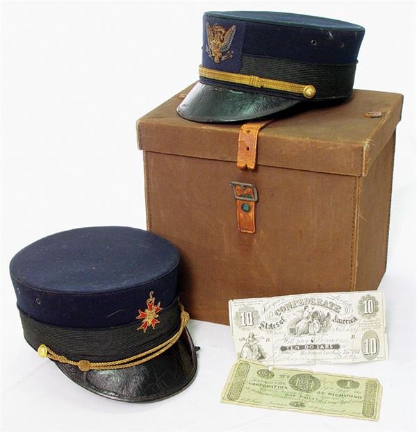Two navy military caps, manufactured by Banta of New York, worn for a Civil War Reunion. These caps were made for Fred Charles Barger (label printed with “F.C. Barger” on the inside of each hat). A Civil War hero, Barger enlisted in New York when he was 16 years old and was promoted quickly from private to First Lieutenant, then to Second Lieutenant. He was discharged in 1864 due to an injured right hand at the Battle of Fredericksburg (1862) from a piece of shrapnel. His hand was amputated on the field of battle. This Civil War hero went on to live a prosperous life, founding F.C. Barger & Co. in 1880, and later being selected as the president of the New York Mercantile Exchange (1900-1901). He was also the Merc’s treasurer for many years. Caps with embroidered designs on fronts – one is American Eagle, the other a star-like red emblem. Ornamental gold ropes adorn each visor. Short 2” black visors have been polished. Considerable use and wear is evident to the insides of both. Outer portion is EX. Included are three “Confederate States of America” notes, printed in Richmond, VA. In 1861. $1: Fair, $5: split in half, $10: VG.