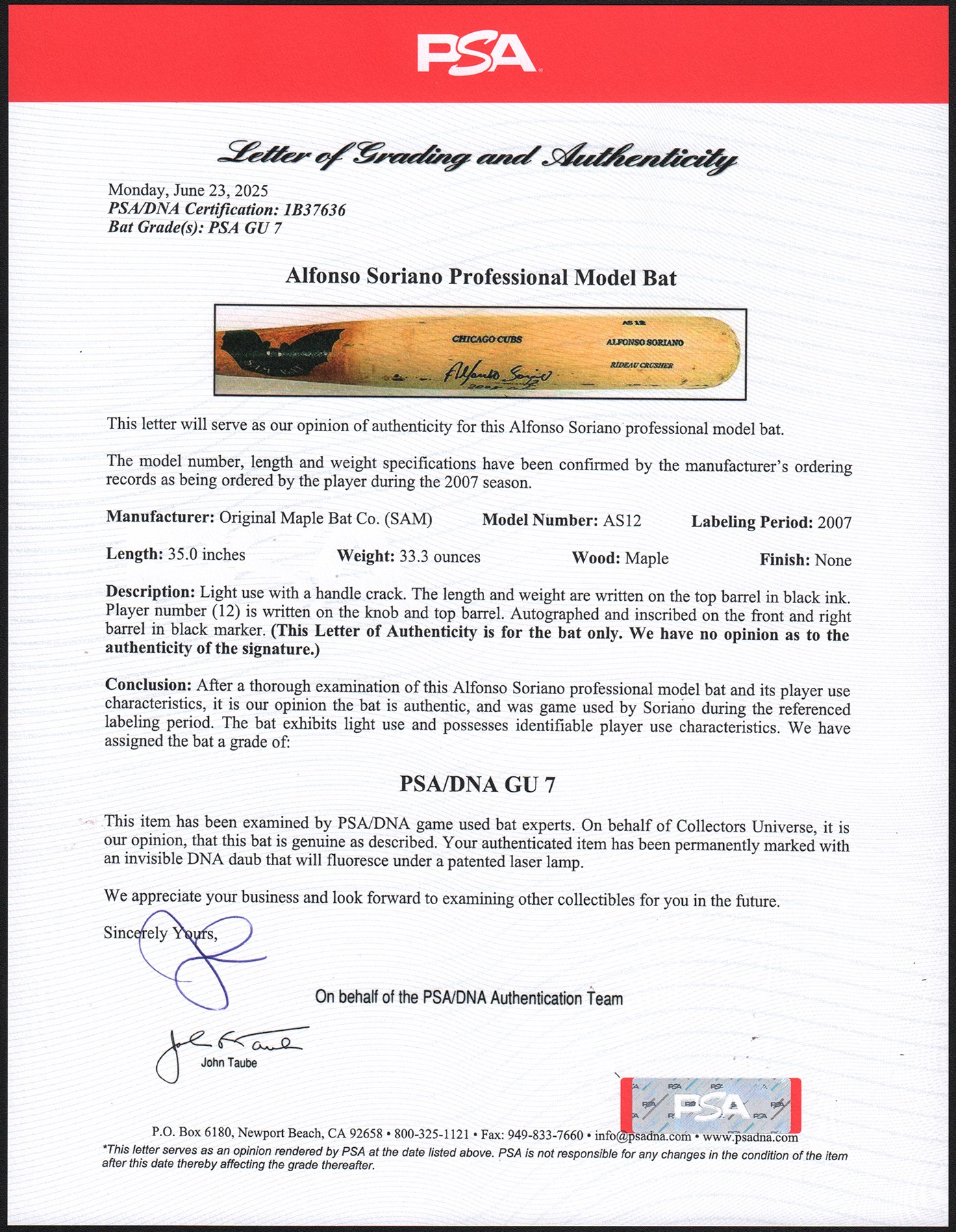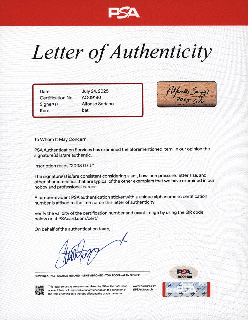 Lot # 628: 2007 Alfonso Soriano Signed Game Used Bat (PSA GU 7) (PSA)