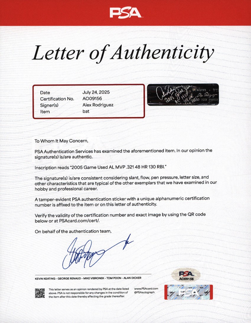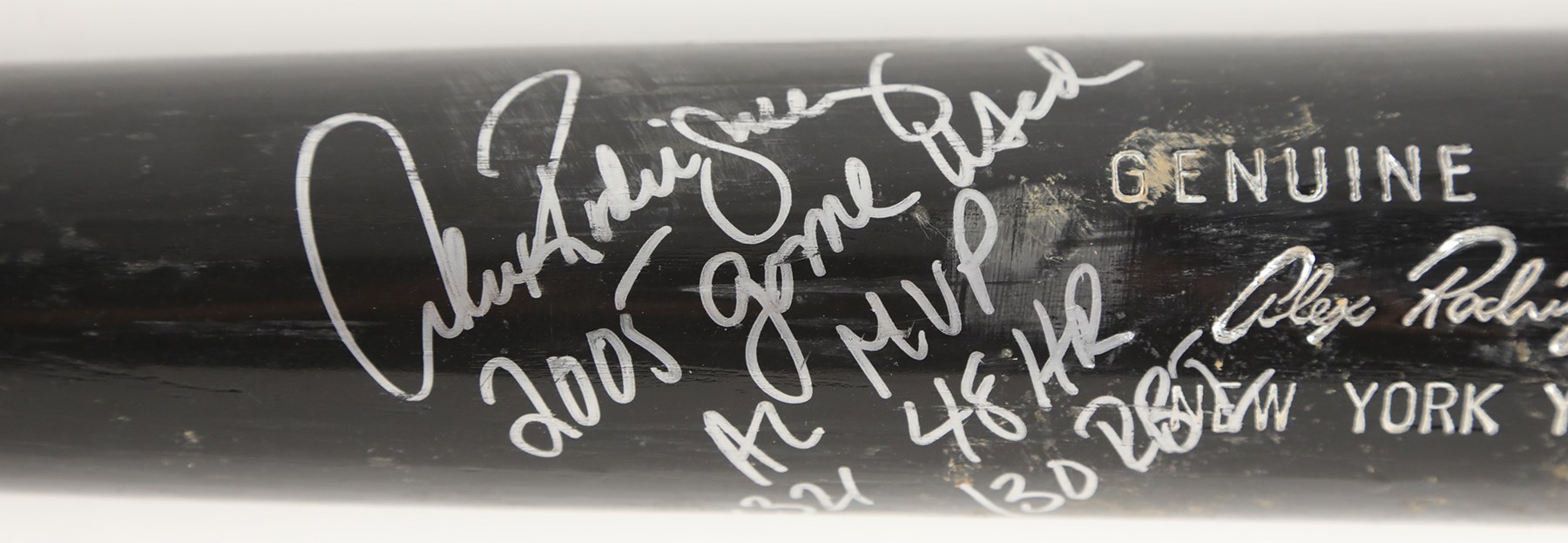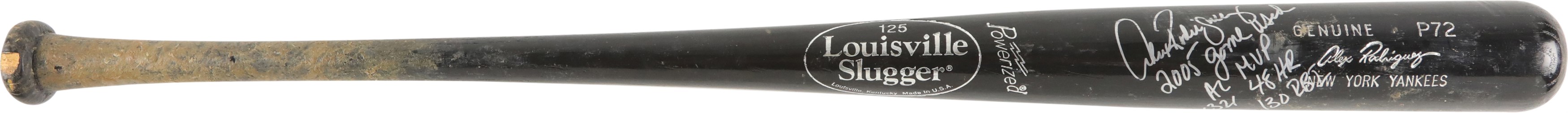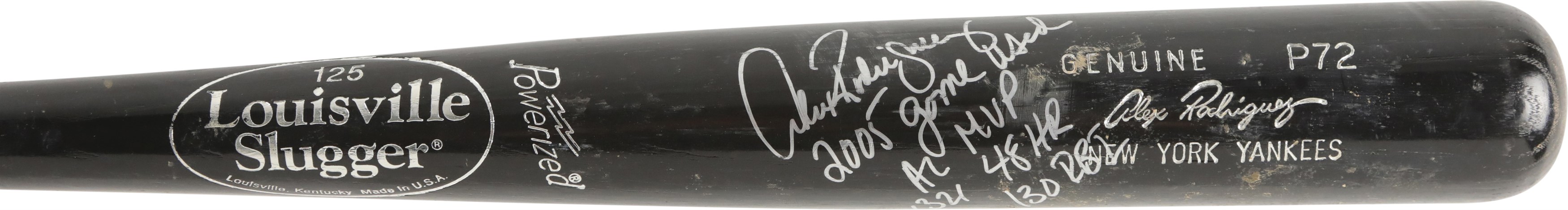 2005 Alex Rodriguez New York Yankees signed and inscribed game used bat. Louisville Slugger model P72 ash bat has natural handle with black barrel, measures 34.0" and weighs 30.7 ounces. Bat is uncracked and outstanding use is displayed with a small chip to the knob, glue residue or evidence of tape removal on the handle, and scattered ball impressions and wear throughout the barrel. A faded number that looks to be "31.6" (possibly the bat weight at order) is written on the knob in silver, and it is autographed between barrel stamp and trademark in solid 8/10 silver Sharpie; written below is "2005 Game Used - AL MVP - .321 - 48 HR - 130 RBI" also in silver. Indeed, A-Rod's numbers in '05 were dominant, earning the second of his three American League MVP awards and leading the Yankees to the AL East pennant. Comes with full PSA LOA, with the bat earning a perfect grade of PSA/DNA GU 10, along with a separate PSA LOA for the signature.