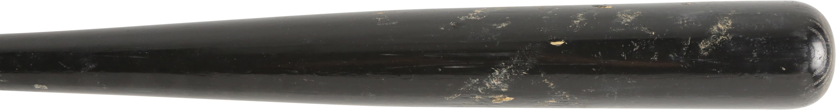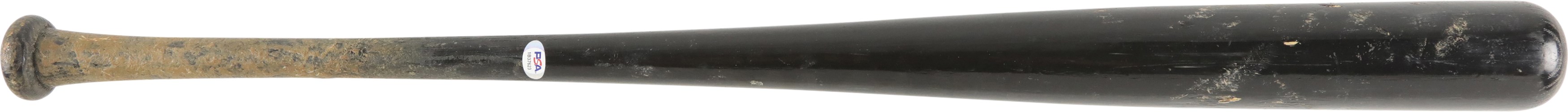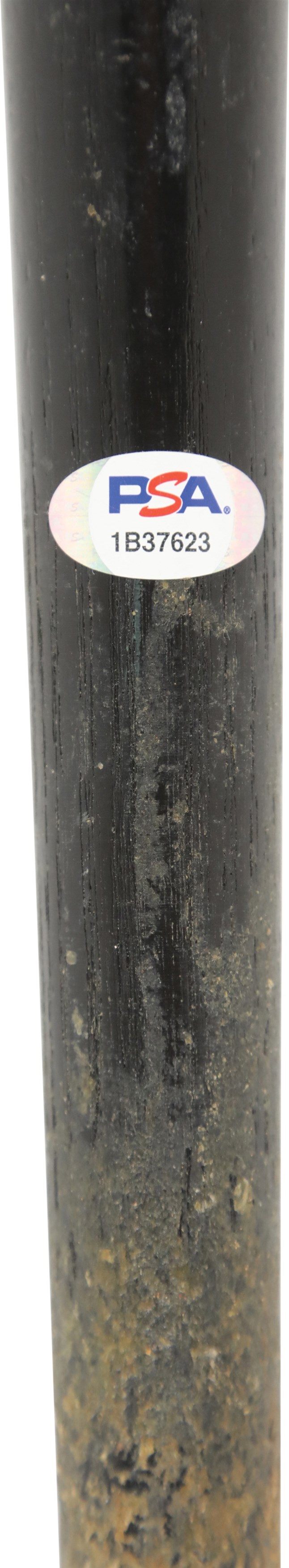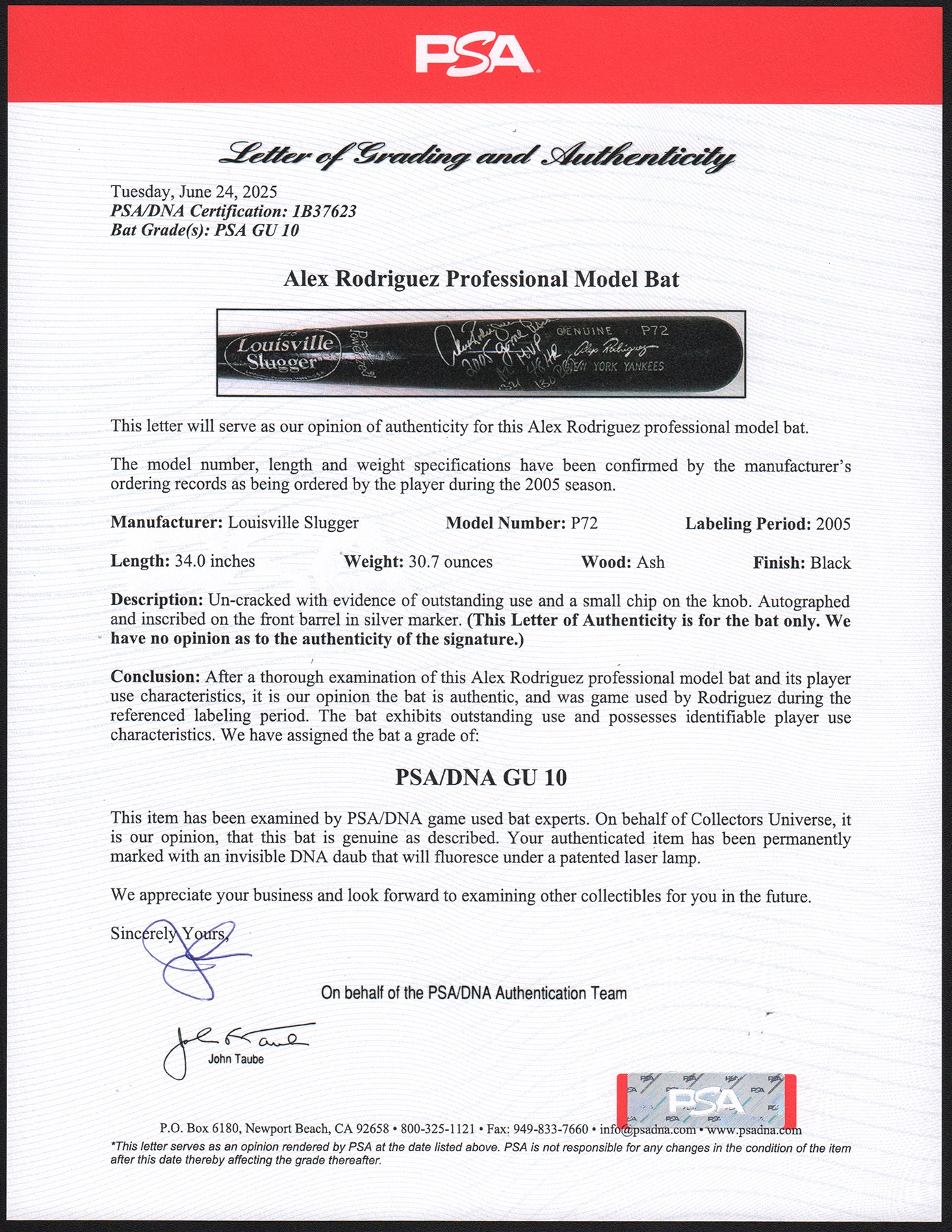 2005 Alex Rodriguez New York Yankees signed and inscribed game used bat. Louisville Slugger model P72 ash bat has natural handle with black barrel, measures 34.0" and weighs 30.7 ounces. Bat is uncracked and outstanding use is displayed with a small chip to the knob, glue residue or evidence of tape removal on the handle, and scattered ball impressions and wear throughout the barrel. A faded number that looks to be "31.6" (possibly the bat weight at order) is written on the knob in silver, and it is autographed between barrel stamp and trademark in solid 8/10 silver Sharpie; written below is "2005 Game Used - AL MVP - .321 - 48 HR - 130 RBI" also in silver. Indeed, A-Rod's numbers in '05 were dominant, earning the second of his three American League MVP awards and leading the Yankees to the AL East pennant. Comes with full PSA LOA, with the bat earning a perfect grade of PSA/DNA GU 10, along with a separate PSA LOA for the signature.