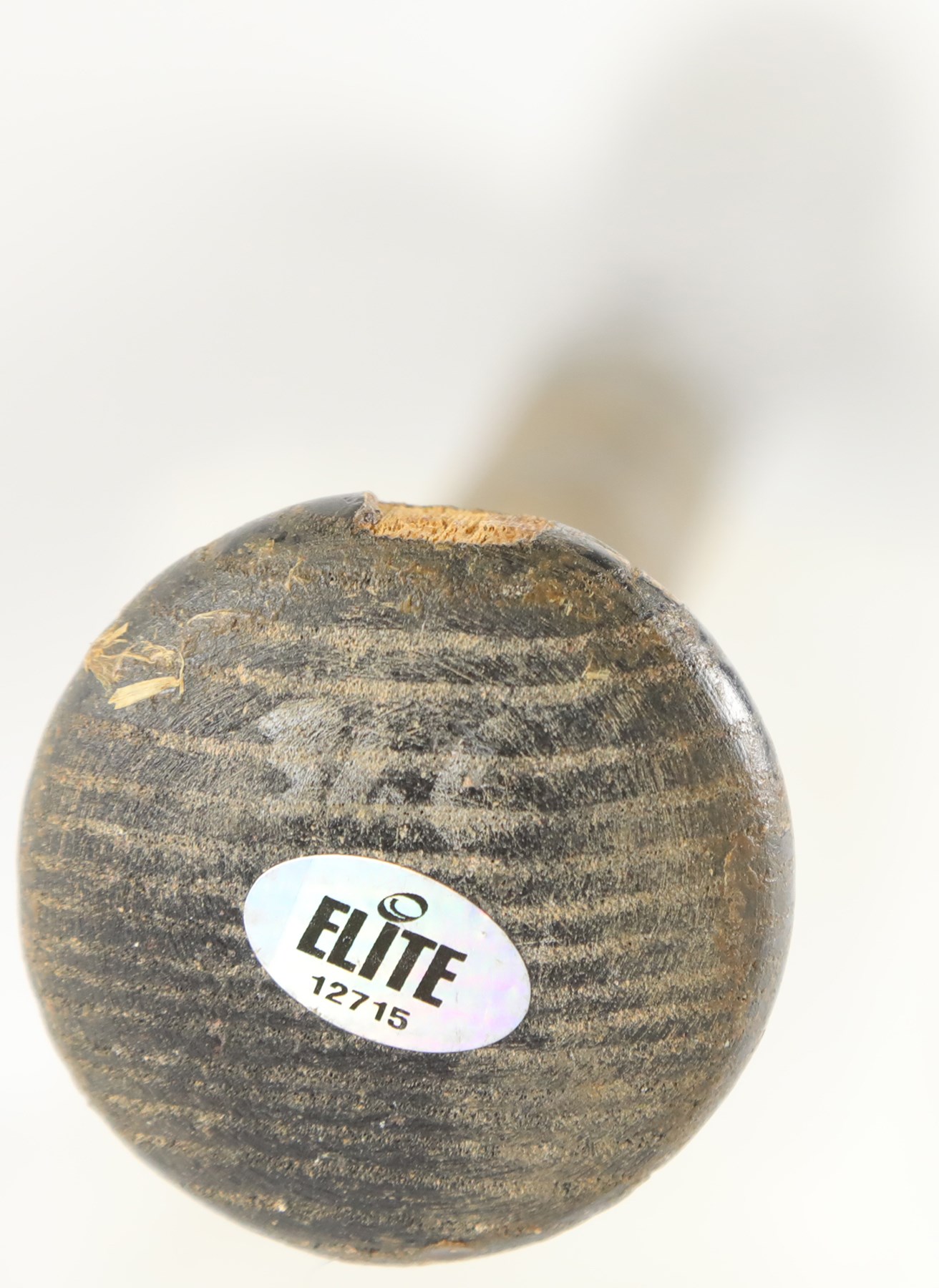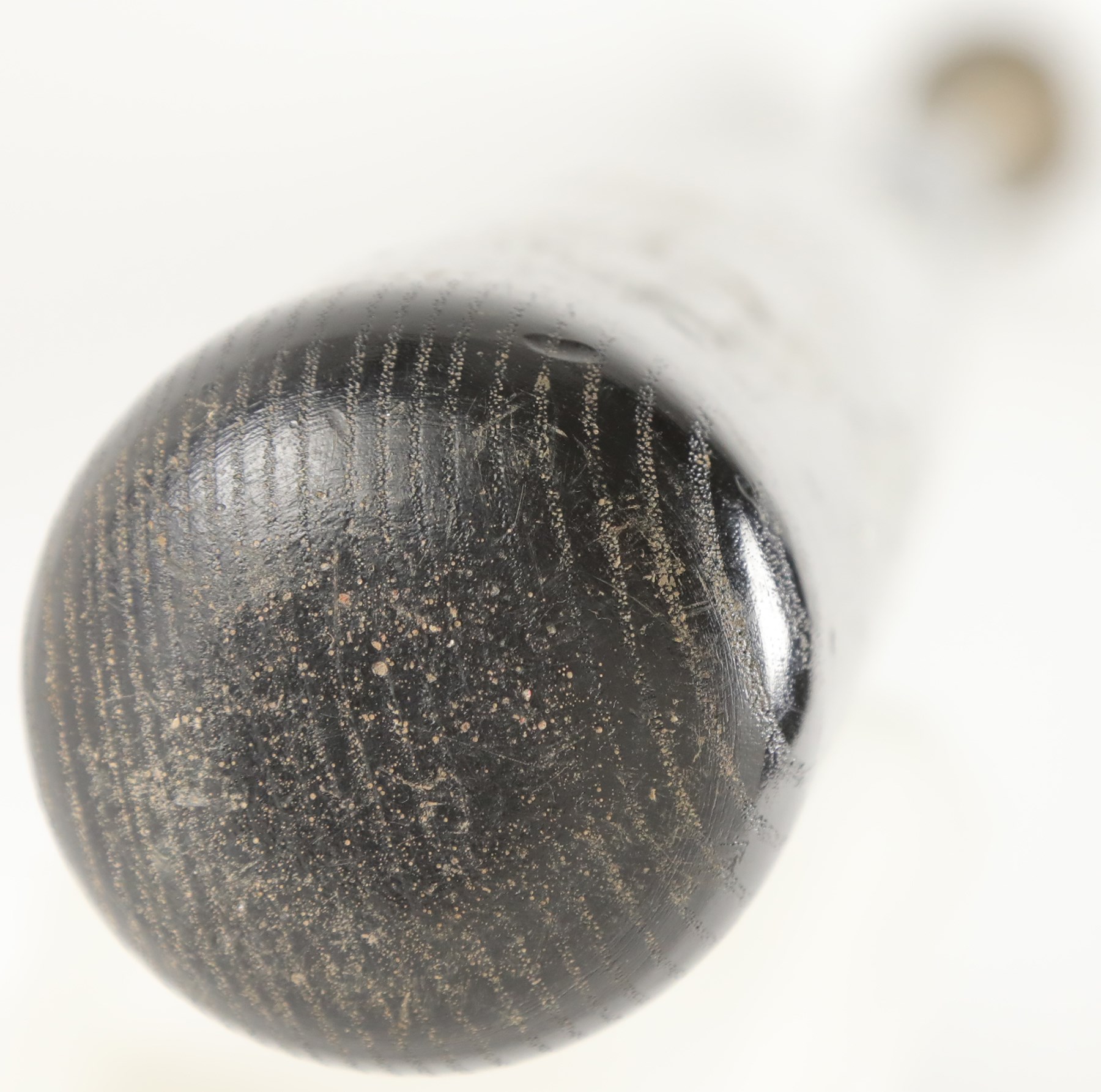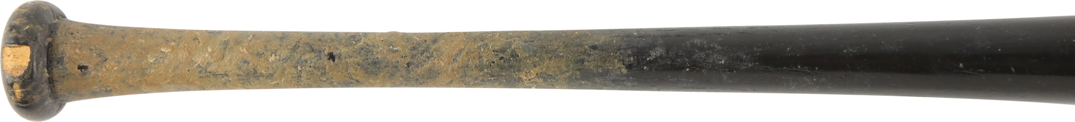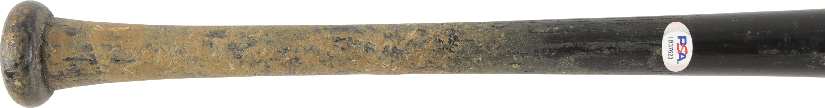 2005 Alex Rodriguez New York Yankees signed and inscribed game used bat. Louisville Slugger model P72 ash bat has natural handle with black barrel, measures 34.0" and weighs 30.7 ounces. Bat is uncracked and outstanding use is displayed with a small chip to the knob, glue residue or evidence of tape removal on the handle, and scattered ball impressions and wear throughout the barrel. A faded number that looks to be "31.6" (possibly the bat weight at order) is written on the knob in silver, and it is autographed between barrel stamp and trademark in solid 8/10 silver Sharpie; written below is "2005 Game Used - AL MVP - .321 - 48 HR - 130 RBI" also in silver. Indeed, A-Rod's numbers in '05 were dominant, earning the second of his three American League MVP awards and leading the Yankees to the AL East pennant. Comes with full PSA LOA, with the bat earning a perfect grade of PSA/DNA GU 10, along with a separate PSA LOA for the signature.