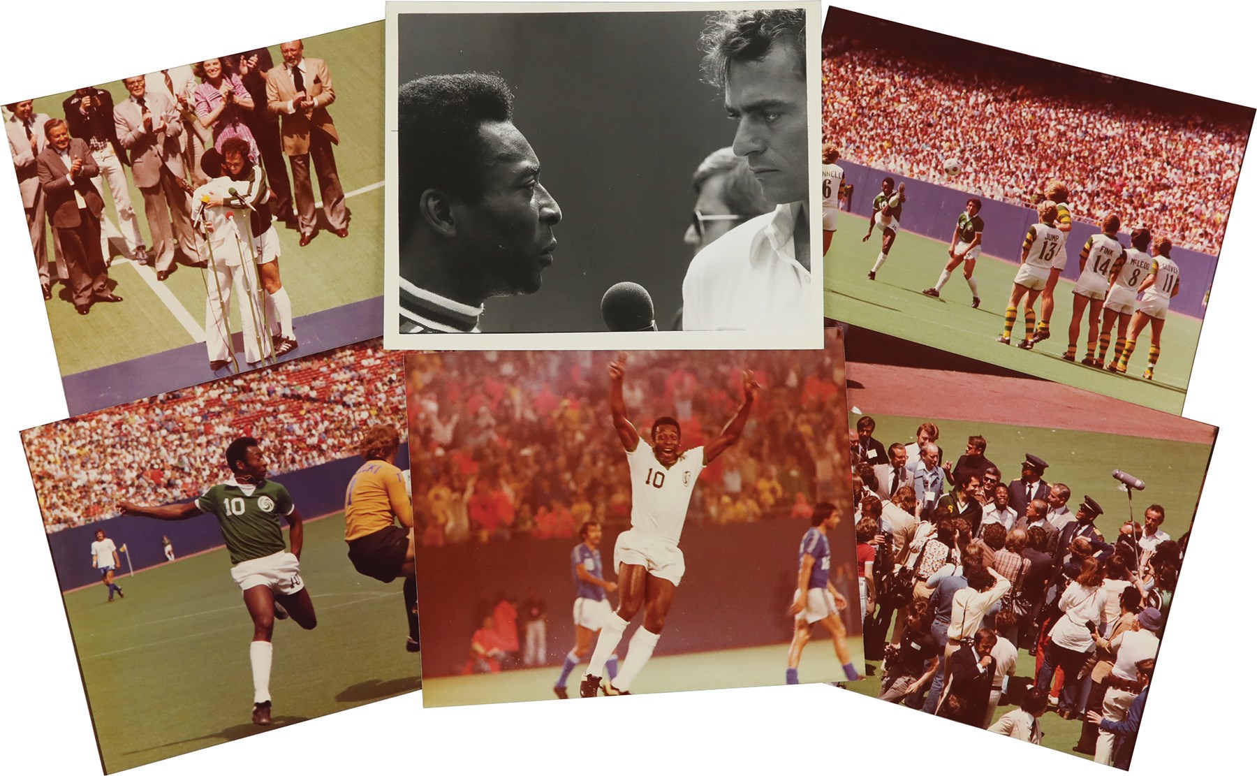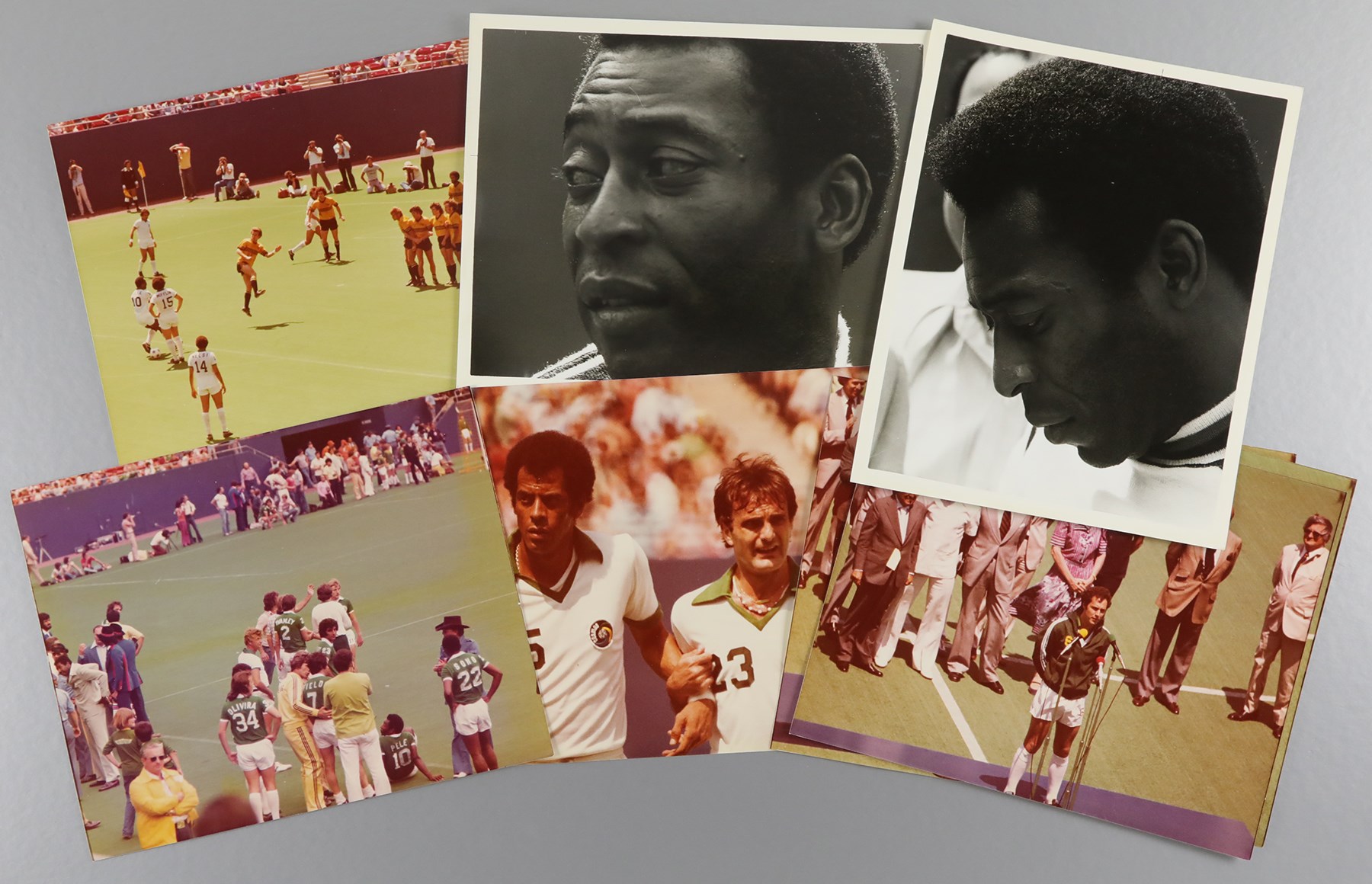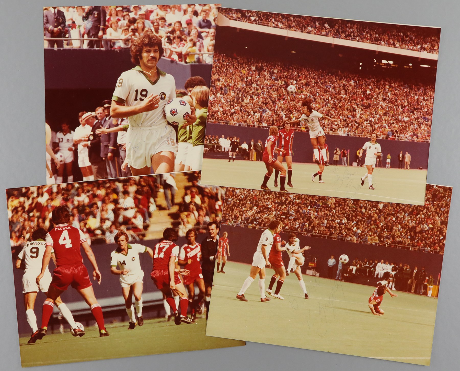 1970s New York Cosmos photo collection with Pele and Franz Beckenbauer. Lot of 19 8x10" photos from the days when Pele and the Cosmos helped take soccer to a popularity never seen before in the United States. Pele played for the Cosmos from 1975-77. Beckenbauer played for the Cosmos from 1977-80, and then again in 1983. There are 16 color photos, and three black and white photos of Pele in included in the lot. Four of the photos in the lot are signed and inscribed "To John," by the following players: Vladislav Bogicevic, Terry Garbett, Santiago Formoso, and an unknown player. The photos are in very good condition overall.