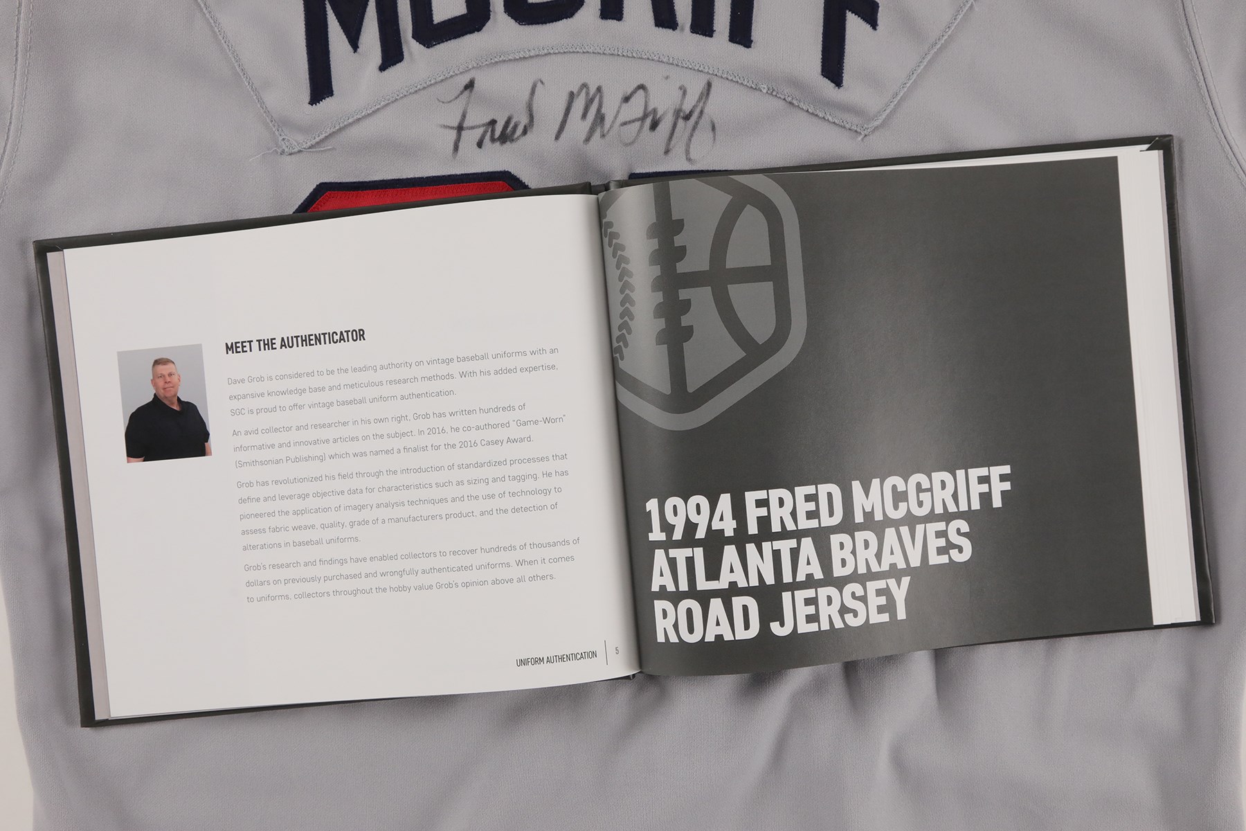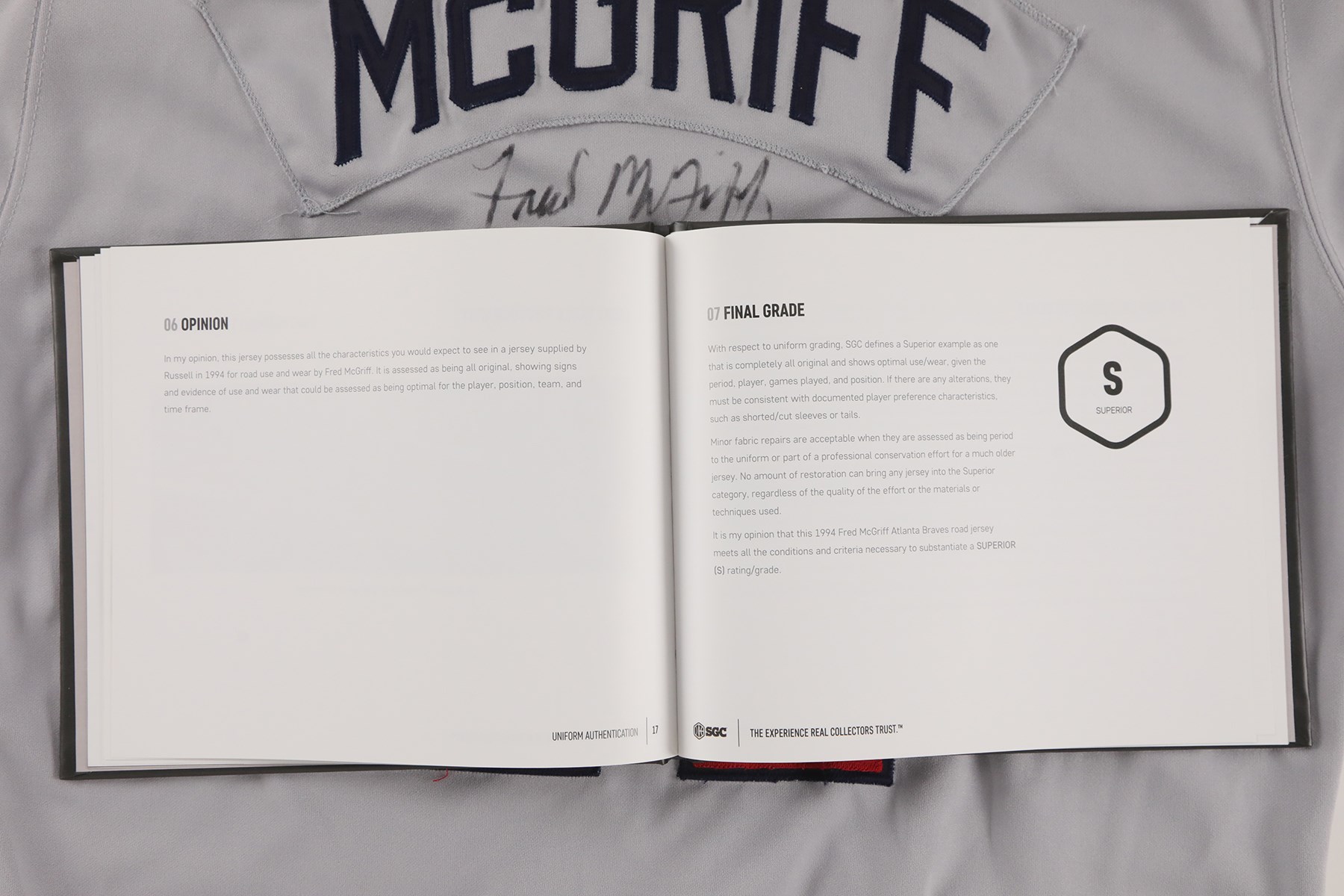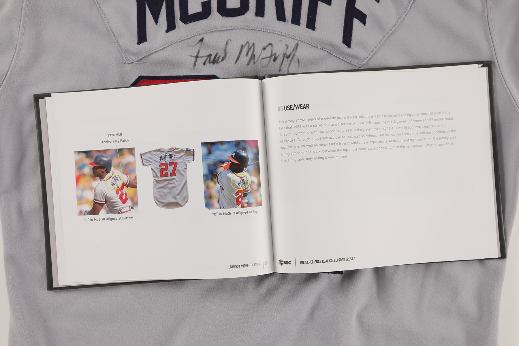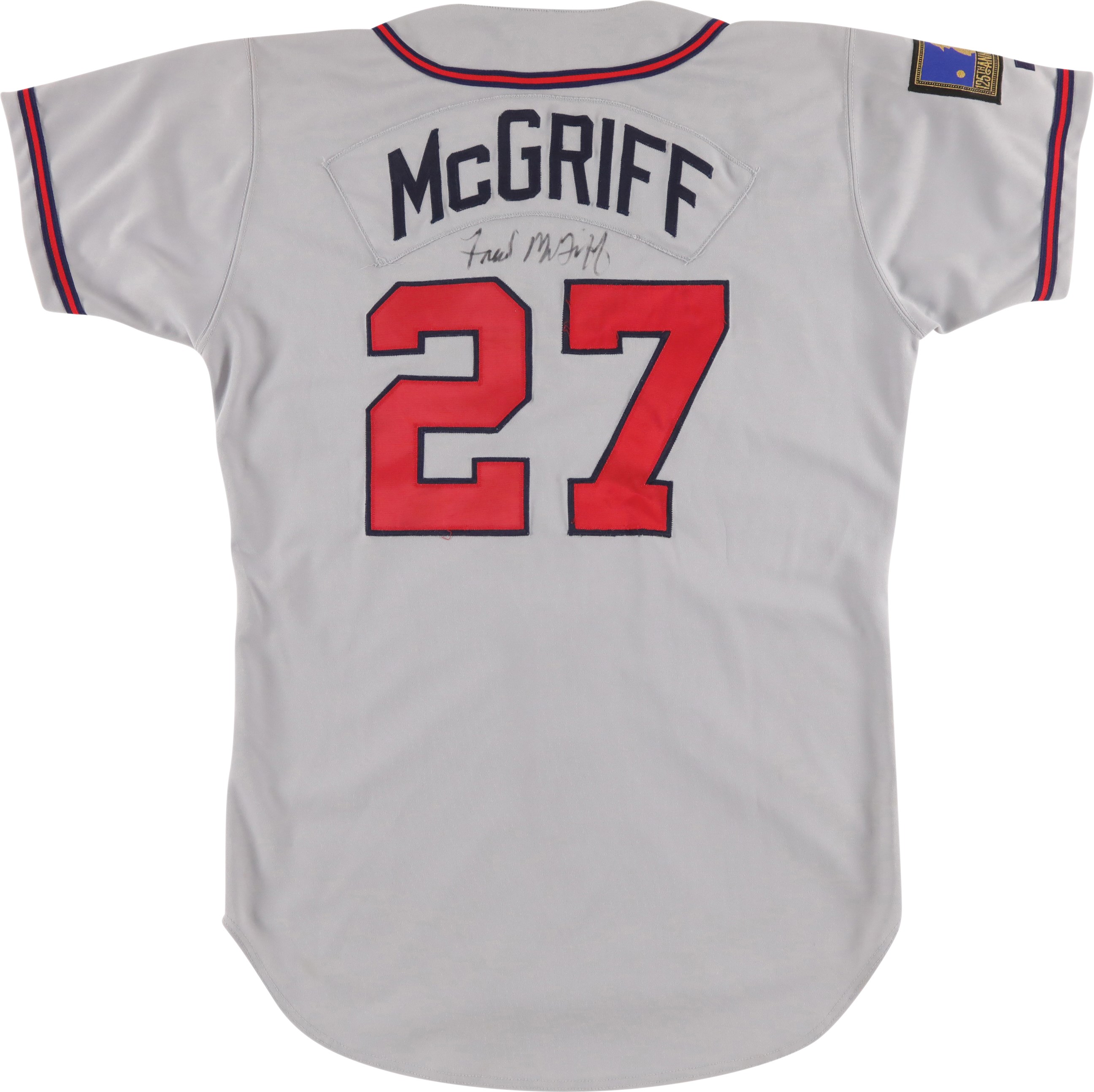 1994 Fred McGriff Atlanta Braves game worn autographed jersey. A Russell Athletic tag is sewn to the the front left tail of the jersey, along with a "2" EXTRA LENGTH" tag. "Atlanta" is sewn across the front of the jersey, with the Braves tomahawk logo below. The MLB 125th Anniversary patch is sewn to the left shoulder, and the Russell Athletic logo is embroidered below the patch. The back of the jersey includes the "McGRIFF" nameplate at the top, and "27" below. McGriff signed the back of the jersey with a black Sharpie, in between the nameplate and number. The jersey shows heavy signs of wear. Included with the jersey is a hardbound 24-page book, published by SGC, that provides full authentication details.