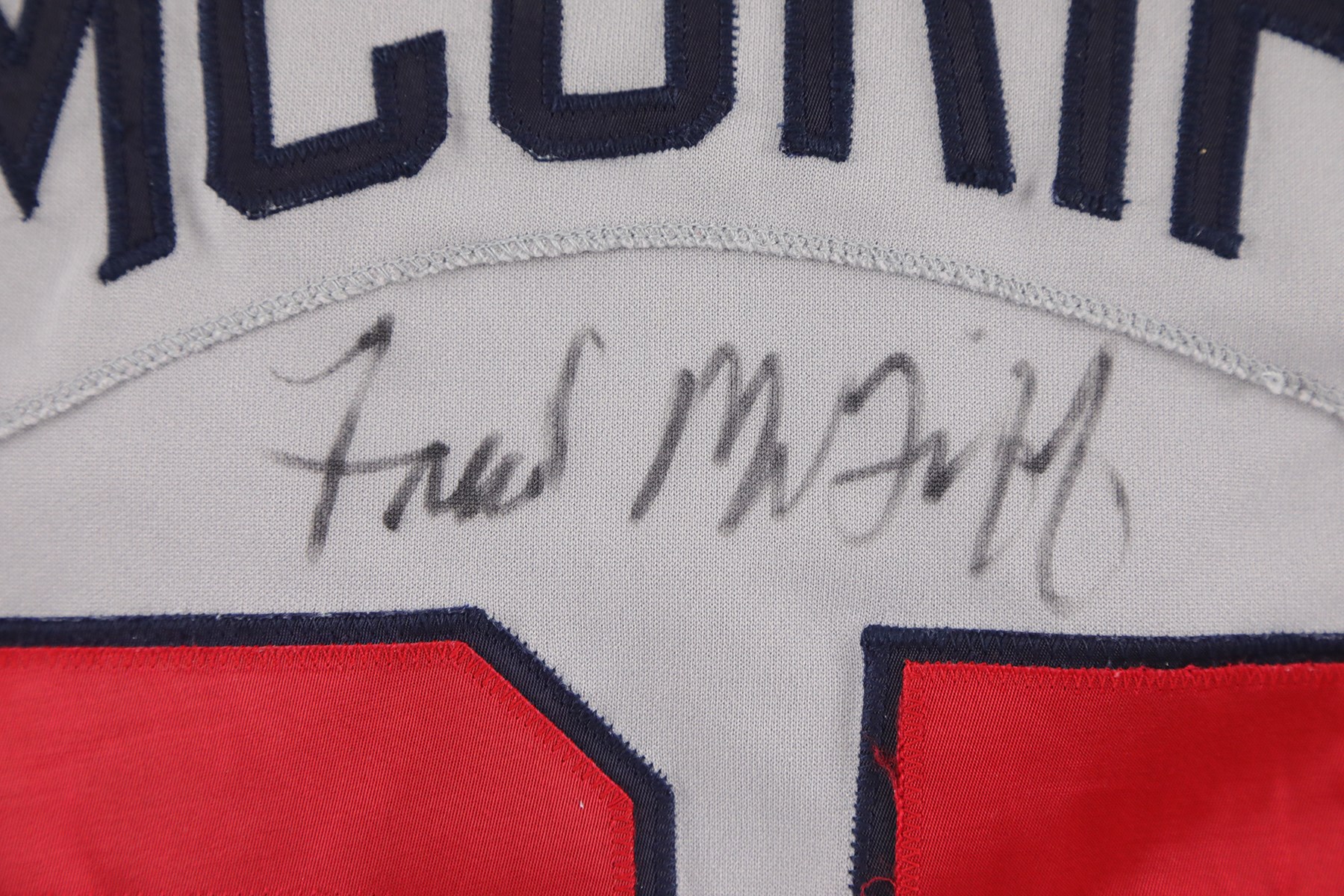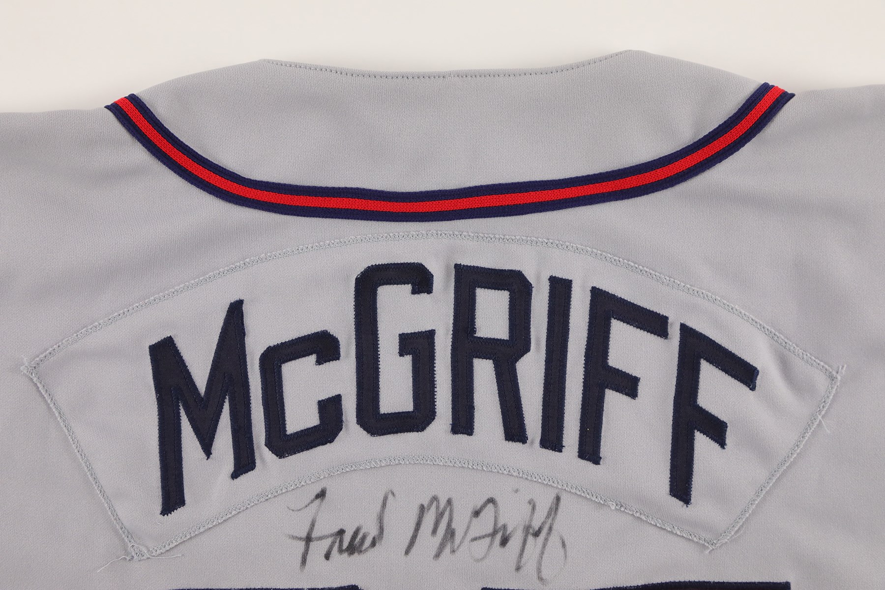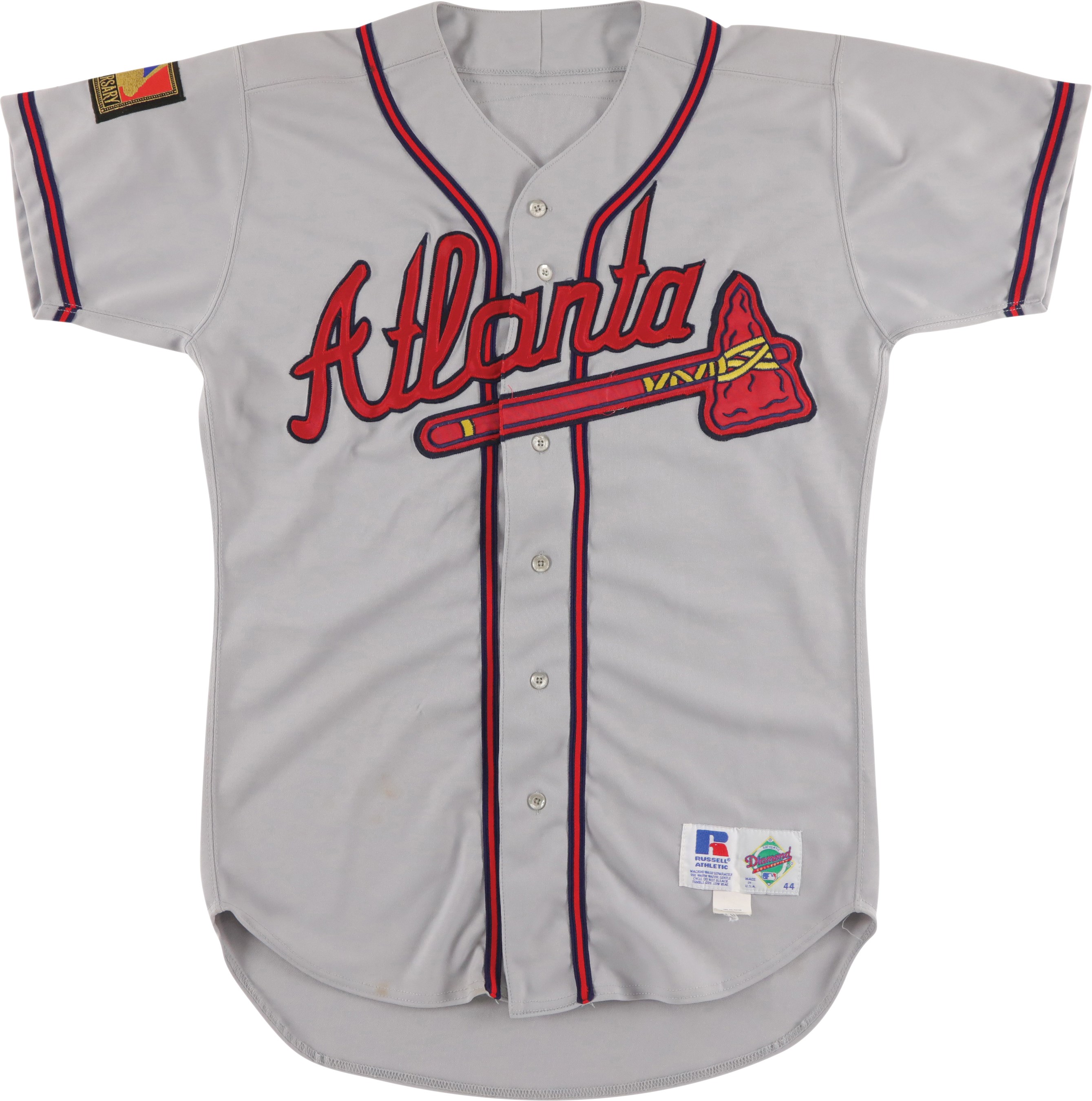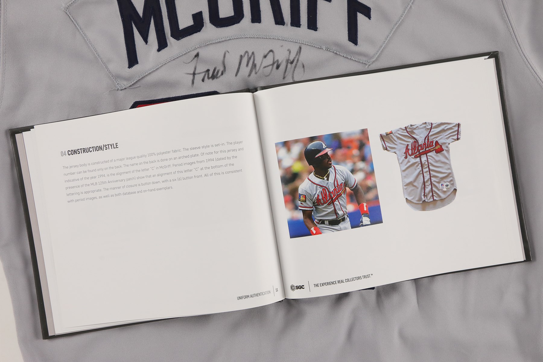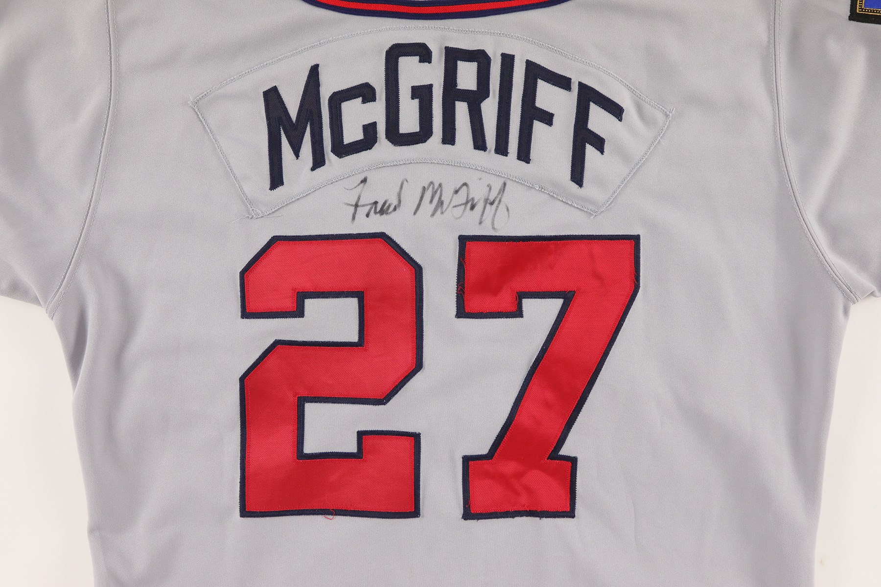 1994 Fred McGriff Atlanta Braves game worn autographed jersey. A Russell Athletic tag is sewn to the the front left tail of the jersey, along with a "2" EXTRA LENGTH" tag. "Atlanta" is sewn across the front of the jersey, with the Braves tomahawk logo below. The MLB 125th Anniversary patch is sewn to the left shoulder, and the Russell Athletic logo is embroidered below the patch. The back of the jersey includes the "McGRIFF" nameplate at the top, and "27" below. McGriff signed the back of the jersey with a black Sharpie, in between the nameplate and number. The jersey shows heavy signs of wear. Included with the jersey is a hardbound 24-page book, published by SGC, that provides full authentication details.
