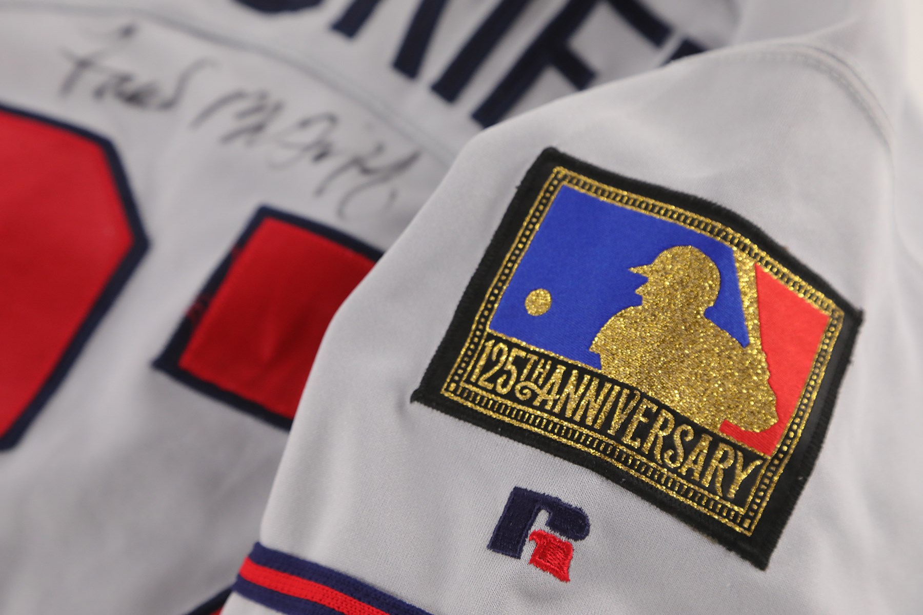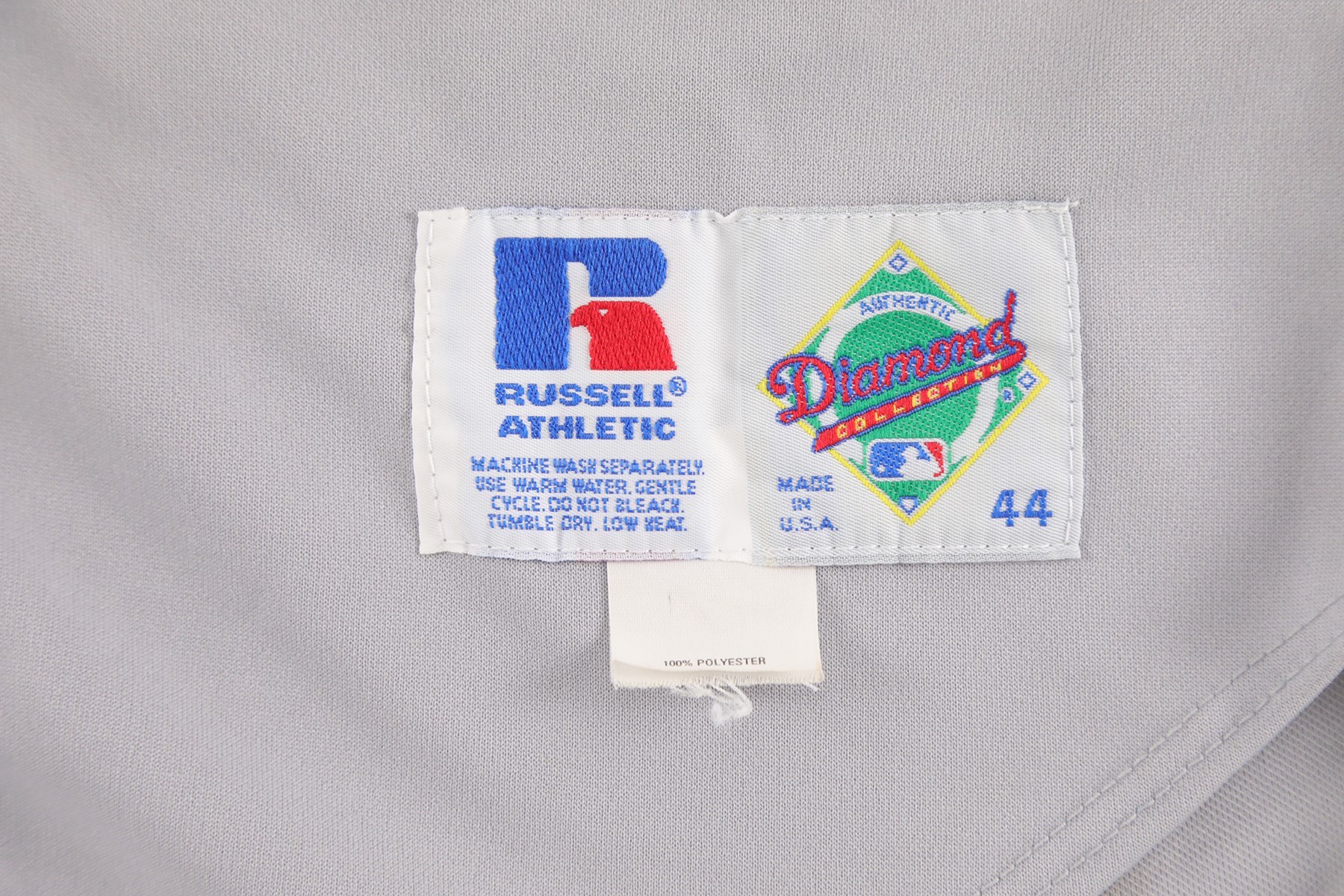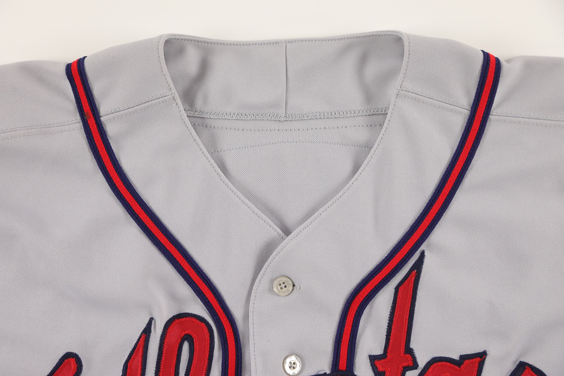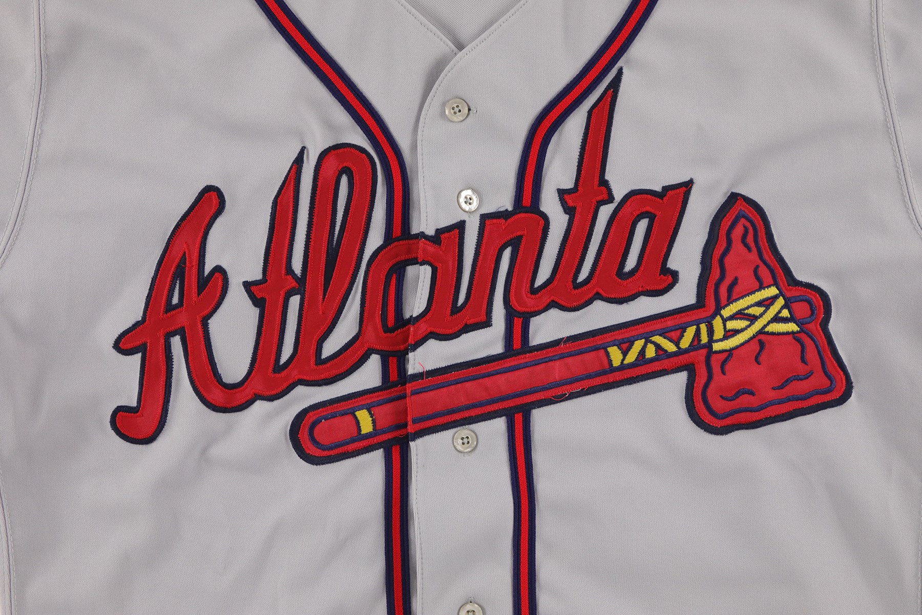 1994 Fred McGriff Atlanta Braves game worn autographed jersey. A Russell Athletic tag is sewn to the the front left tail of the jersey, along with a "2" EXTRA LENGTH" tag. "Atlanta" is sewn across the front of the jersey, with the Braves tomahawk logo below. The MLB 125th Anniversary patch is sewn to the left shoulder, and the Russell Athletic logo is embroidered below the patch. The back of the jersey includes the "McGRIFF" nameplate at the top, and "27" below. McGriff signed the back of the jersey with a black Sharpie, in between the nameplate and number. The jersey shows heavy signs of wear. Included with the jersey is a hardbound 24-page book, published by SGC, that provides full authentication details.