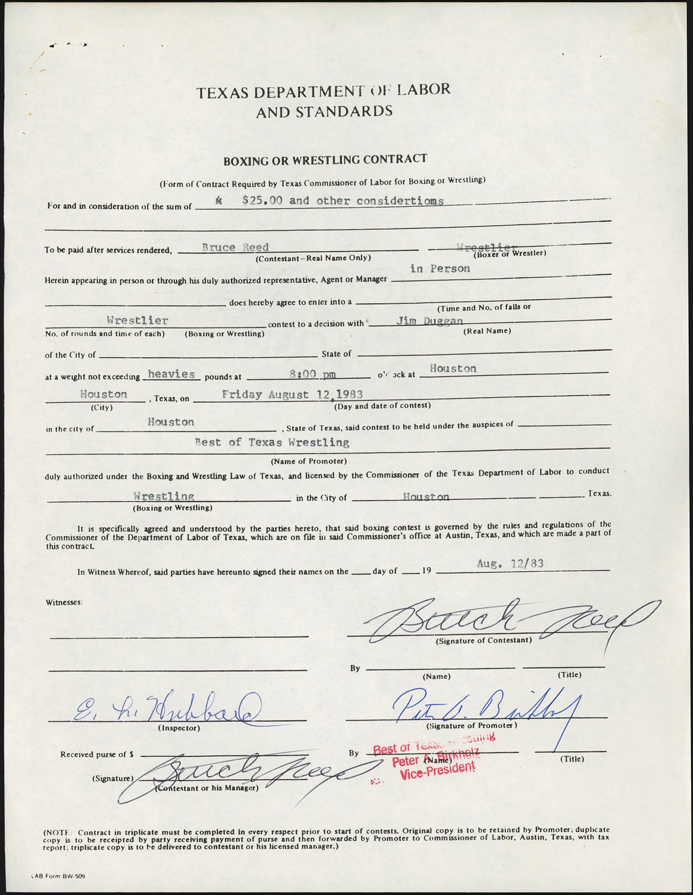 Presented is an August 12, 1983, "Hacksaw" Butch Reed signed wresting contract for Reed to meet Jim Duggan in a heavyweight match in Houston, Texas, on that same date. No specific place in Houston is specified in the contract. Bruce Reed was a successful black wrestler in the 1980s-90s. He has a listed height and weight of 6'2" and 262 lbs. Reed went by the nickname "Hacksaw," as did Duggan, who had the nickname before it was used by Reed. In the wrestling world, it was said that Duggan held bad feelings against Reed for adopting the "Hacksaw" nickname. Born as Bruce Reed, the wrestler was a football player at Central Missouri State, and he had a tryout with the Kansas City Chiefs. At first, Bruce Reed wrestled under his own first and last name. Then, he began to use "Butch Reed" as his wrestling moniker. Later, Reed began to add "Hacksaw" to his nickname. When the two "Hacksaws" met in the match described in the offered contract, Duggan attacked Reed before the match officially started. The wrestling turned to punching, and Duggan, known for his dirty tricks, fought dirty against Reed. Eventually, Duggan lost on a disqualification.