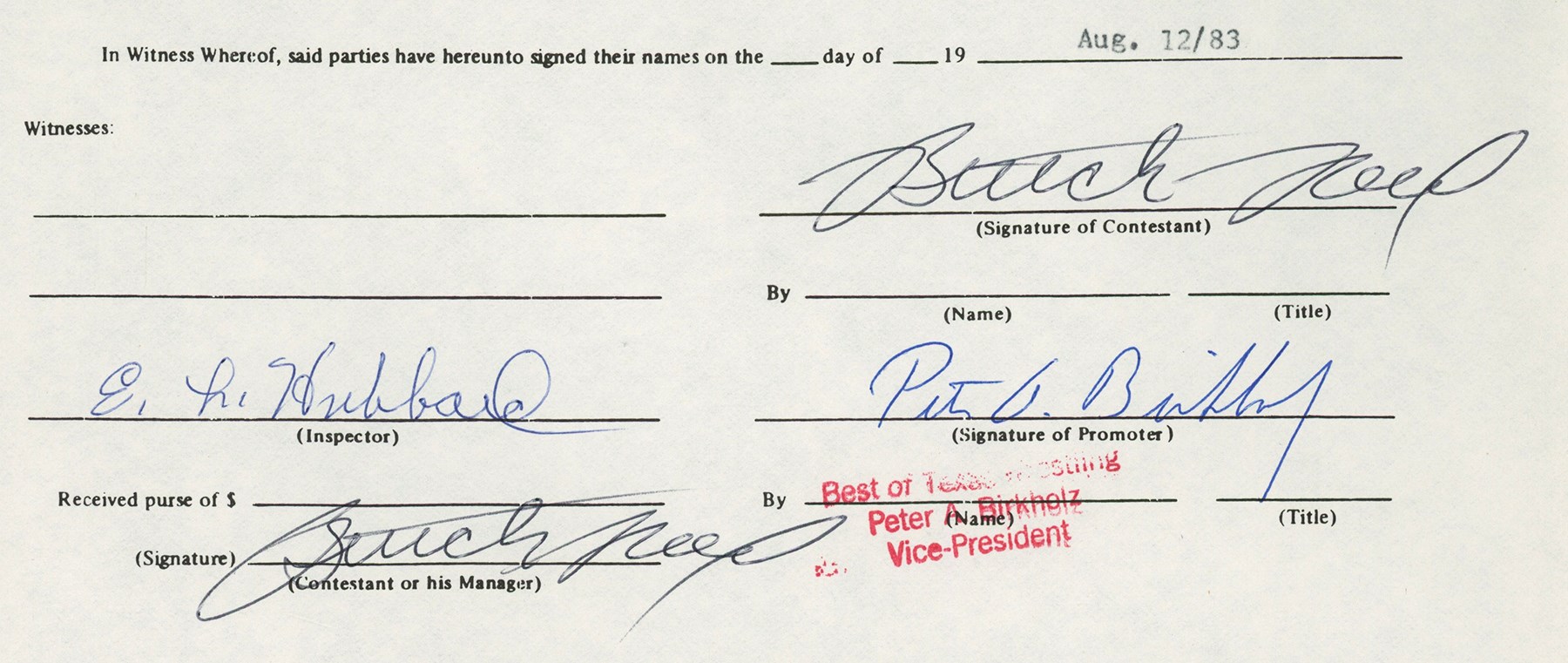The signed contract is a form contract on an 8.5x11" paper with the heading, "TEXAS DEPARTMENT OF LABOR AND STANDARDS/BOXING OR WRESTLING CONTRACT." The offered contract shows that Reed was officially given $25.00 in consideration for the bout. Reed signed the contract in neatly scripted, blue, ballpoint ink, and the contract was with Best of Texas Wrestling. Reed won a number of wrestling championships, some in tag-team wrestling. Reed was known for wrestling with Mid-South Wrestling and the WWF/WCW. He passed away in 2021. The contract is in EXCELLENT condition.